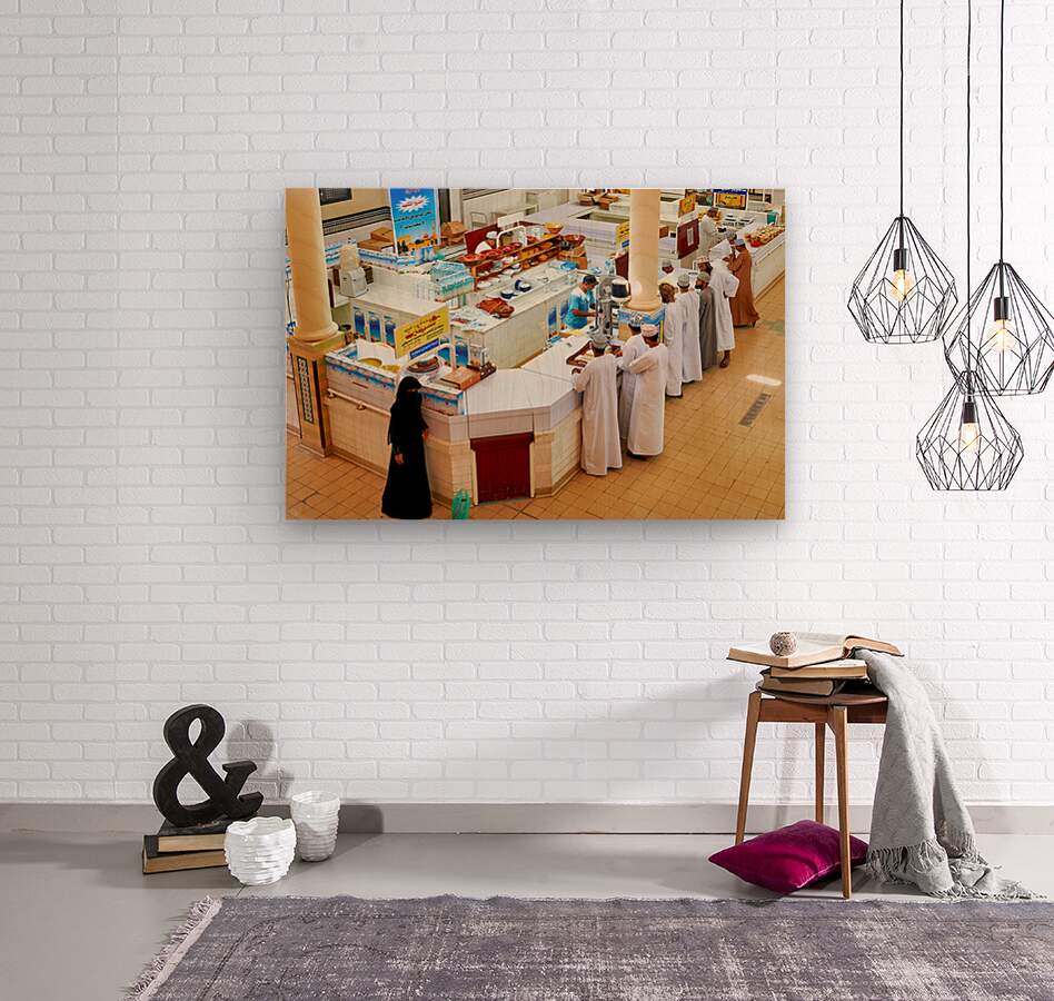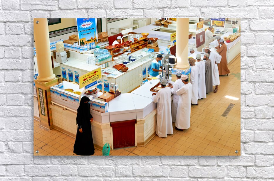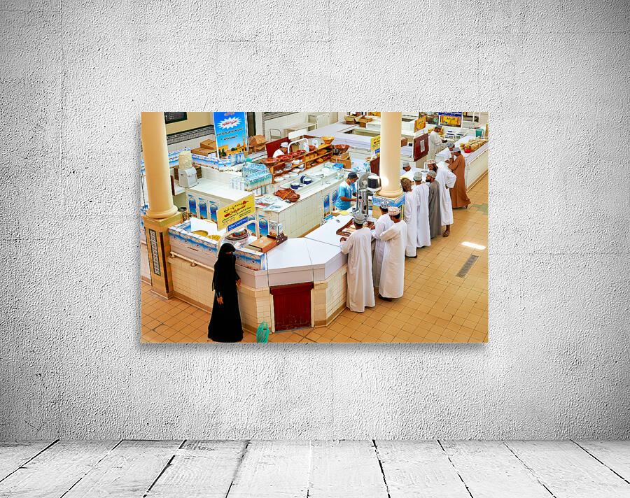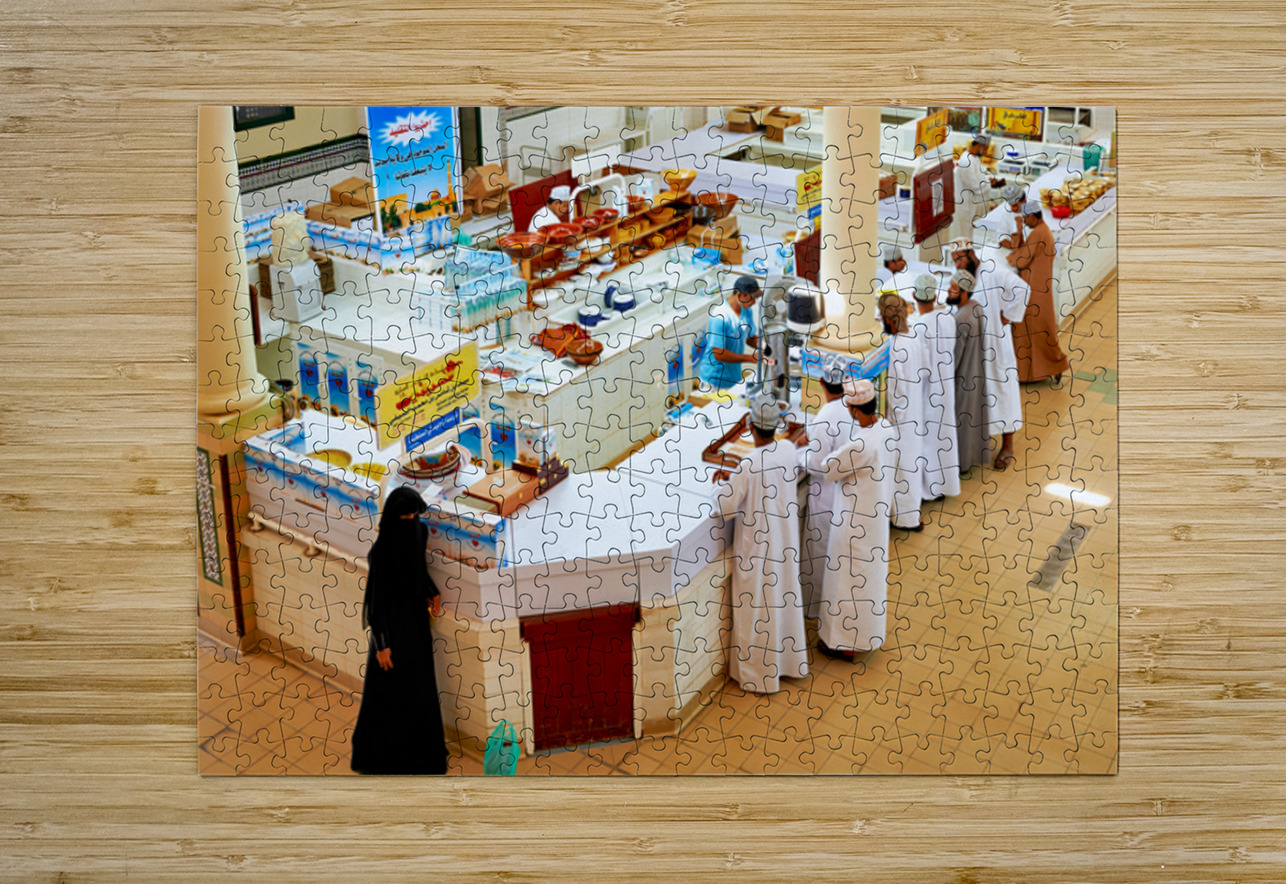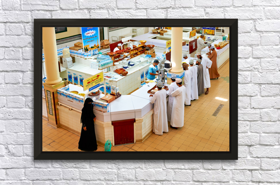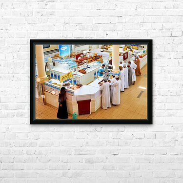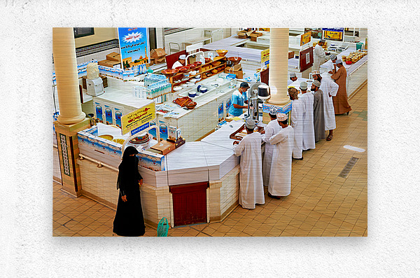 Locals visit the Nizwa market in Oman to buy goods and interact with vendors in an active setting. The scene shows stalls and shoppers.