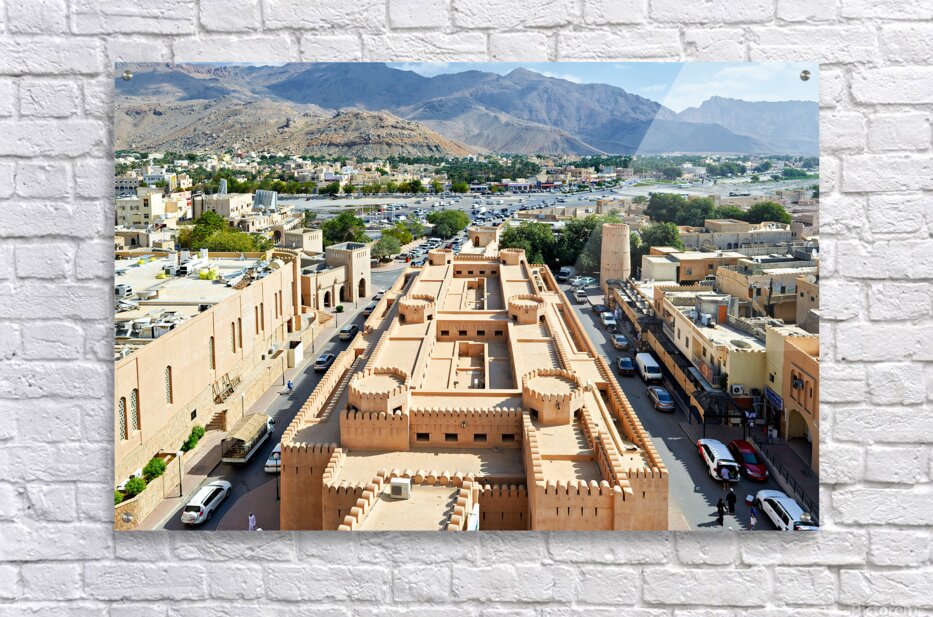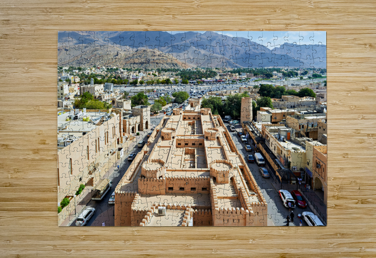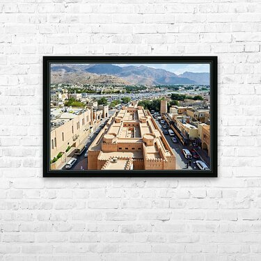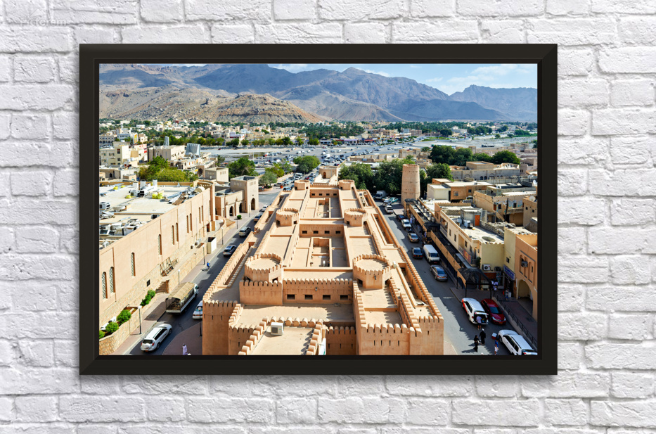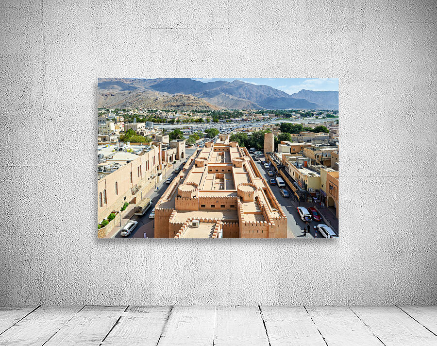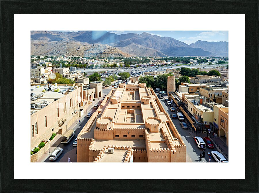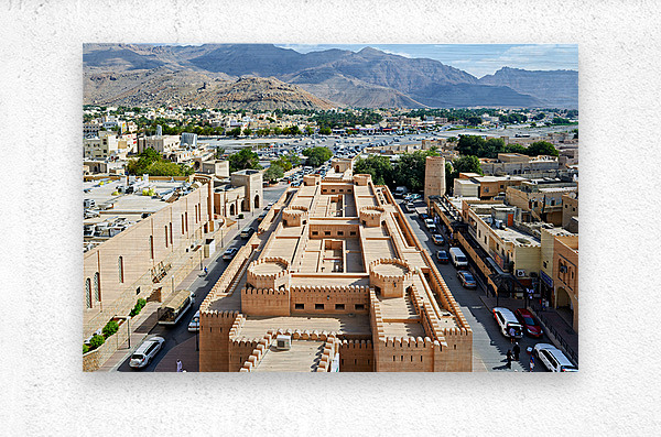 Nizwa has a mix of old buildings and busy streets with mountains in the background showing daily life and activity during the day.
