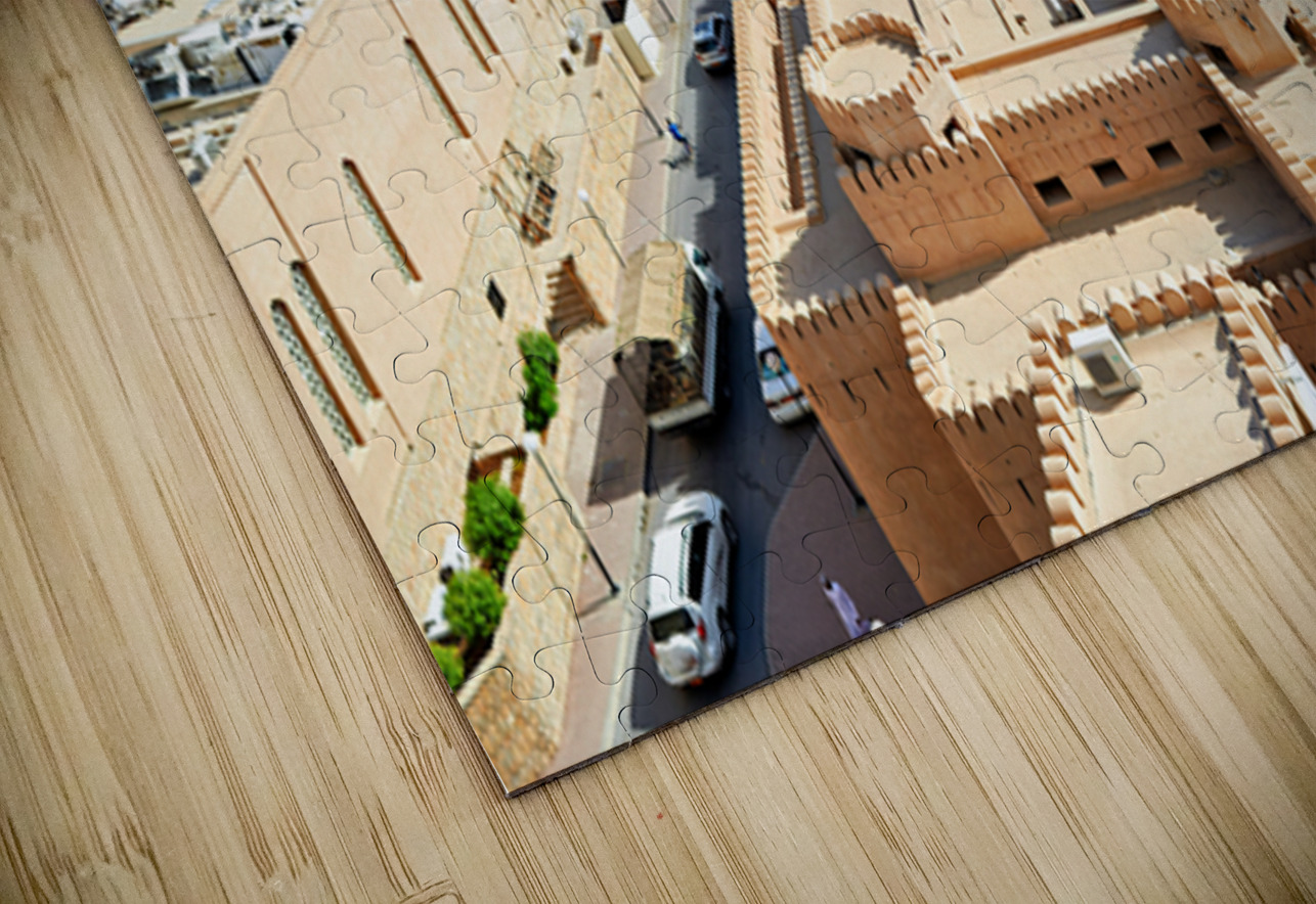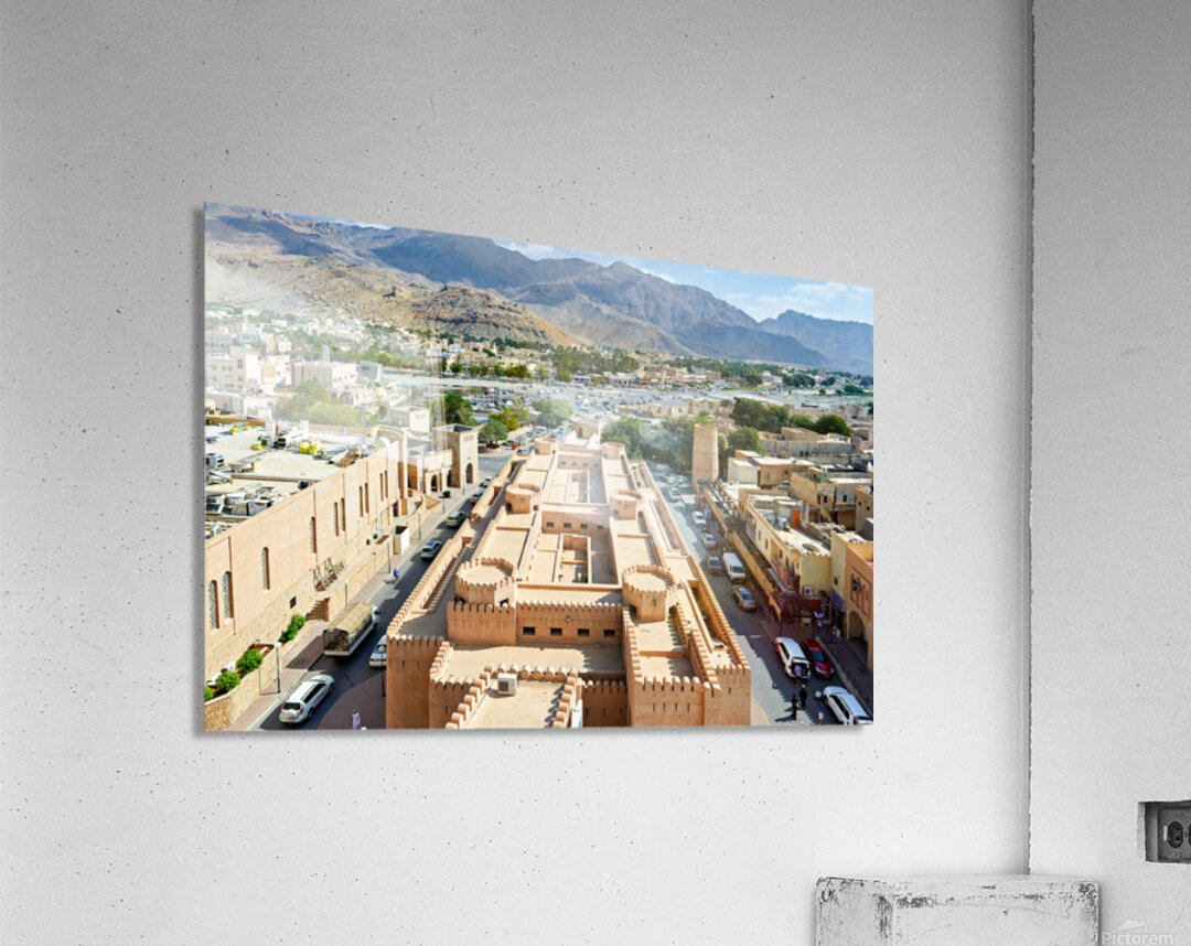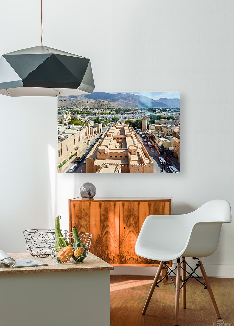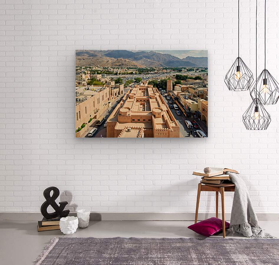 Nizwa has a mix of old buildings and busy streets with mountains in the background showing daily life and activity during the day.