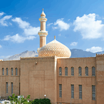 Nizwa Fort with its tall minaret and dome under a blue sky with white clouds. Mountains are visible in the background.