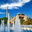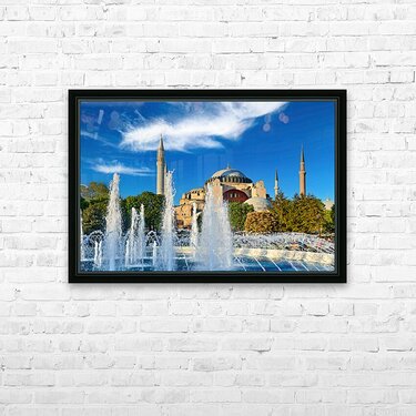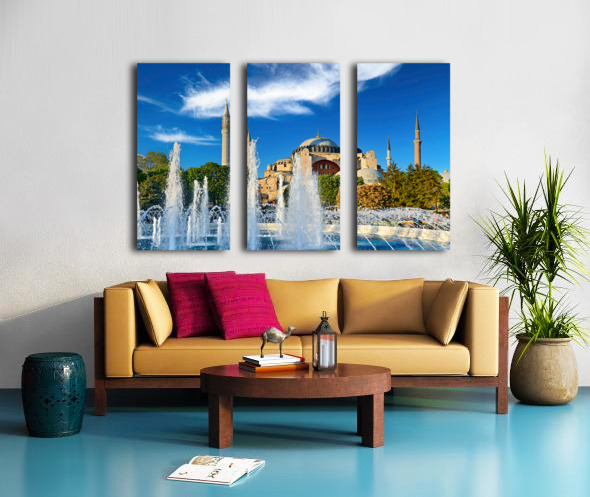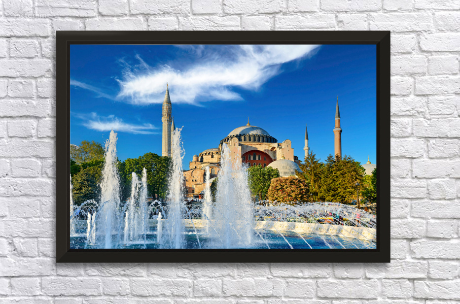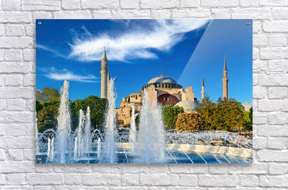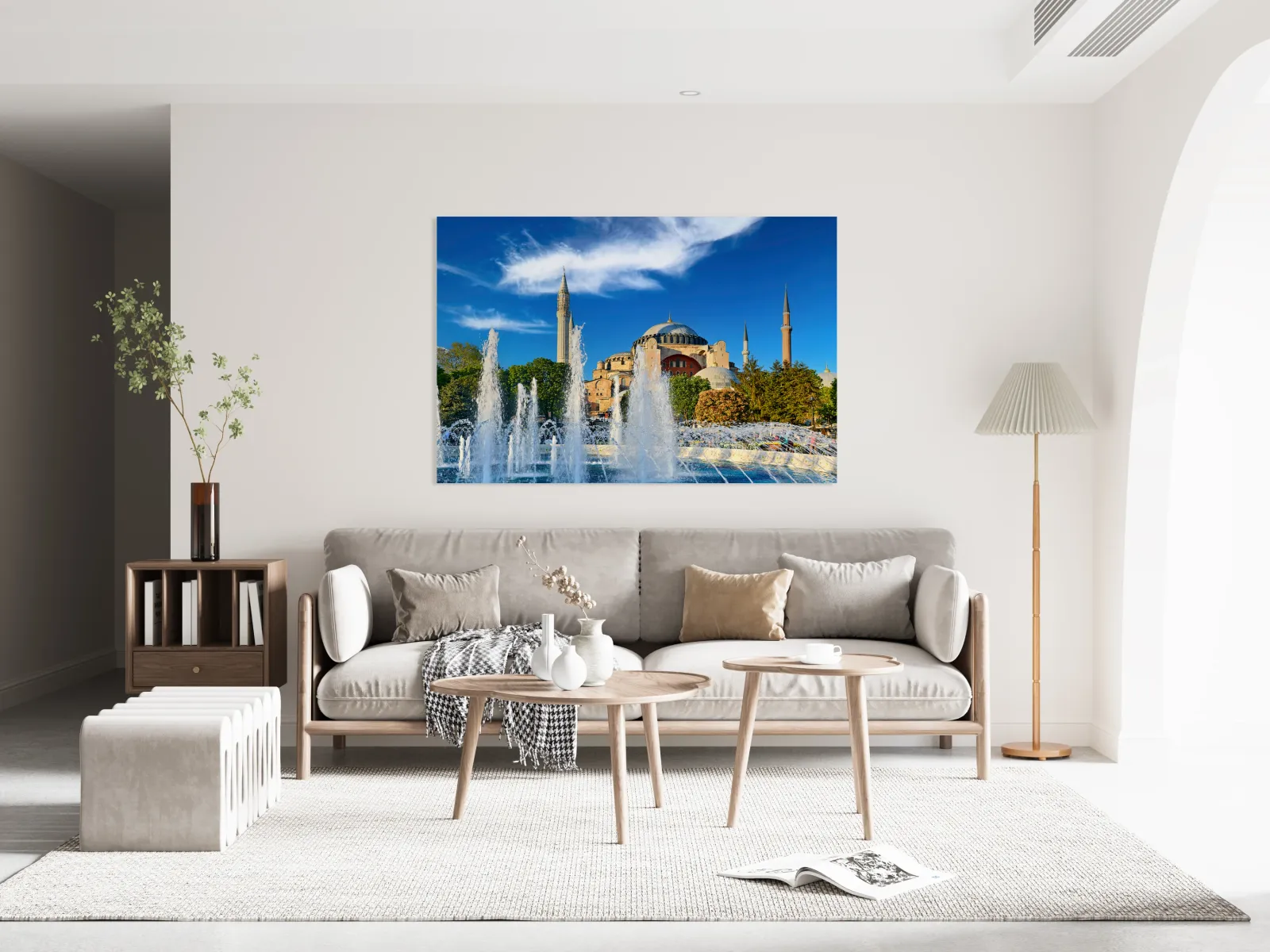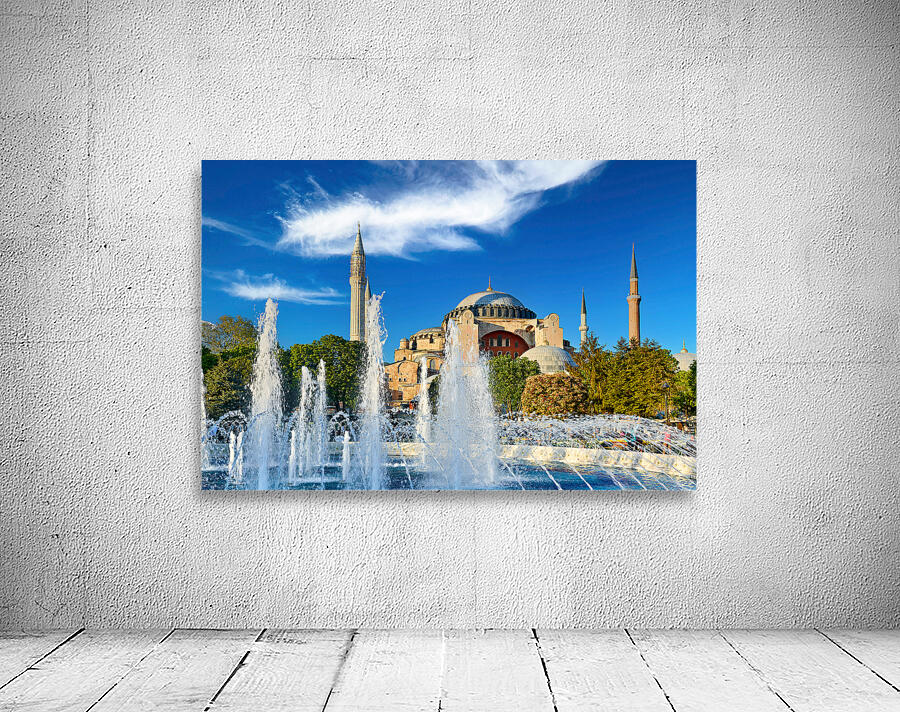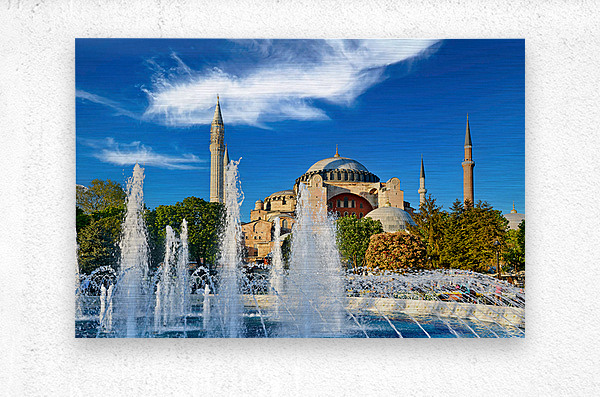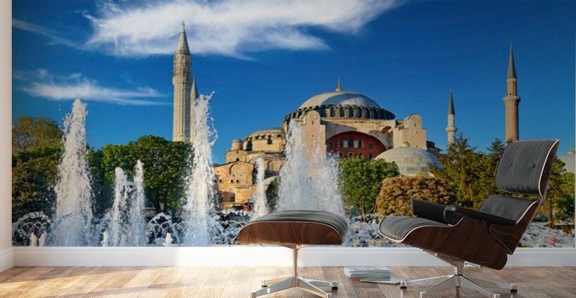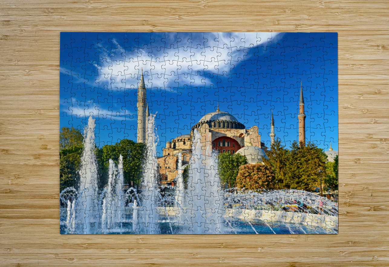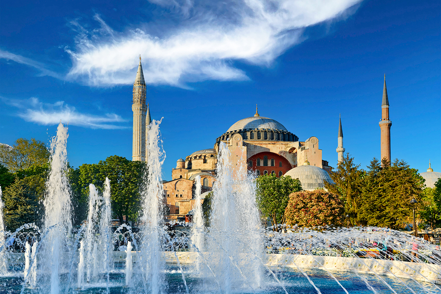 Fountain flows in foreground as Hagia Sophia stands tall in Istanbul. People walk and enjoy the view in the late afternoon sun.