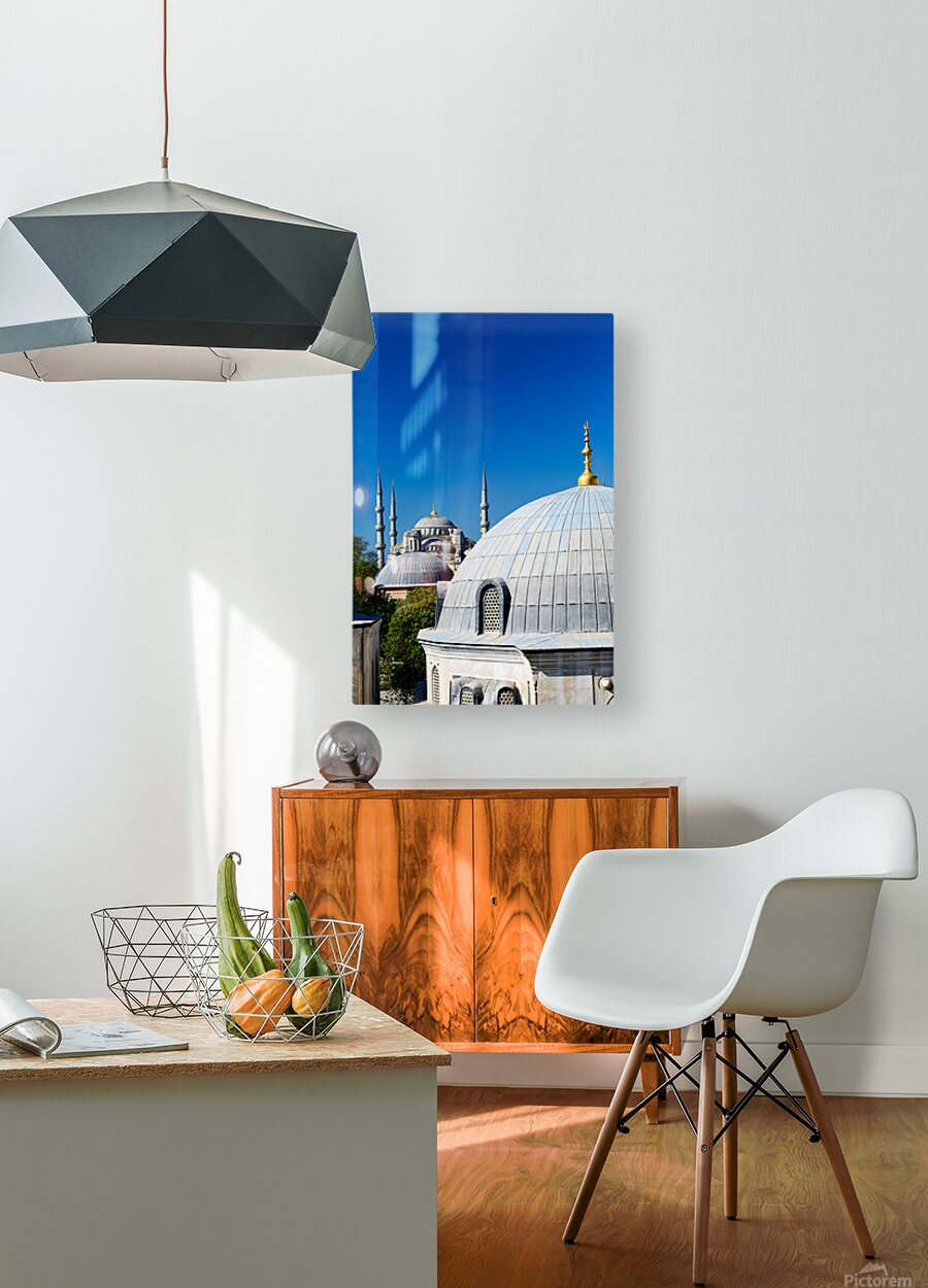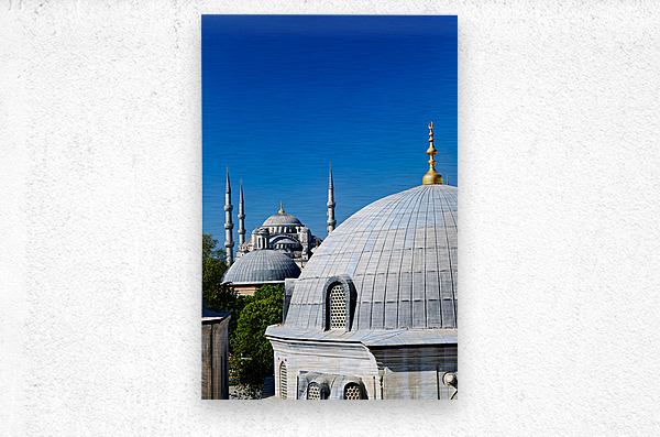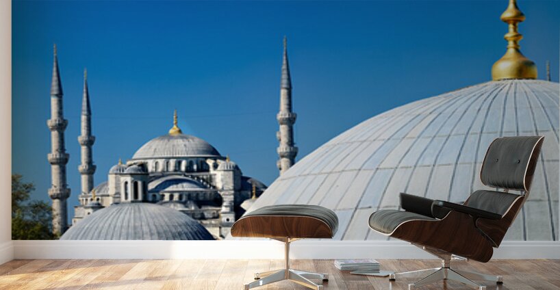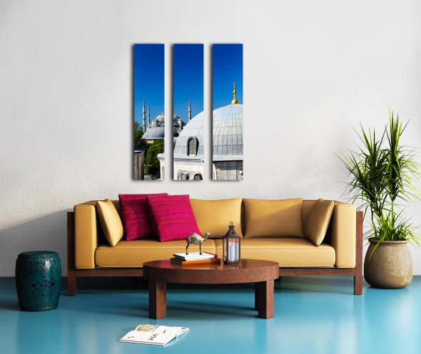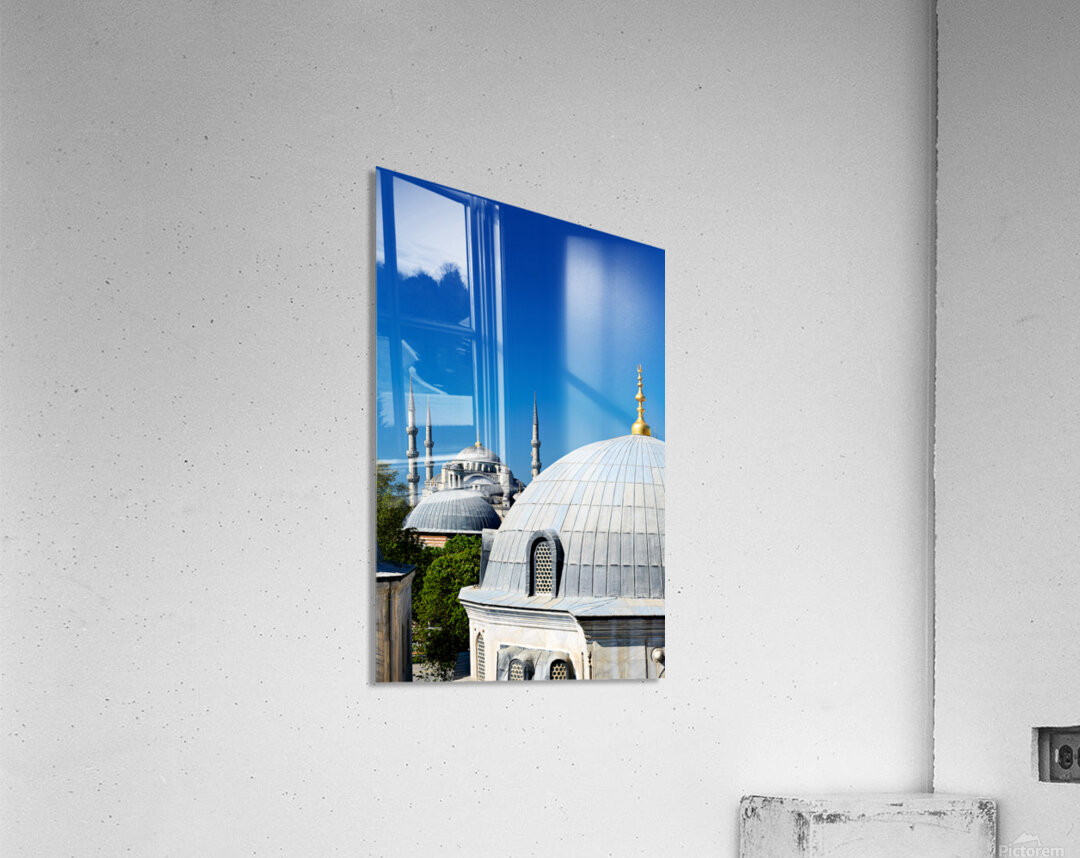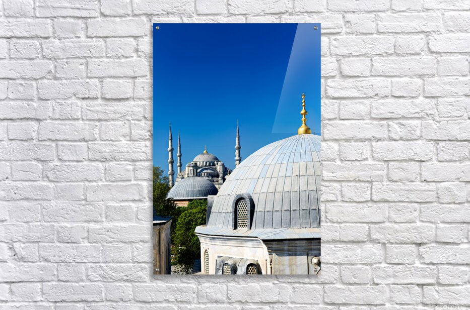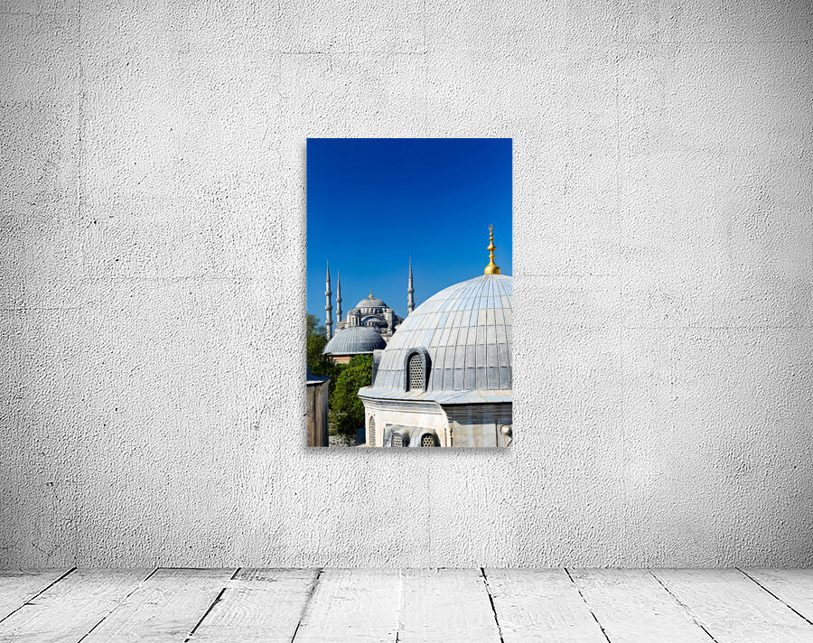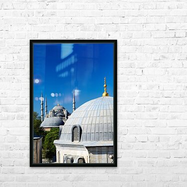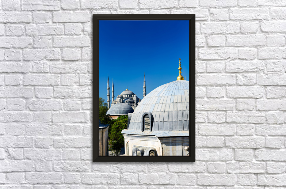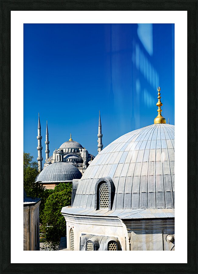 "Blue Mosque stands tall in Istanbul under the clear sky" in a framed print.