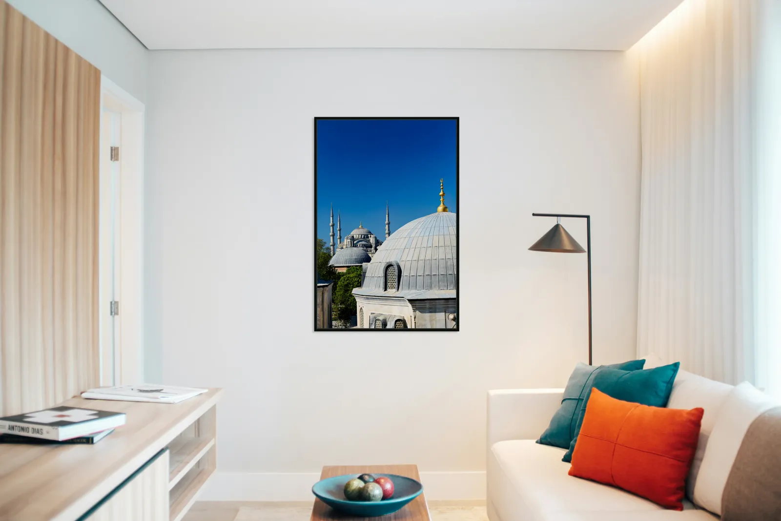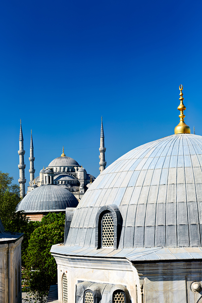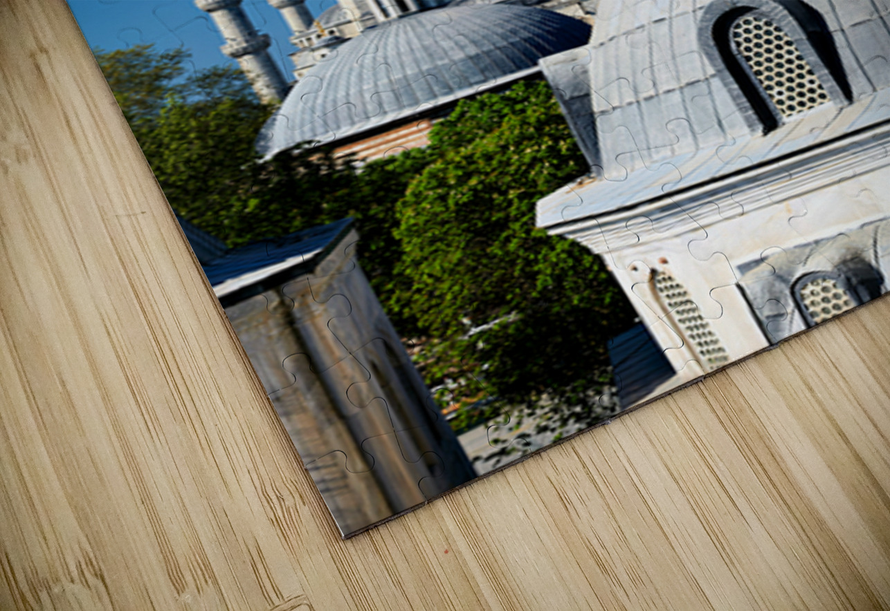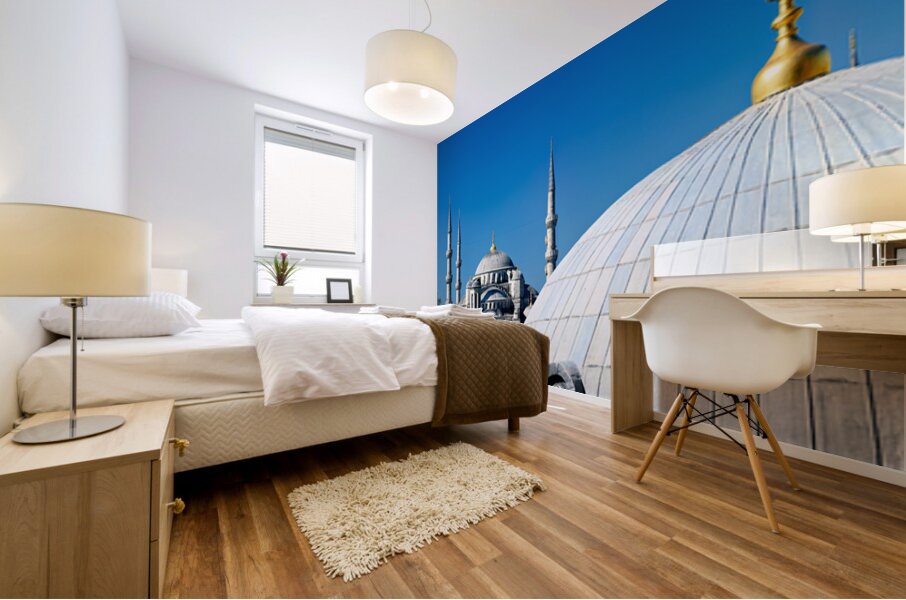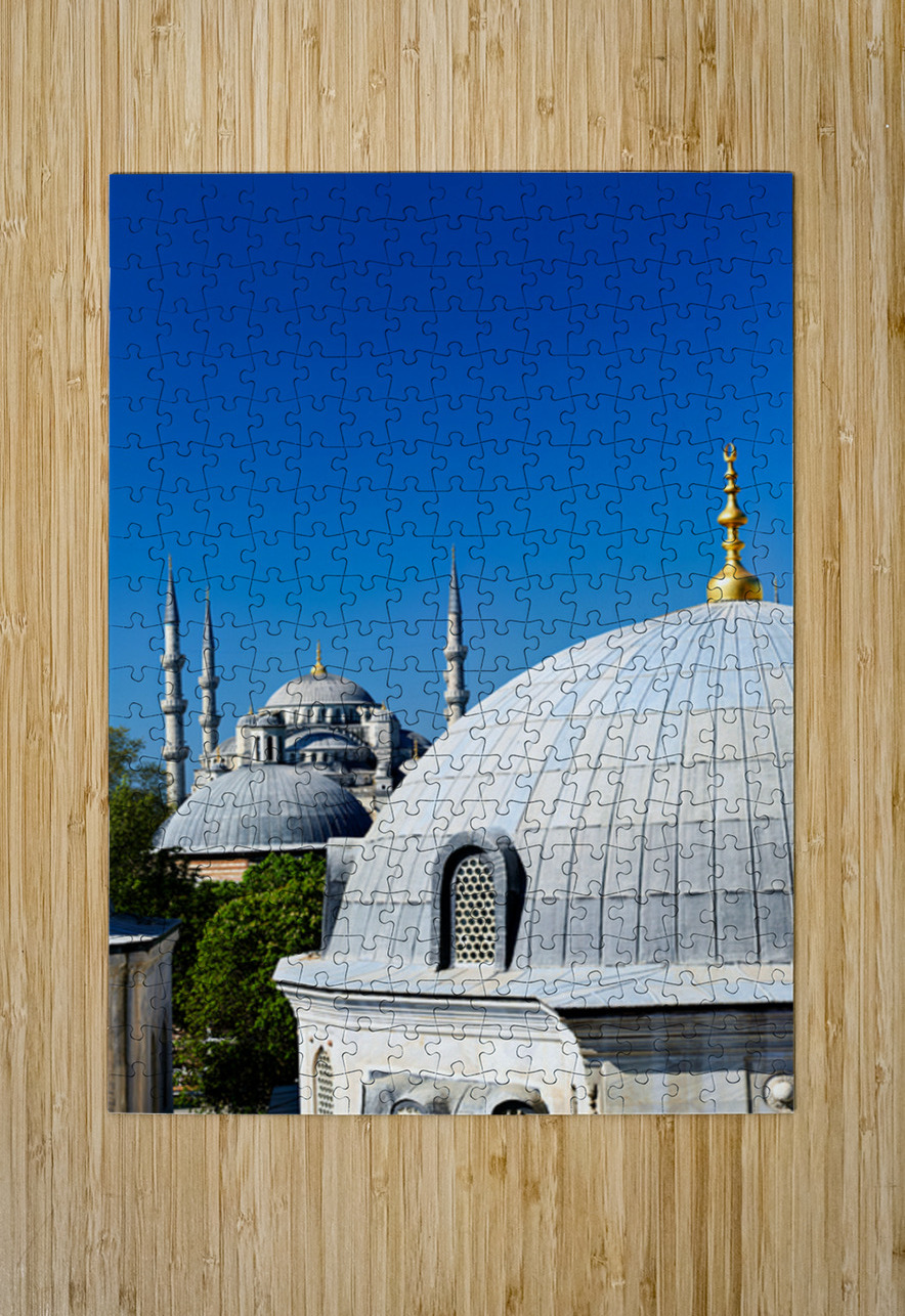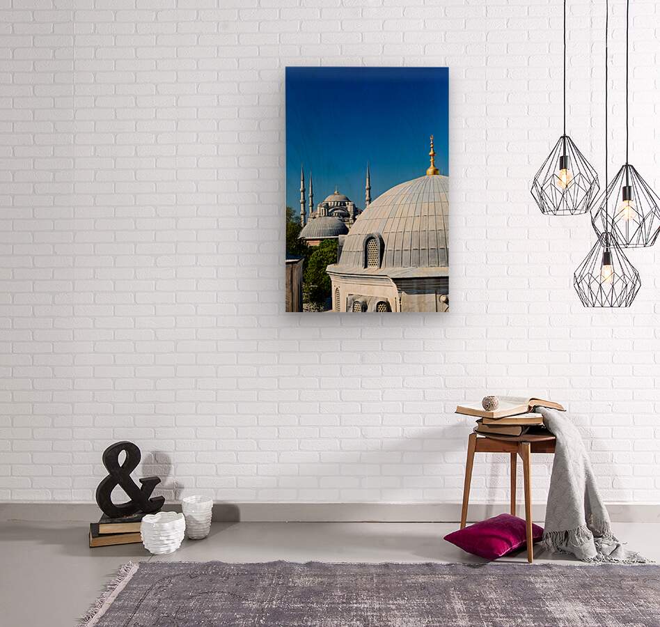 "Blue Mosque stands tall in Istanbul under the clear sky" in a framed print.