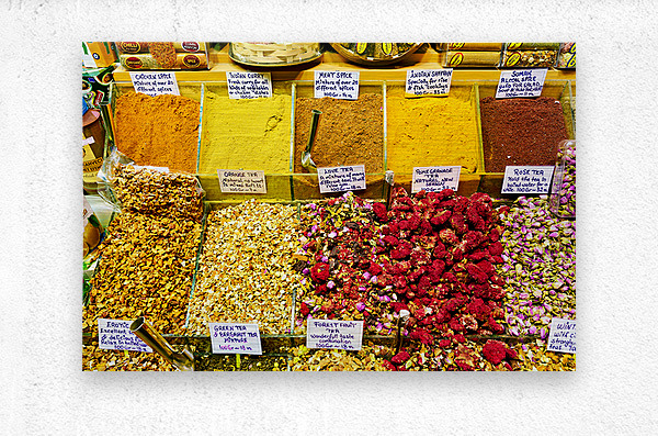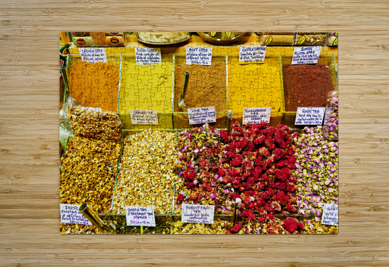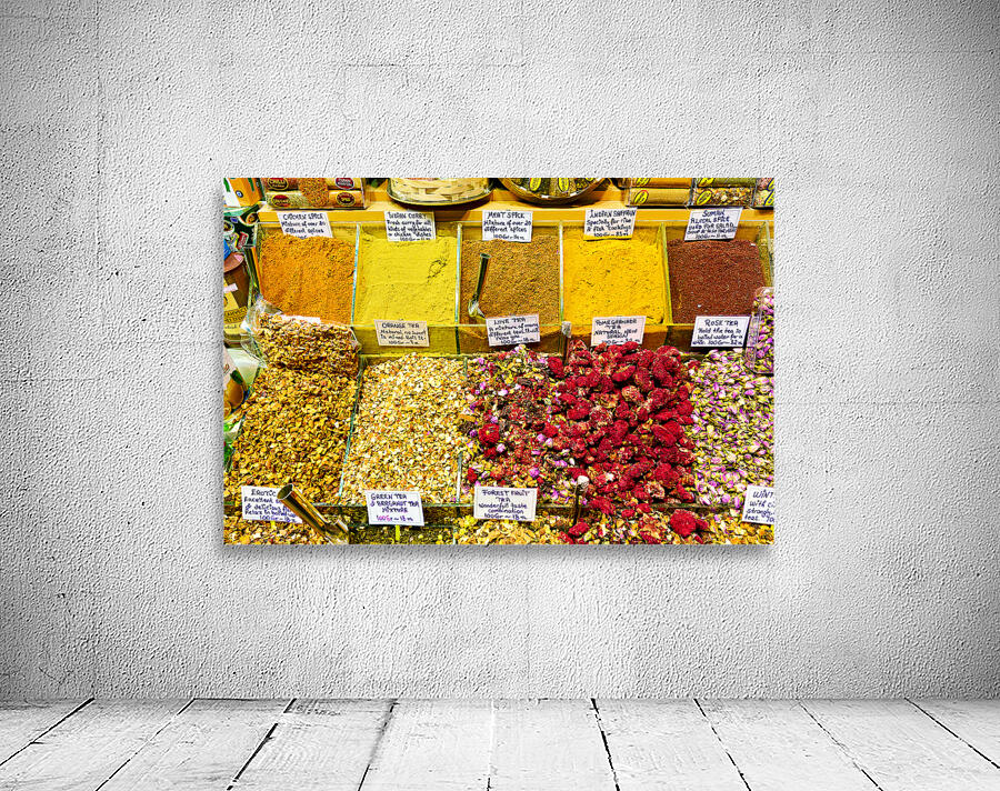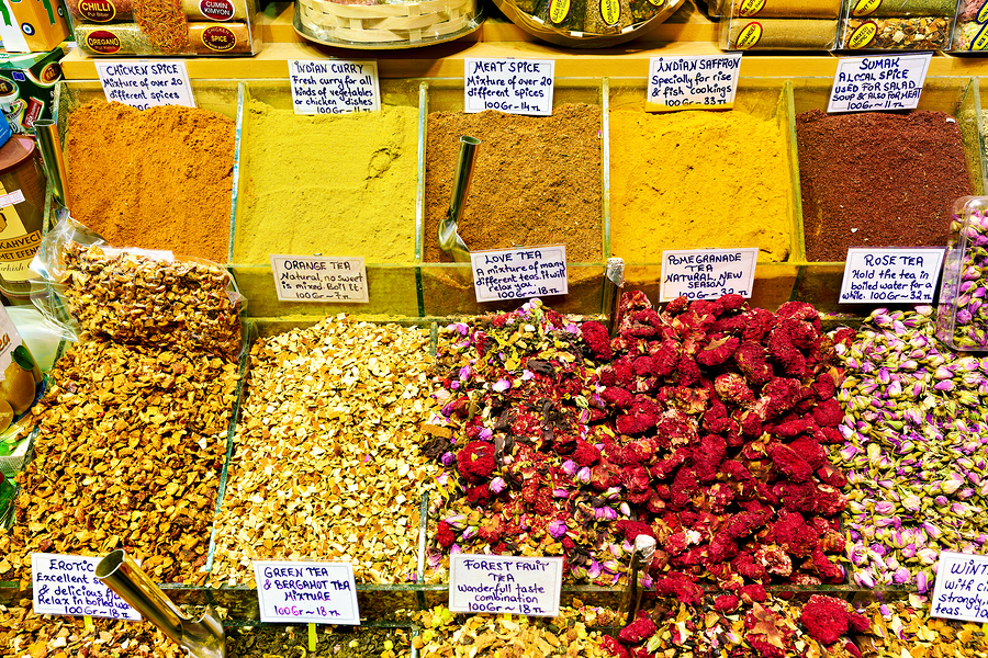 People explore the Grand Bazaar in Istanbul viewing various spices and teas on display enjoying the vibrant colors and scents around them.