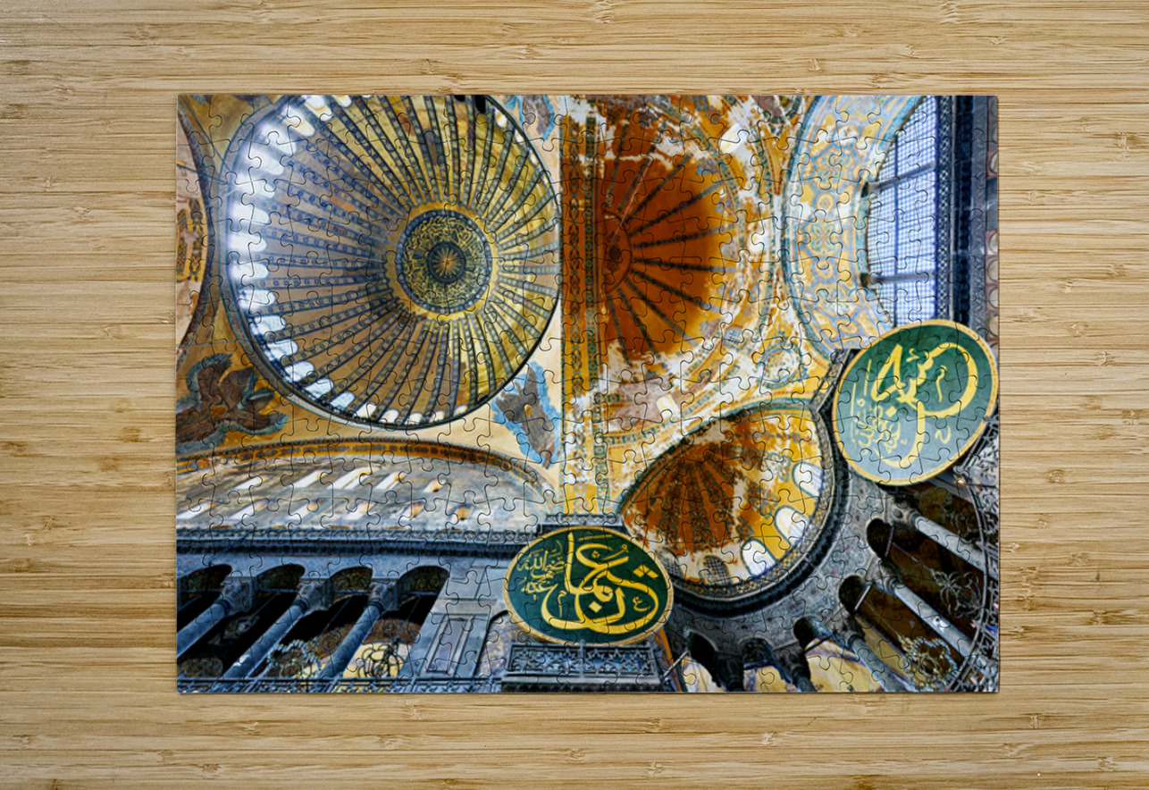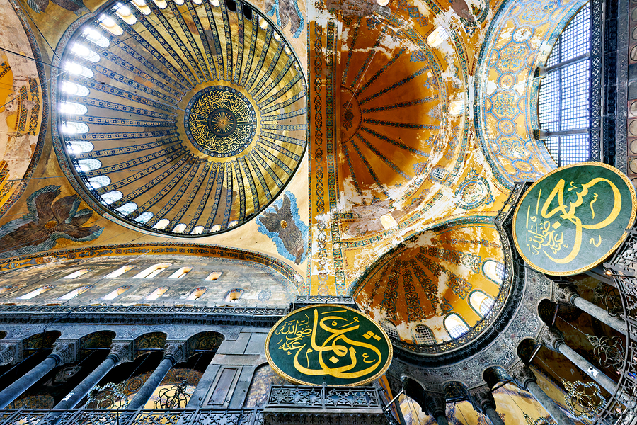 Visitors explore the Hagia Sophia Grand Mosque in Istanbul admiring its large dome and historic interior details during the day.