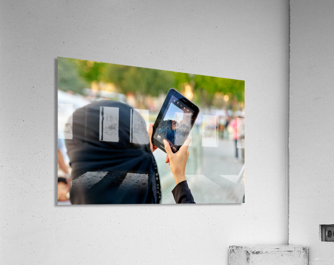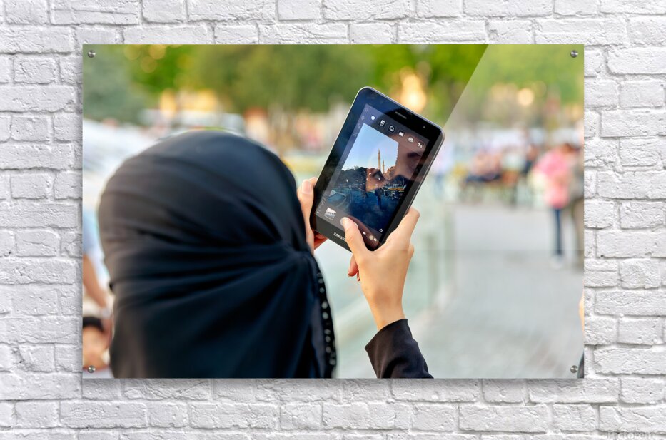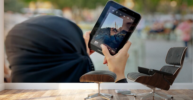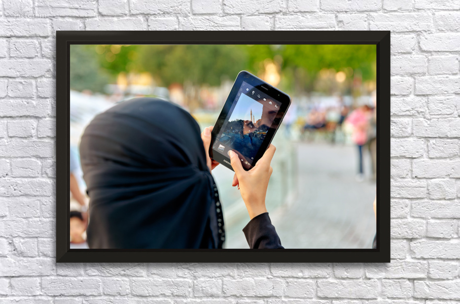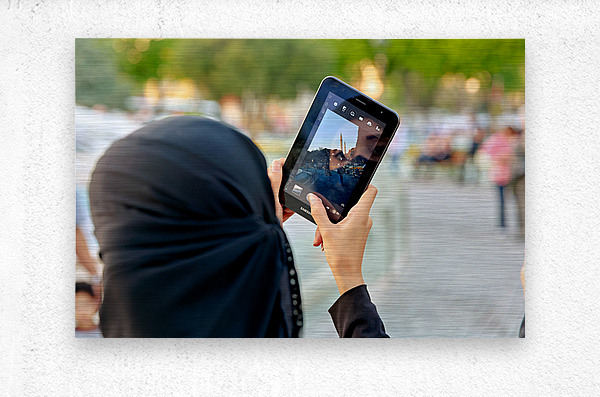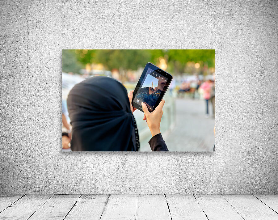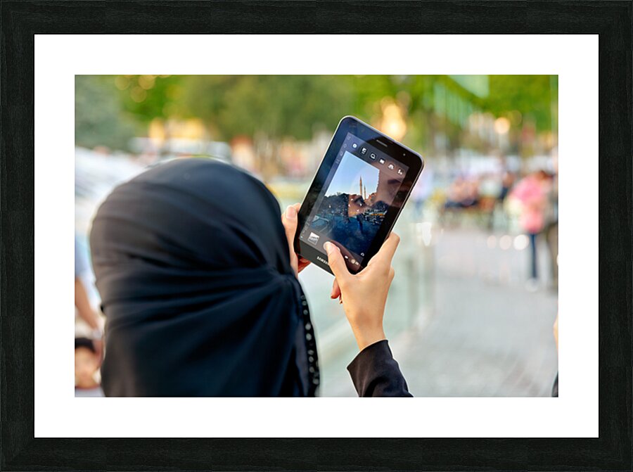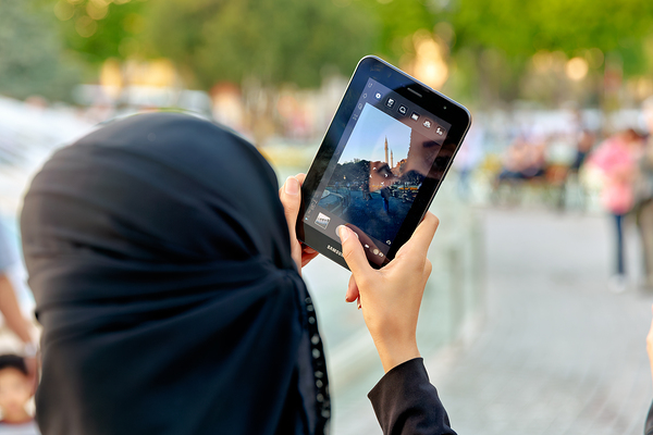 A woman in a veil holds a tablet while looking at something in Istanbul. People are seen in the background enjoying their time outdoors.