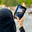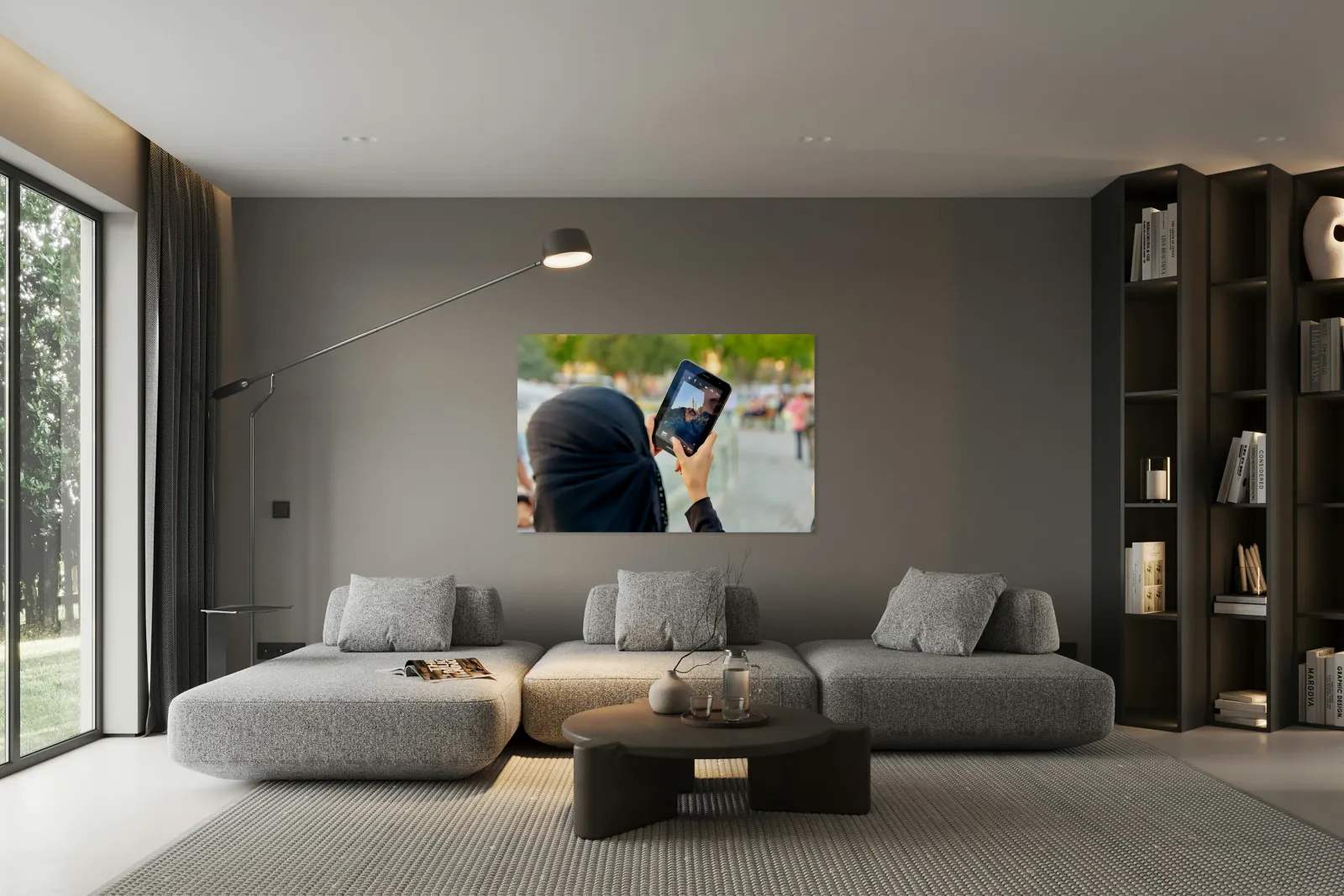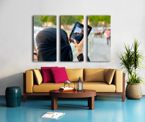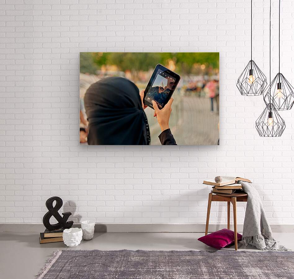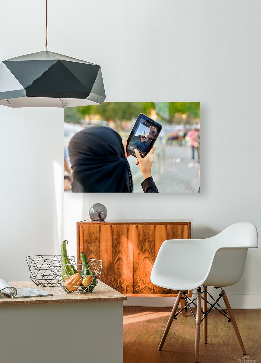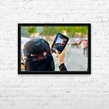 A woman in a veil holds a tablet while looking at something in Istanbul. People are seen in the background enjoying their time outdoors.