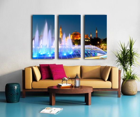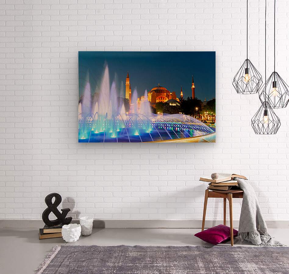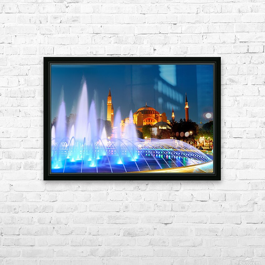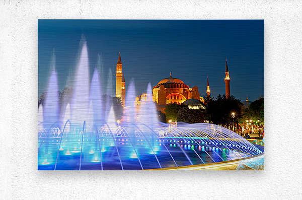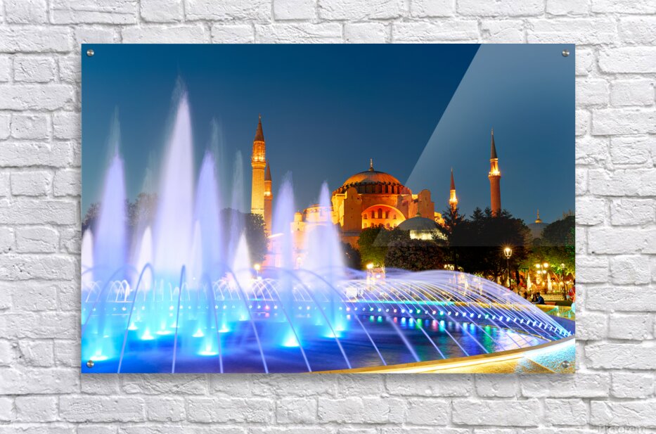 Get this artwork "Hagia Sophia Grand Mosque at night with a fountain display" in a framed print.