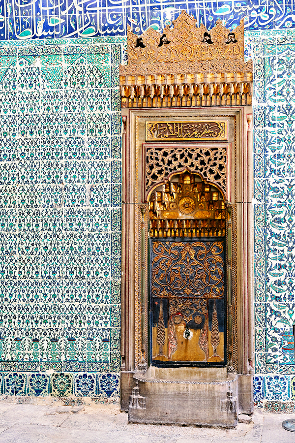 Visitors notice a historical water fountain inside Topkapi Palace in Istanbul. The fountain features intricate designs and colorful tiles.