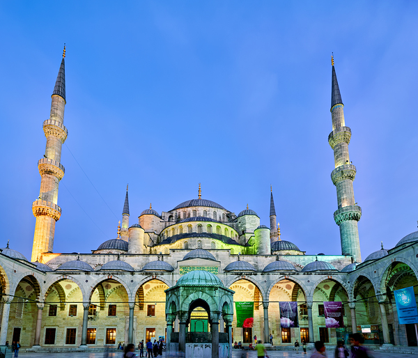 People walk around the Blue Mosque in Istanbul as the sun sets illuminating its minarets and architecture.