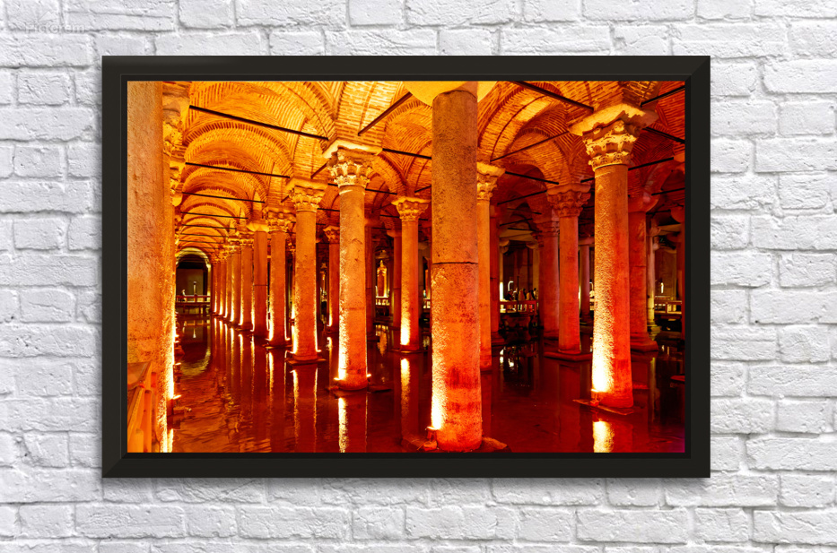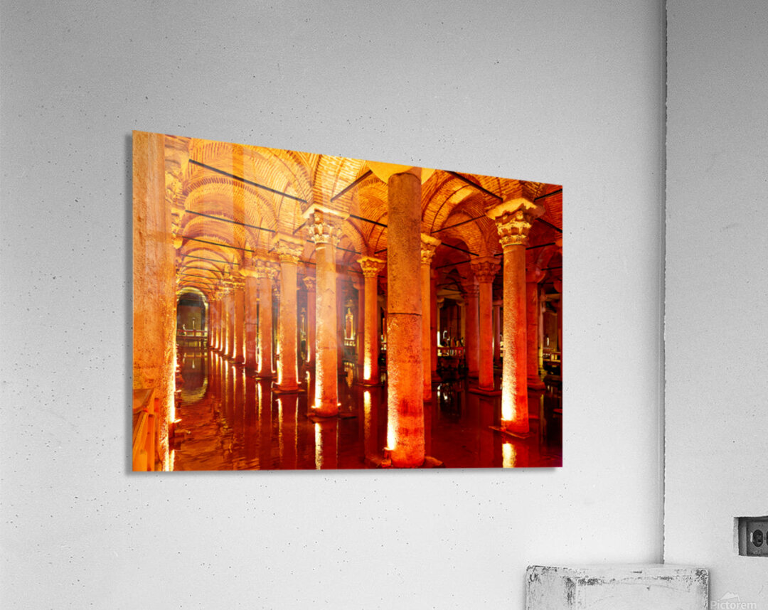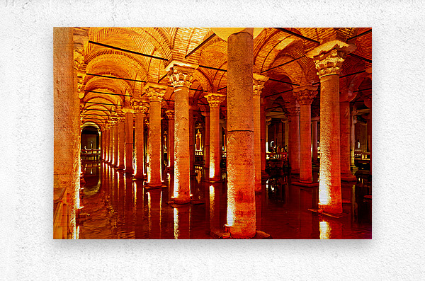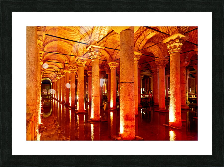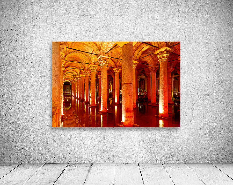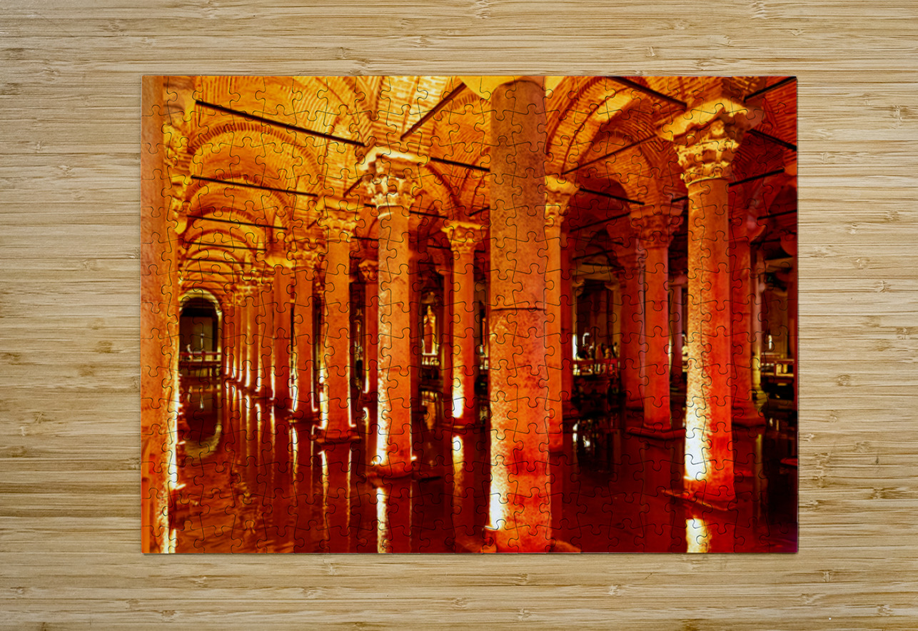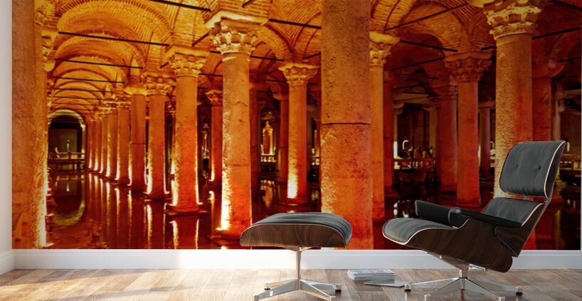 Visitors walk through the Basilica Cistern in Istanbul. The historic space is filled with water and lit by soft orange lights.