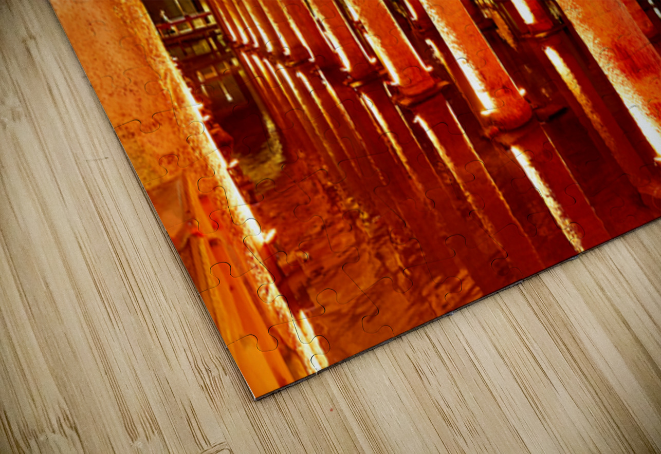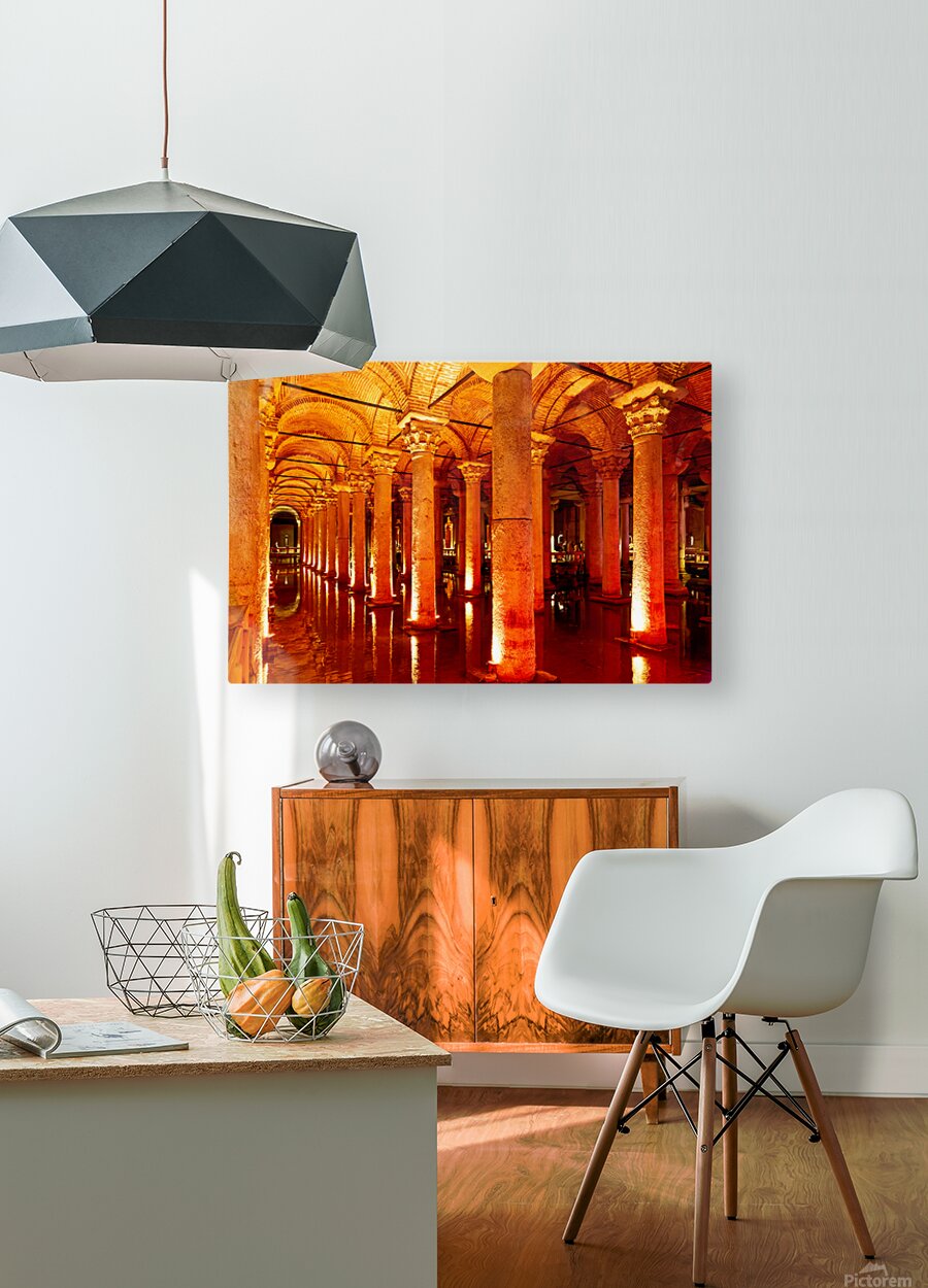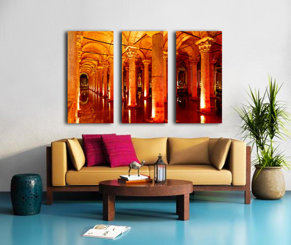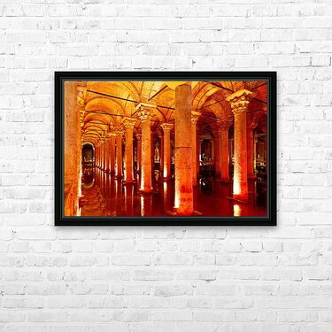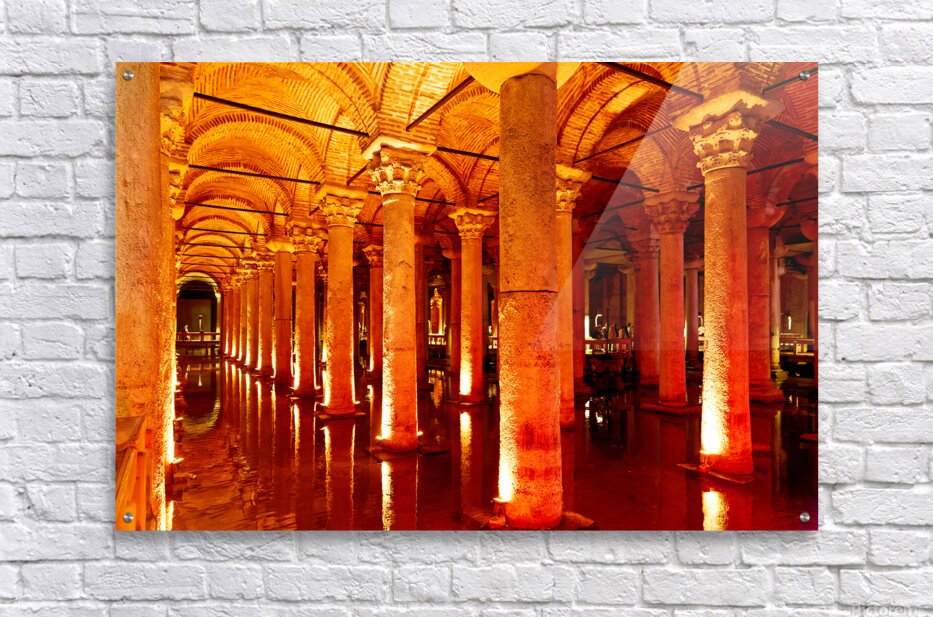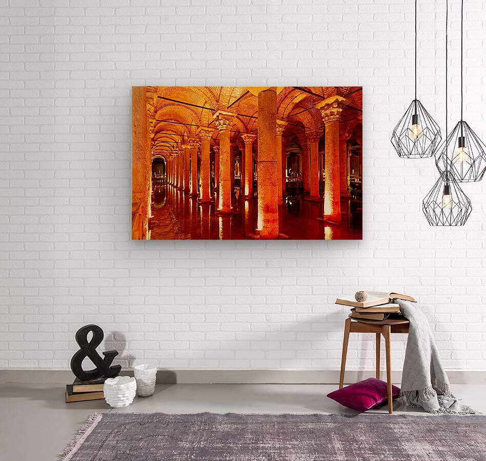 Visitors walk through the Basilica Cistern in Istanbul. The historic space is filled with water and lit by soft orange lights.