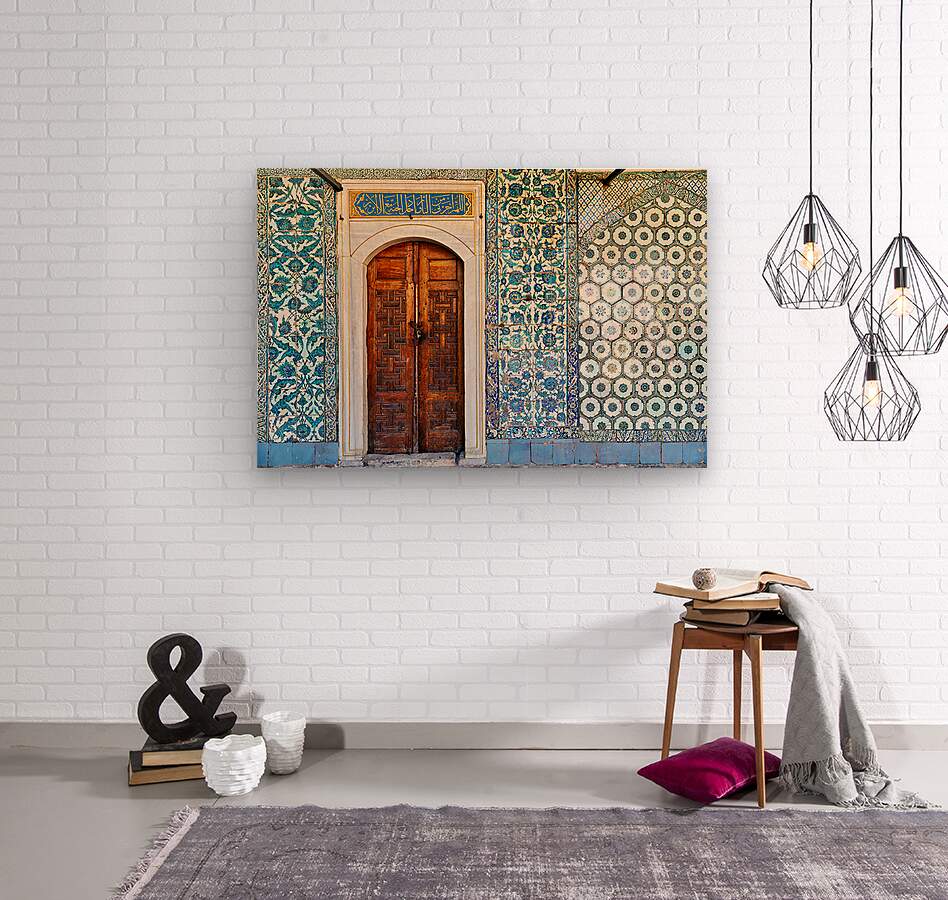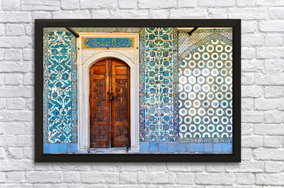 Visitors view intricate tiles and a wooden door at Topkapi Palace in Istanbul Turkey during a sunny afternoon.