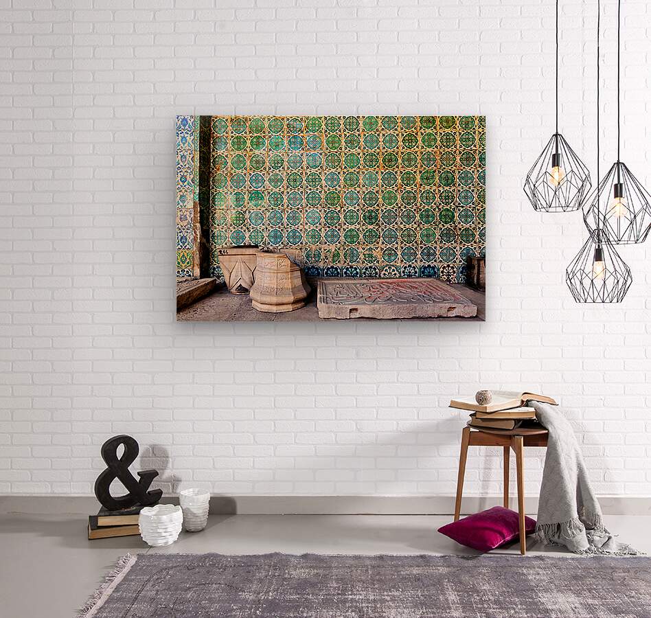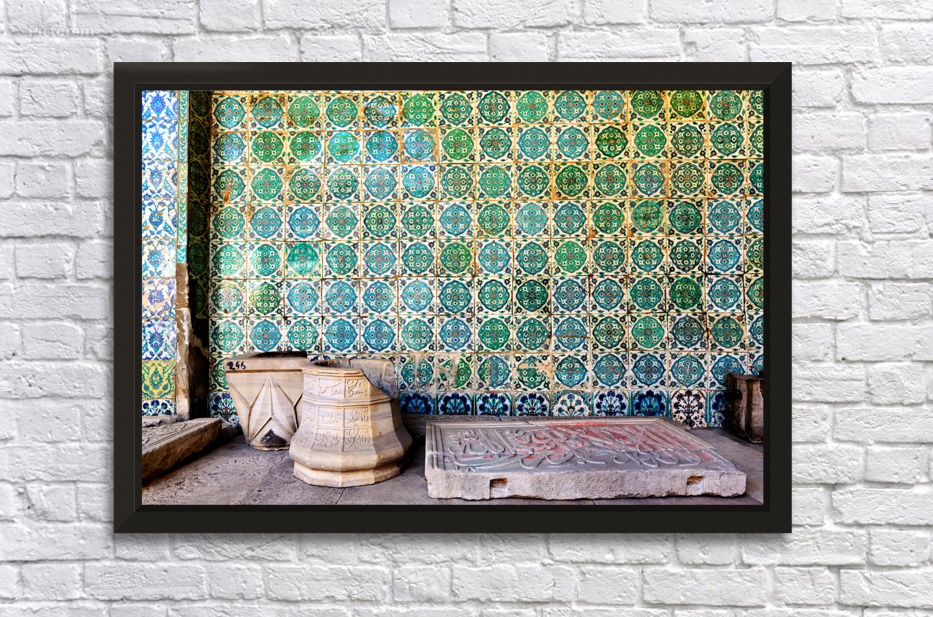 Visitors observe the detailed mosaic tiles and stone elements in Topkapi Palace in Istanbul during a sunny day.