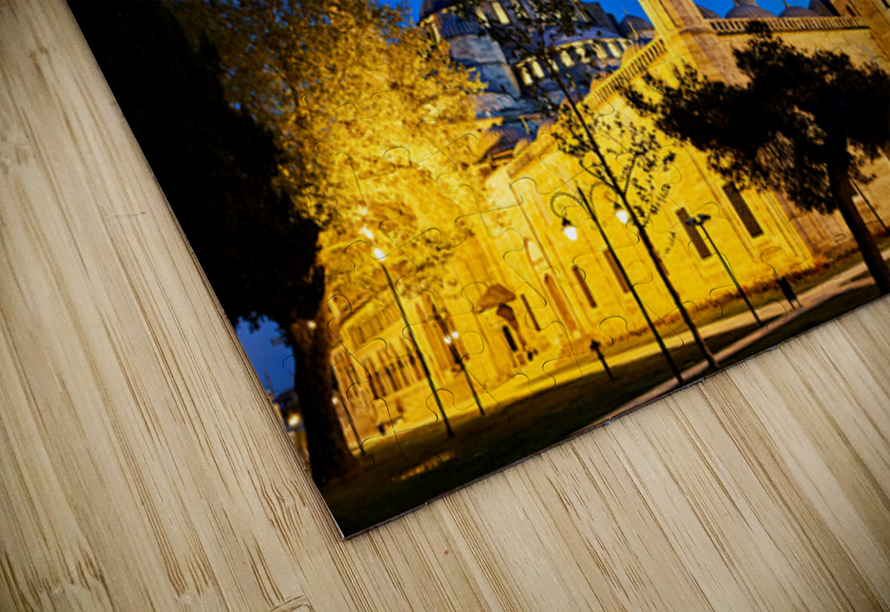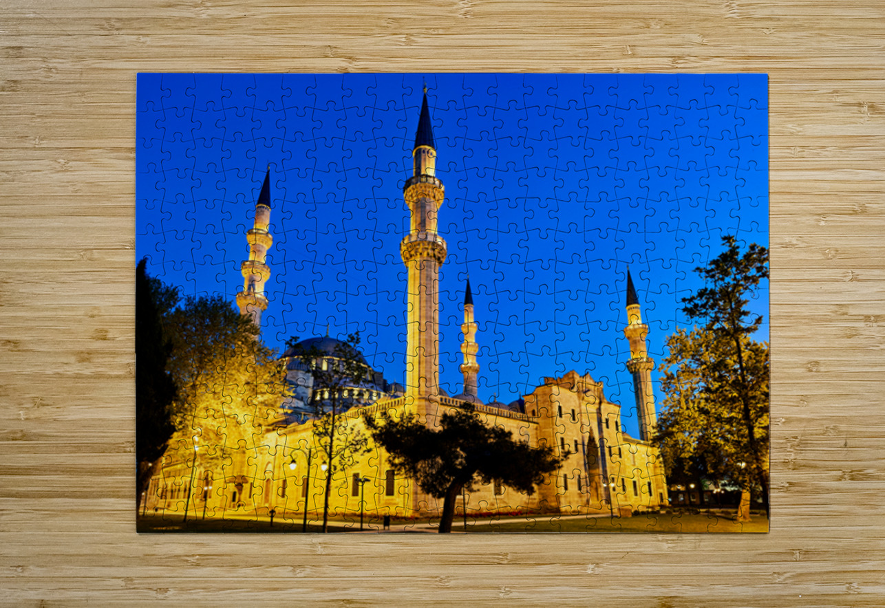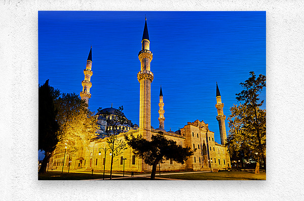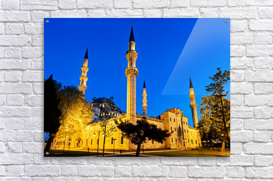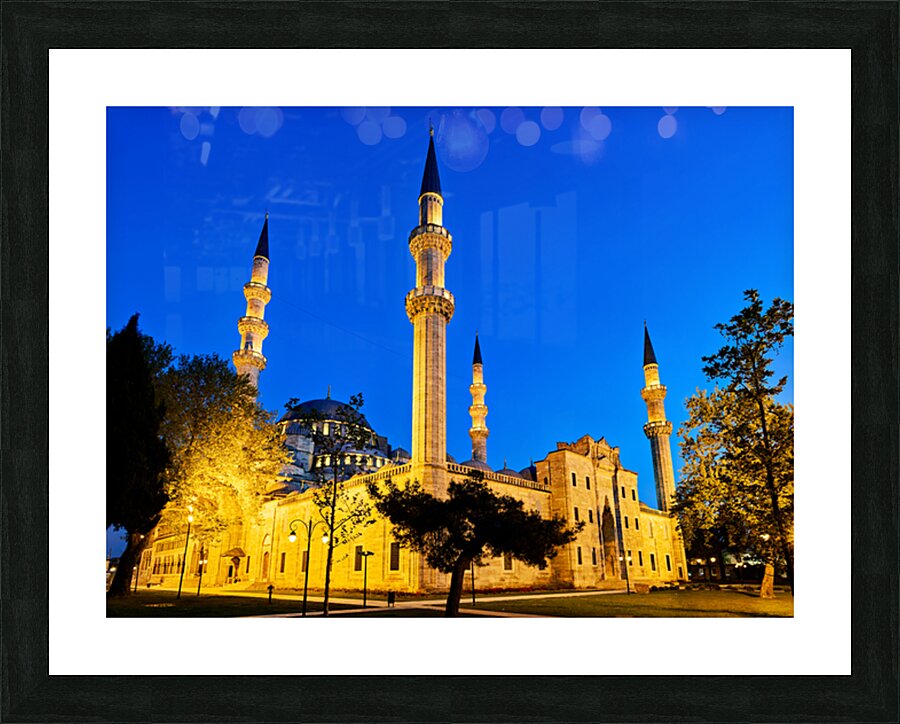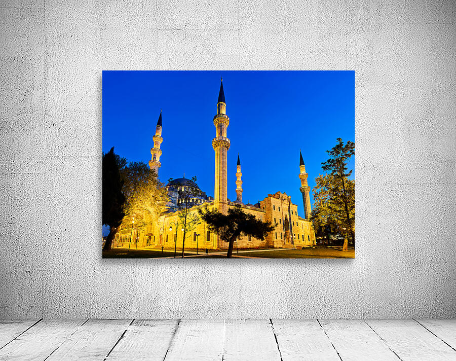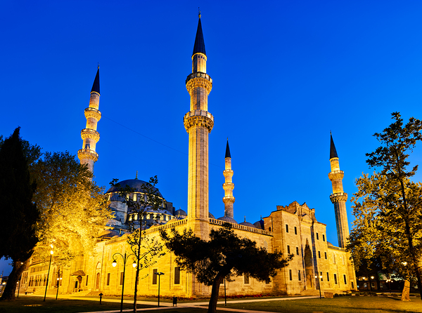 Suleymaniye Mosque stands brightly lit at night in Istanbul. The minarets and courtyard create a striking scene under the evening sky.