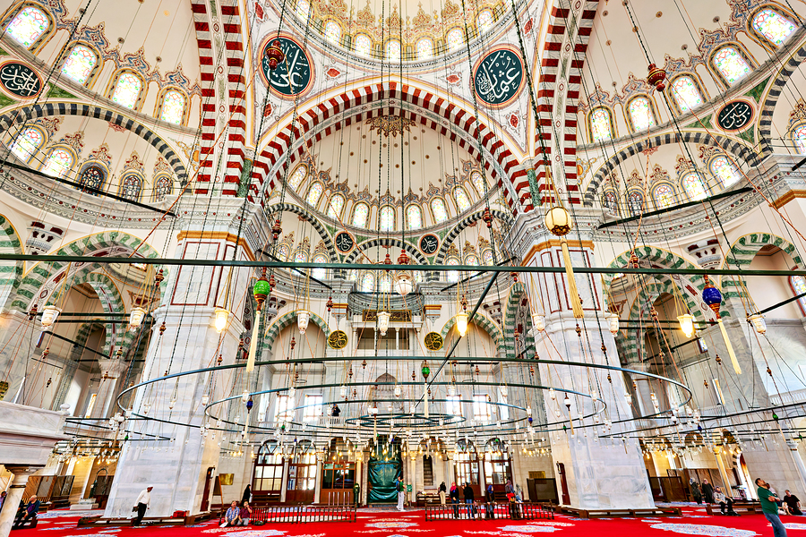 Visitors explore the interior of Fatih Mosque in Istanbul Turkey during the day. The space shows tall arches and detailed decorations.