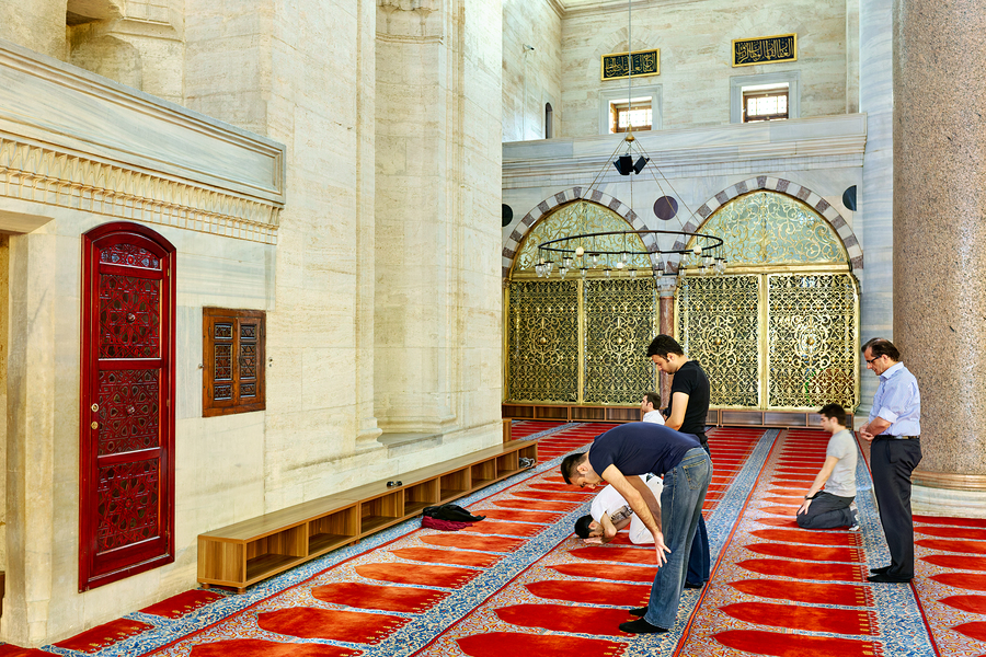 PEOPLE PRAY INSIDE SULEYMANIYE MOSQUE IN ISTANBUL TURKEY