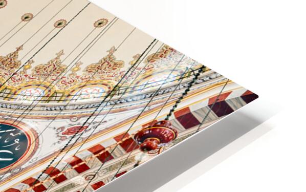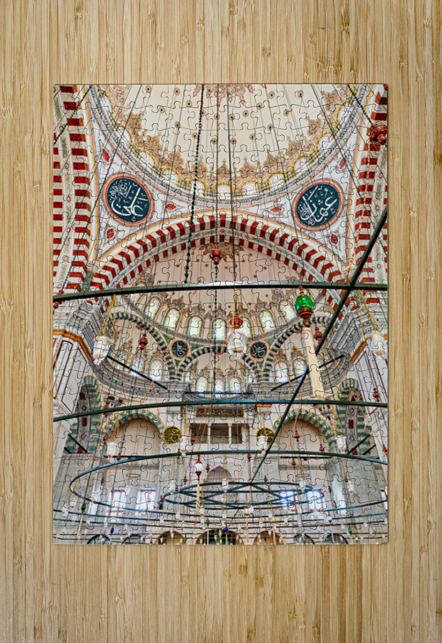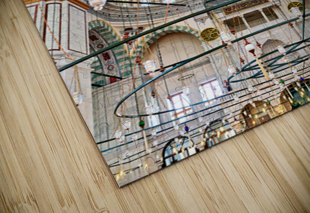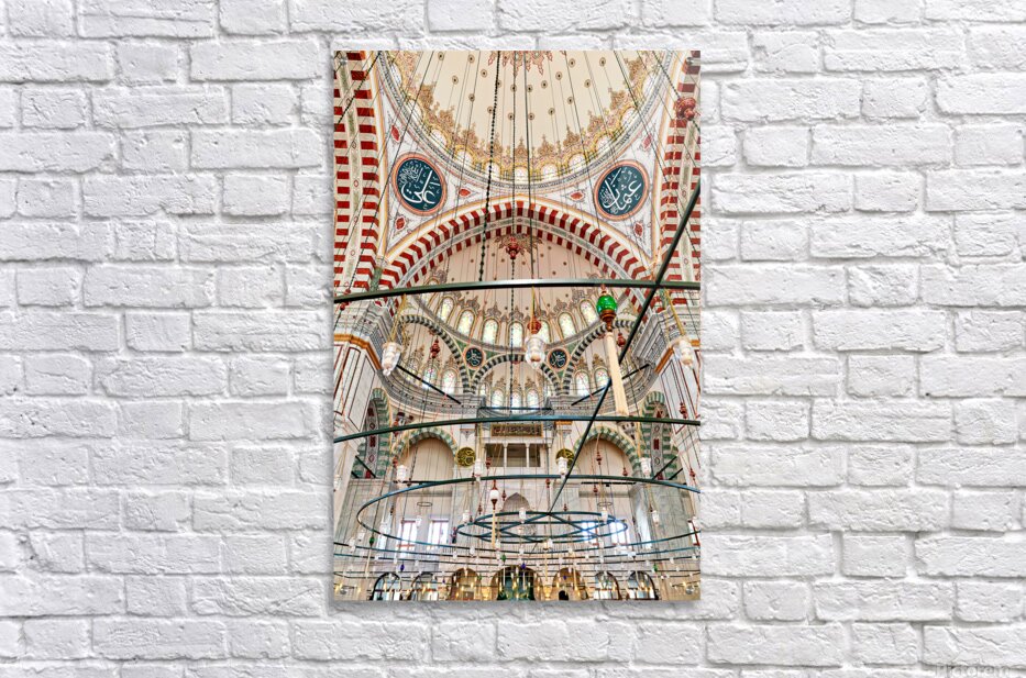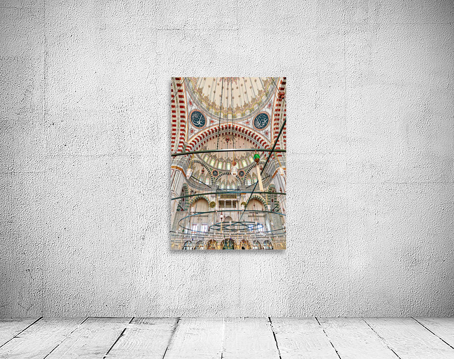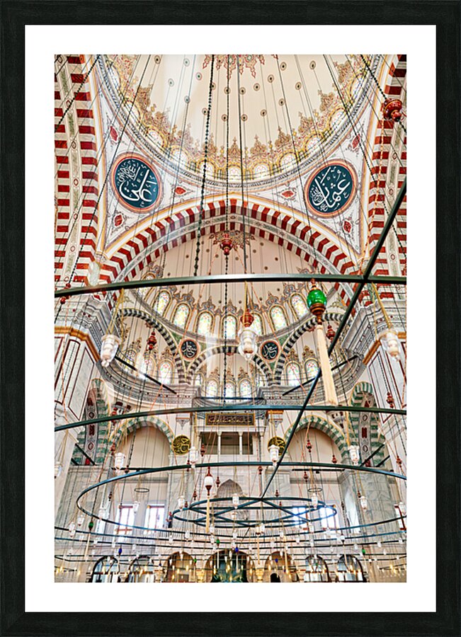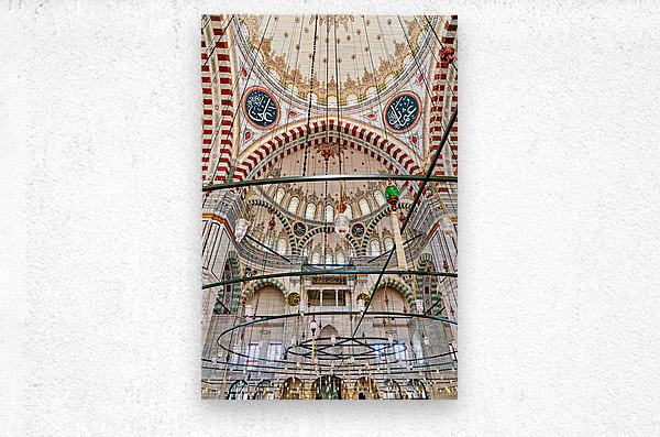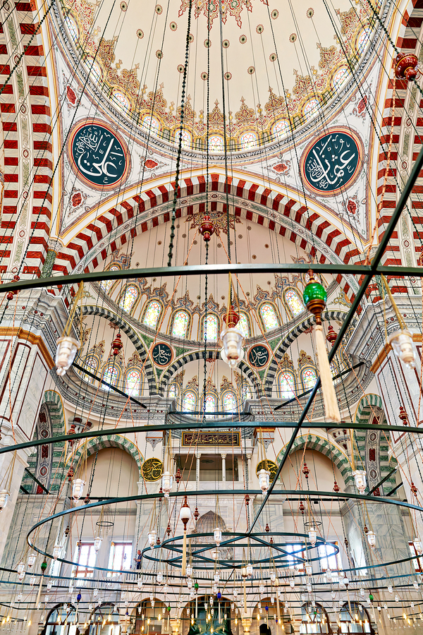 Visitors explore the interior of Fatih Mosque in Istanbul Turkey. The mosque features tall ceilings and colorful lights.
