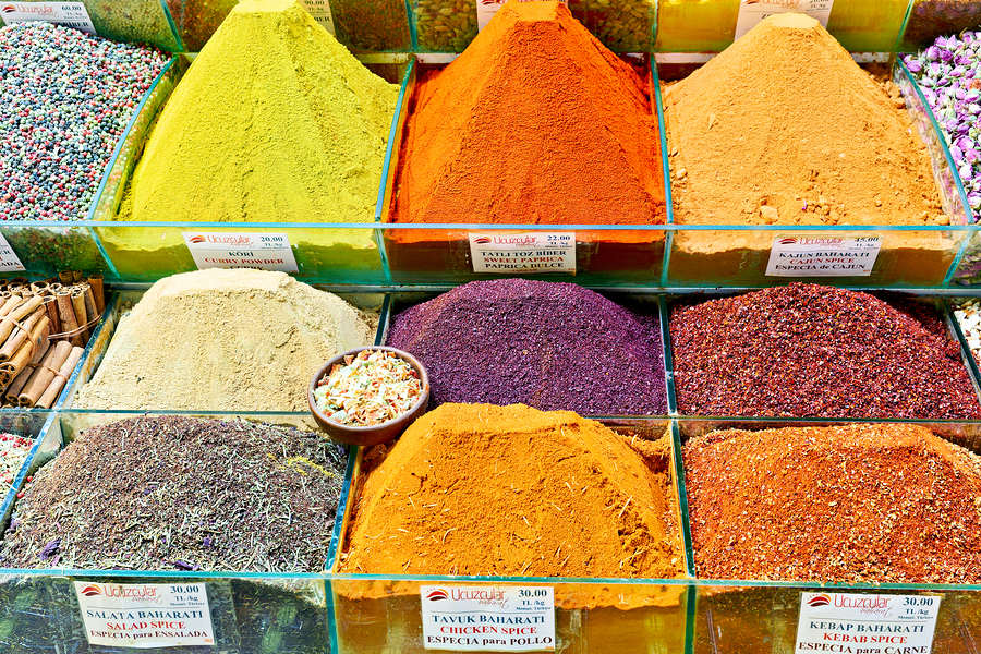 Visitors browse a variety of spices at the Grand Bazaar in Istanbul. Bright colors and unique scents attract many people in this busy market.