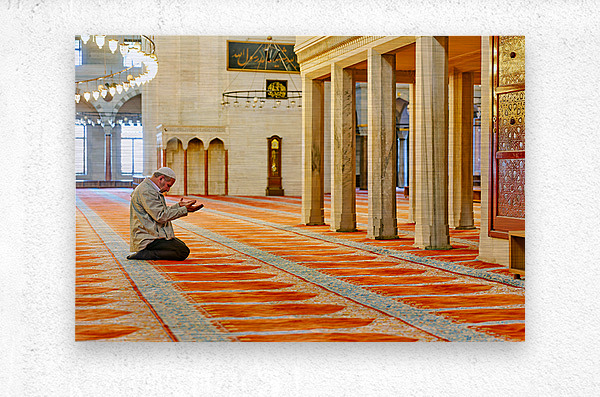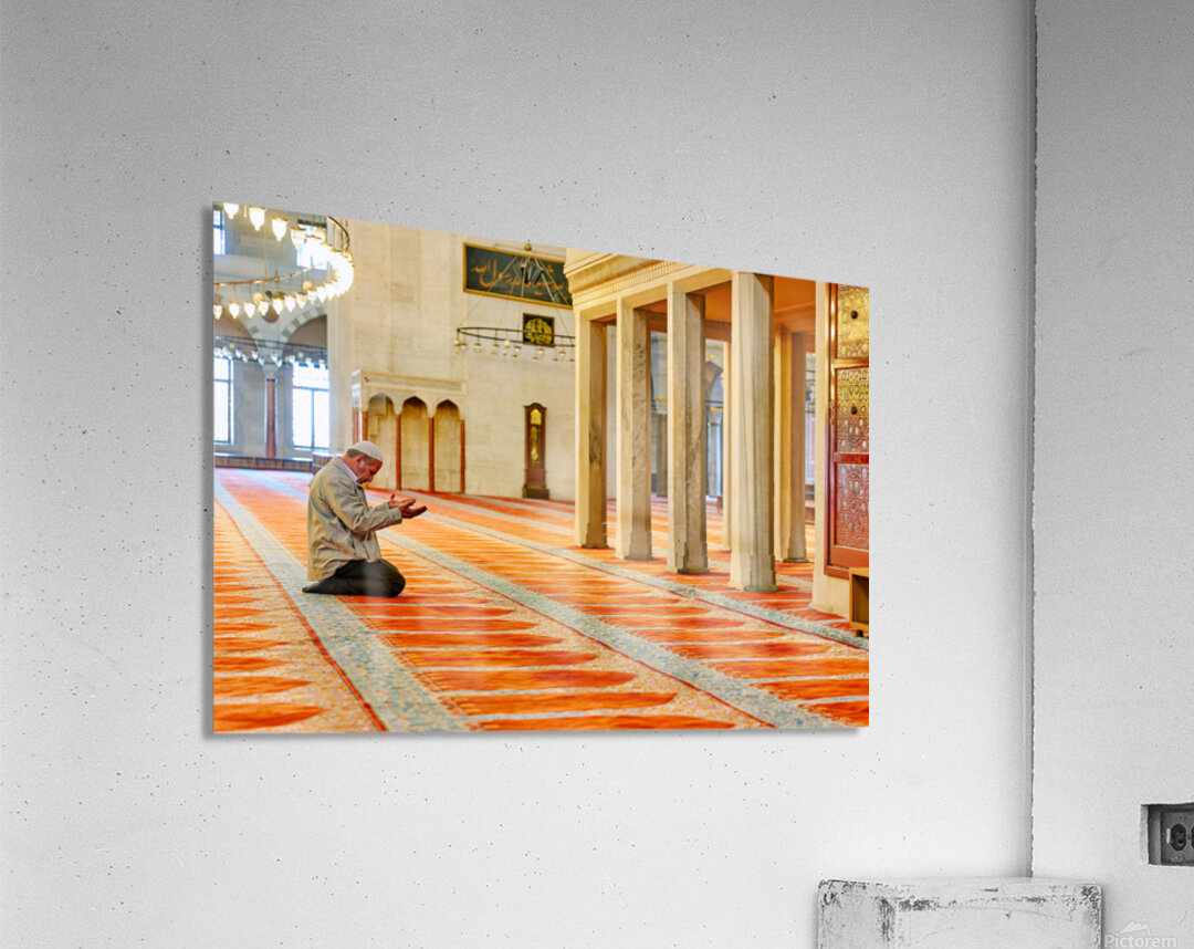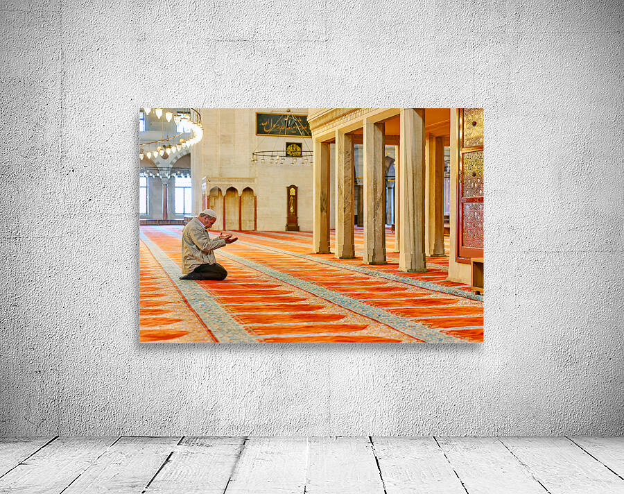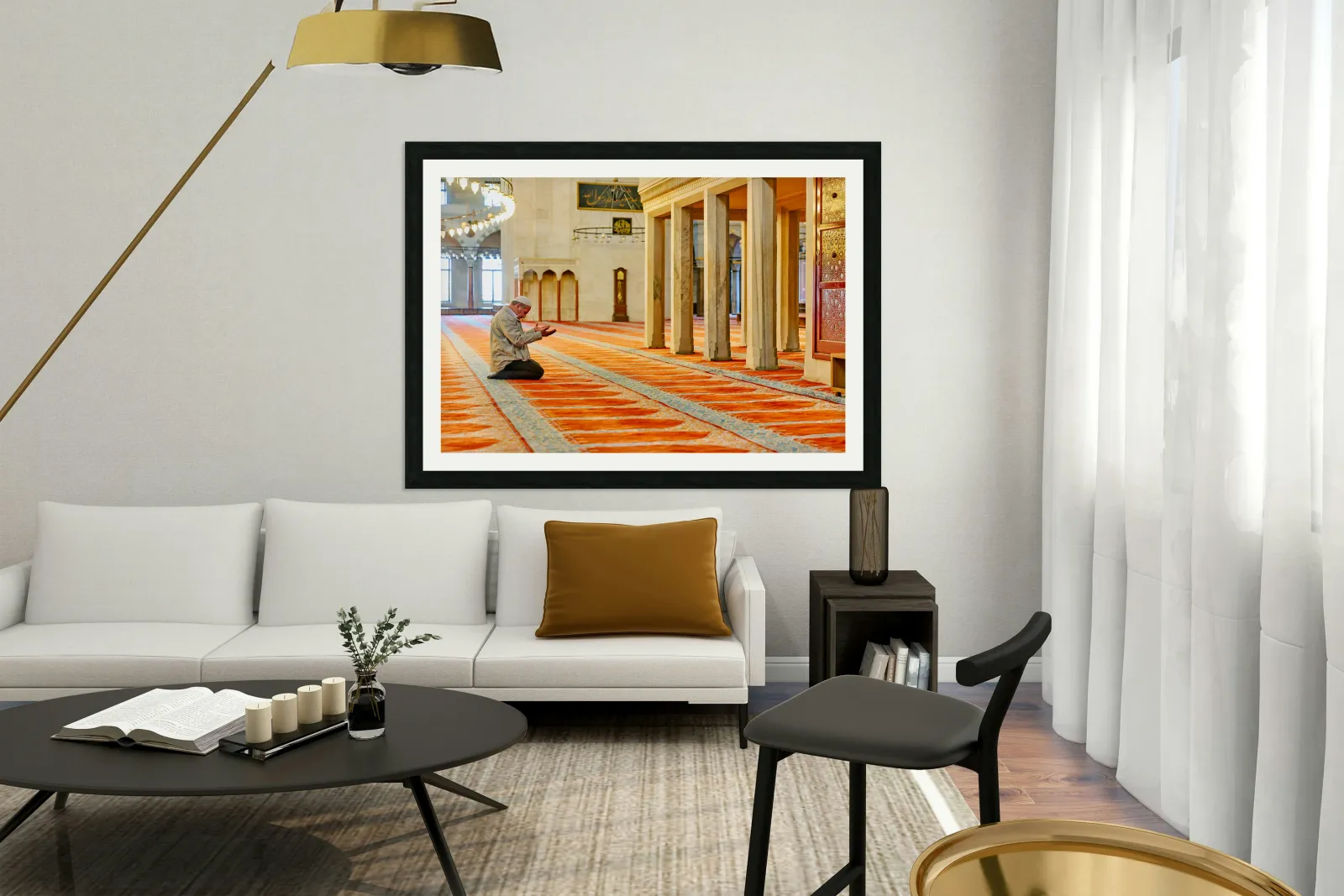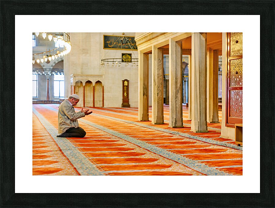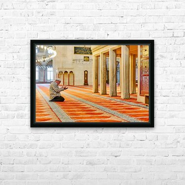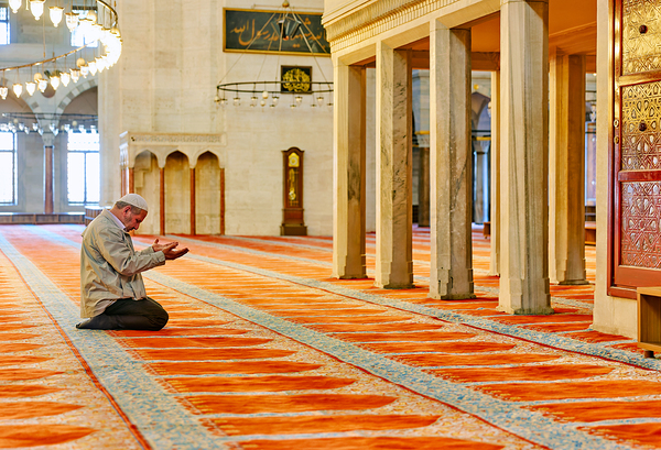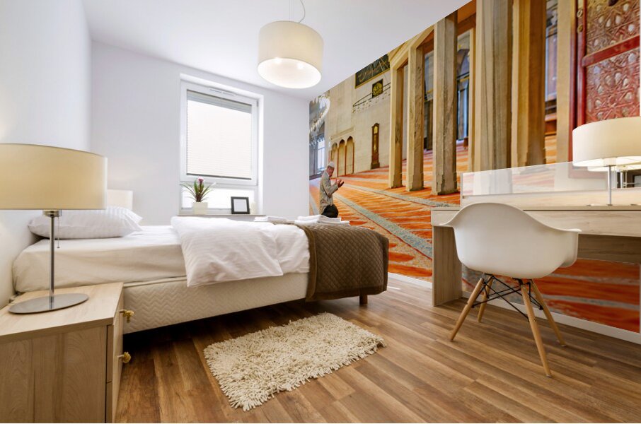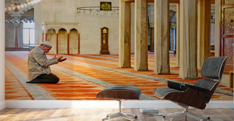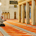 A person is praying on the orange carpet at Suleymaniye Mosque in Istanbul. The mosque has tall columns and soft lighting.