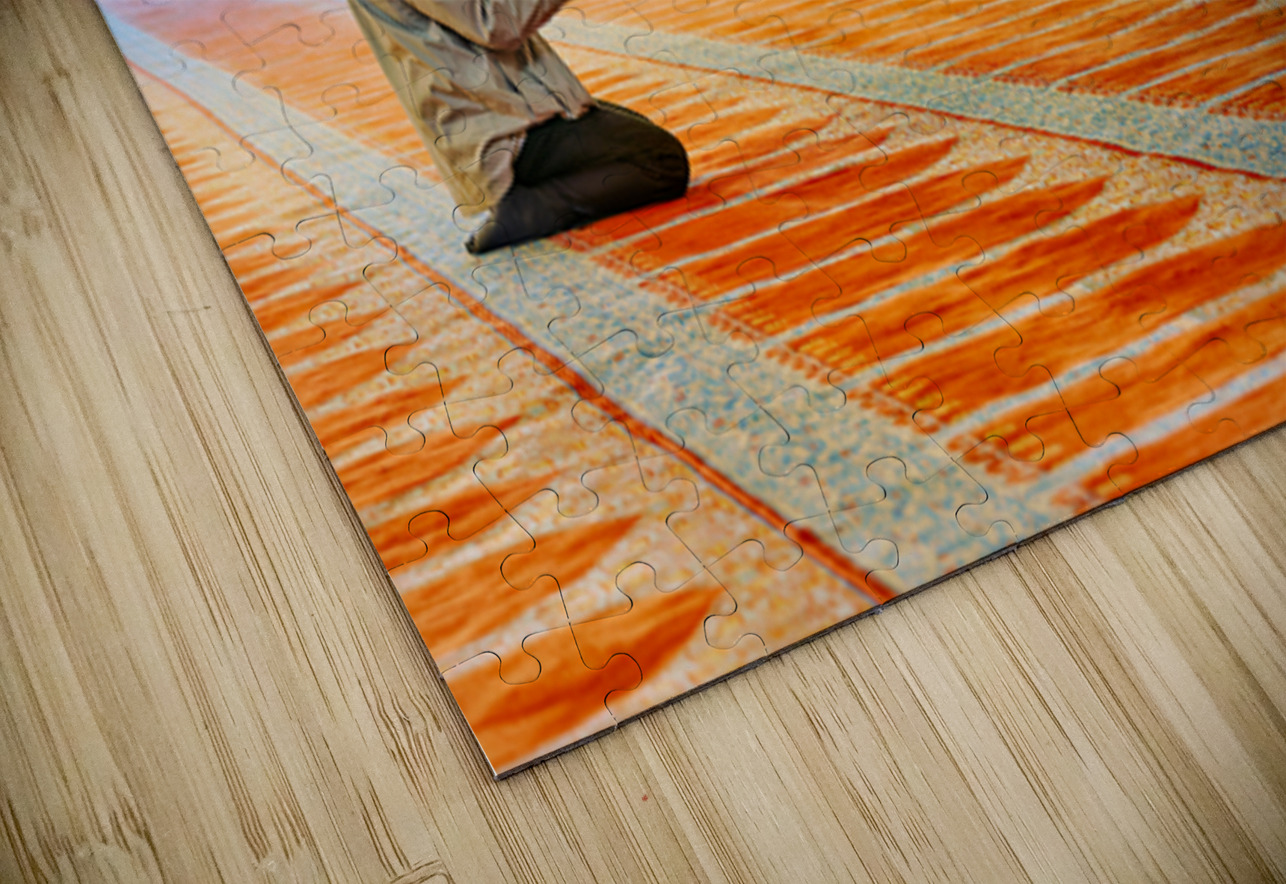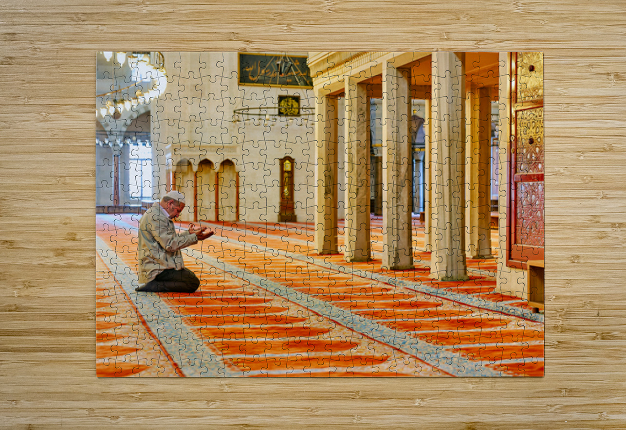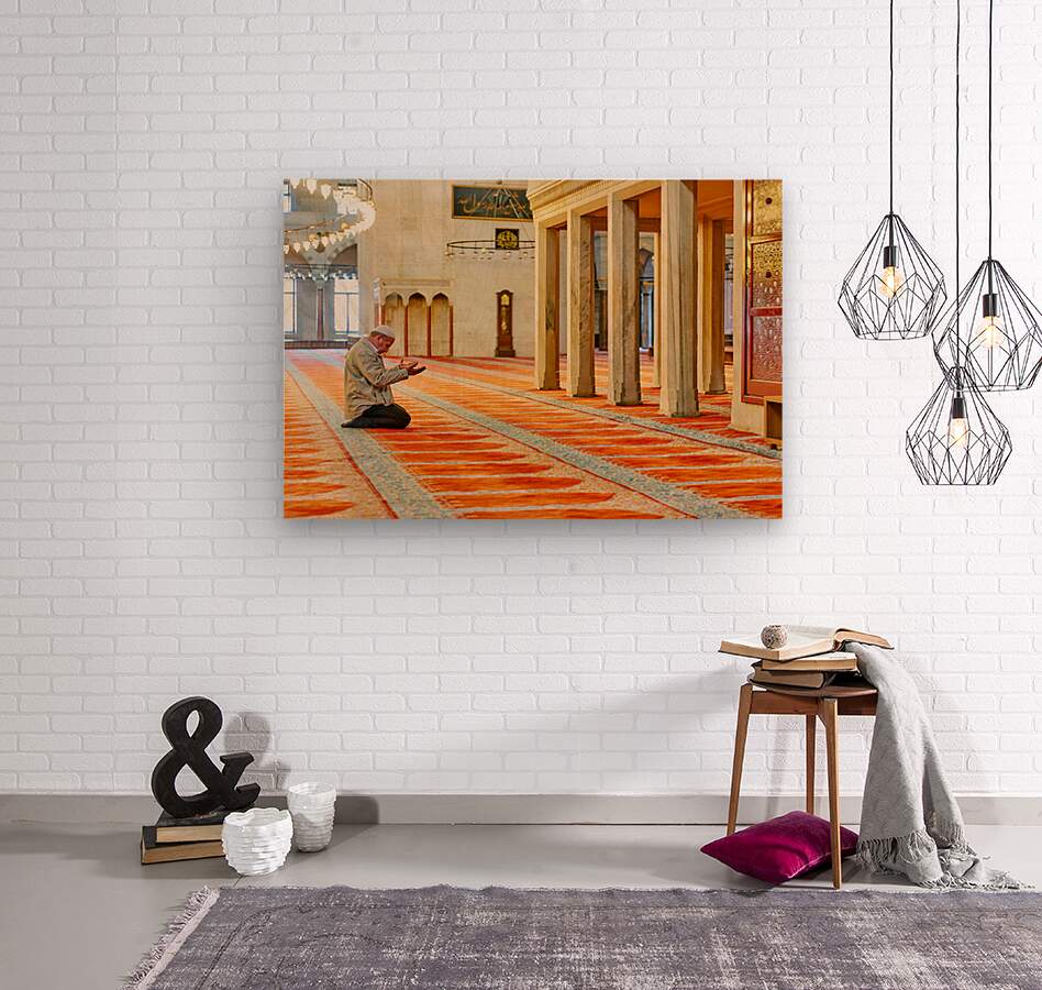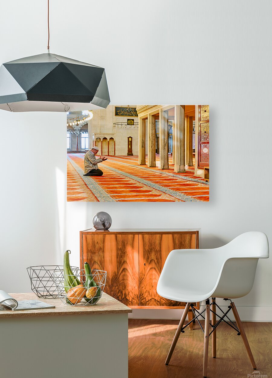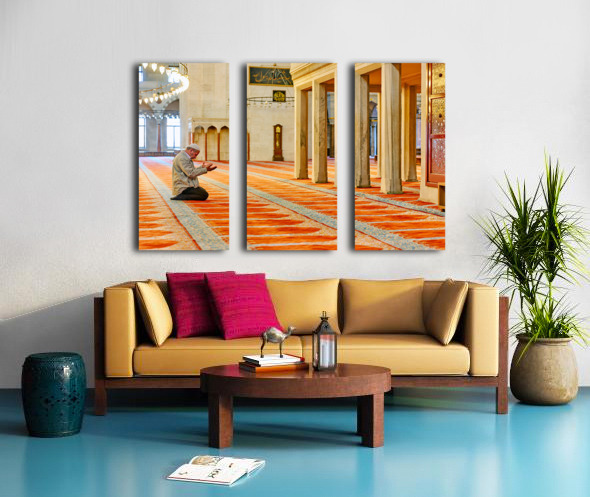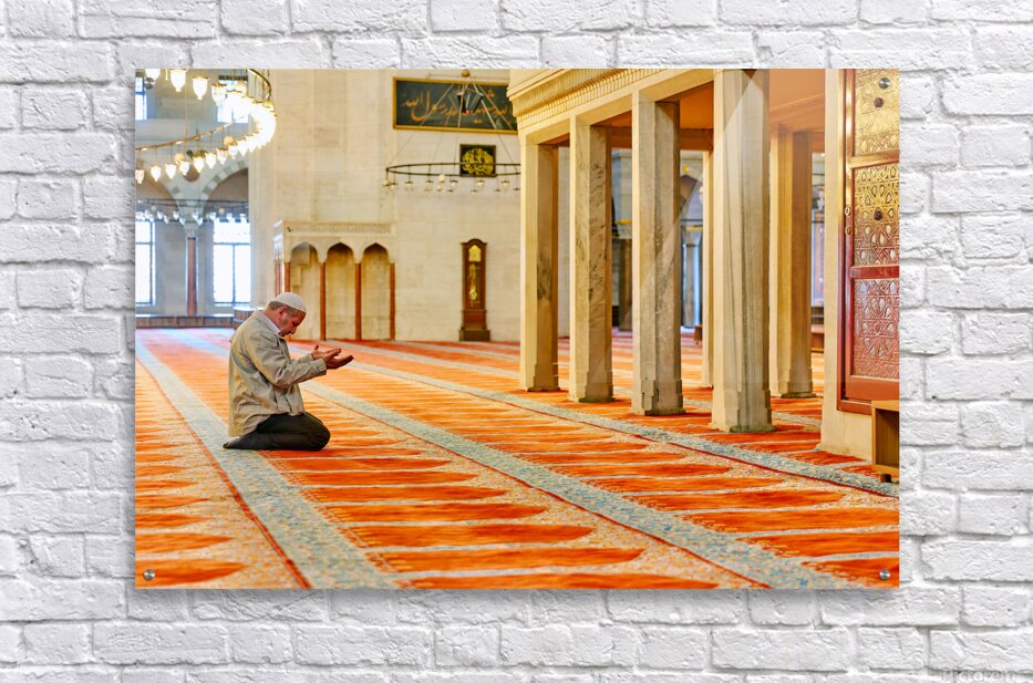 A person is praying on the orange carpet at Suleymaniye Mosque in Istanbul. The mosque has tall columns and soft lighting.