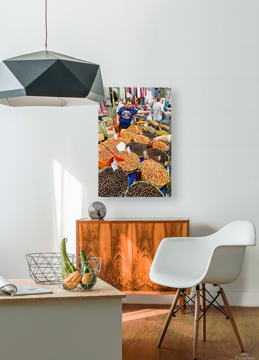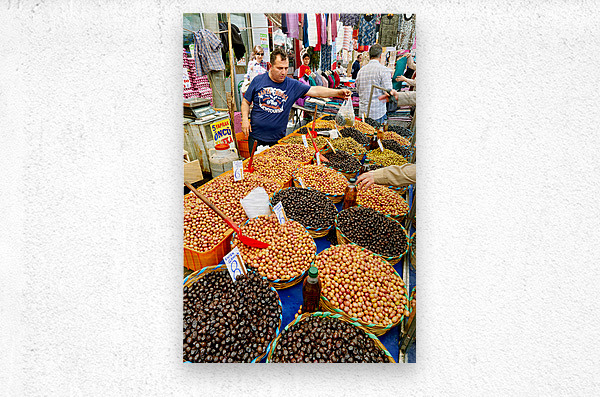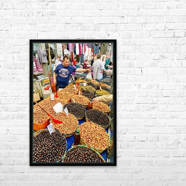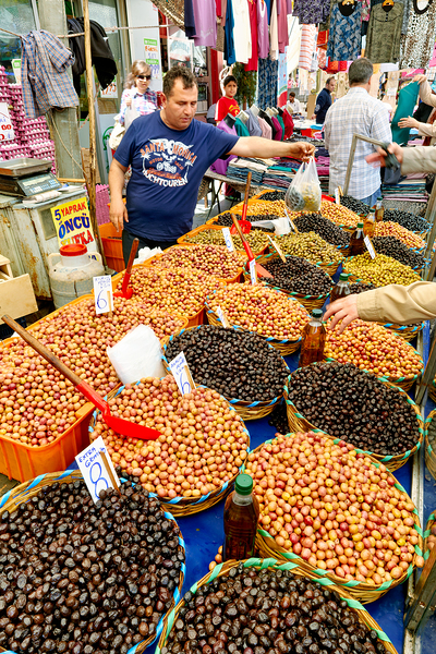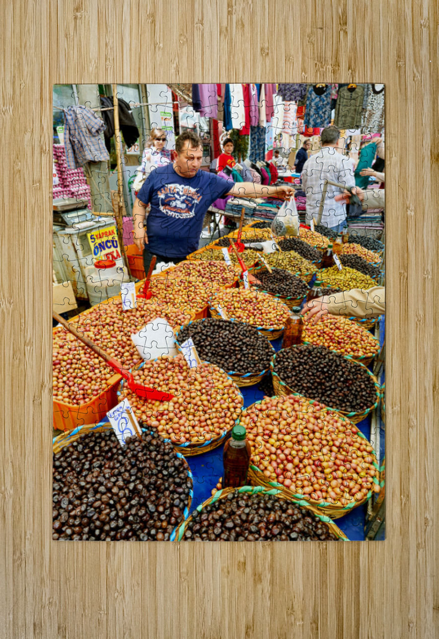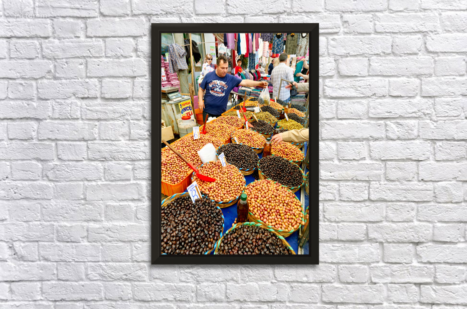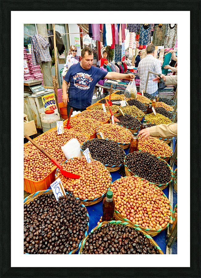 Market vendors gather in Istanbul selling local olives and other goods. People browse the stalls enjoying the lively atmosphere.