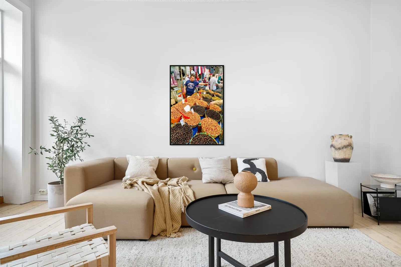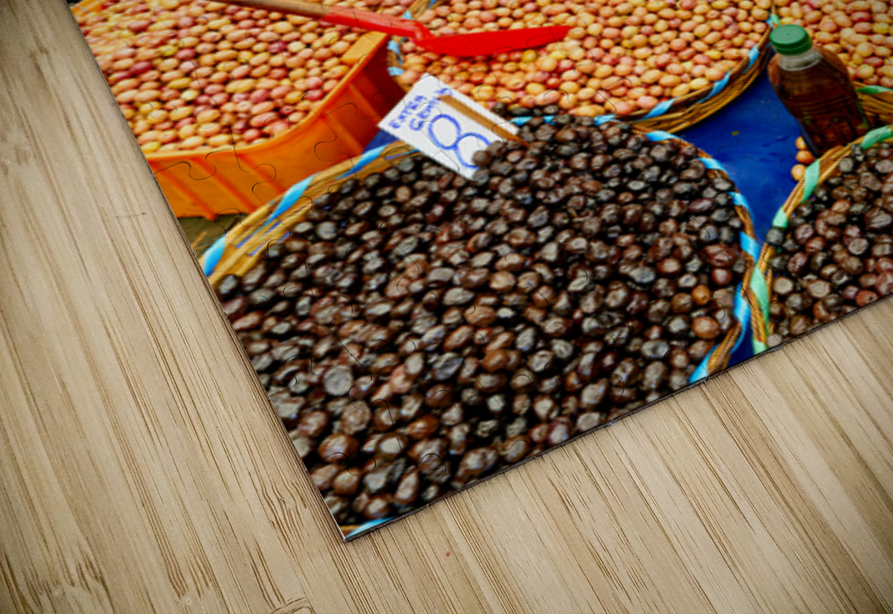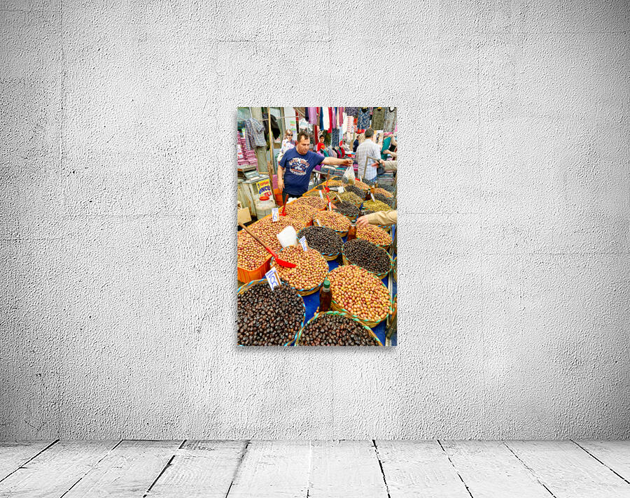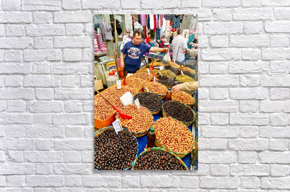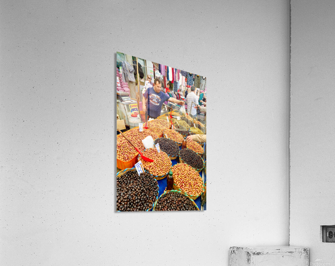 Market vendors gather in Istanbul selling local olives and other goods. People browse the stalls enjoying the lively atmosphere.