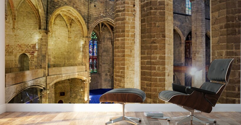 People explore the interior of Santa Maria del Mar church in Barcelona. The tall columns and stained glass windows attract visitors daily.