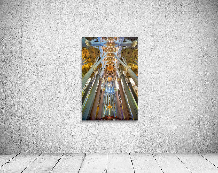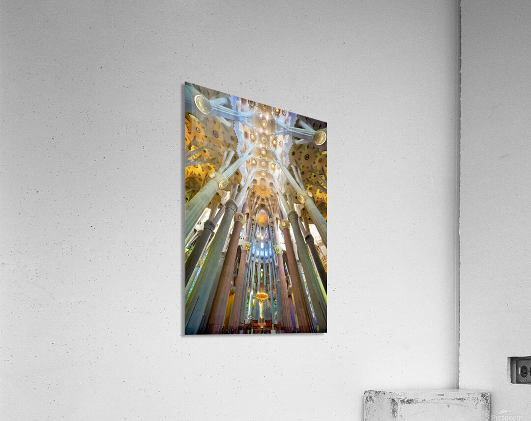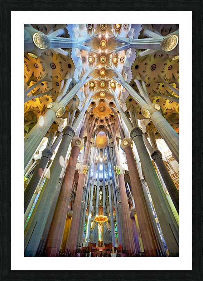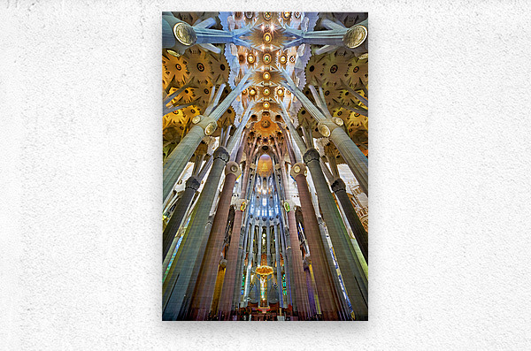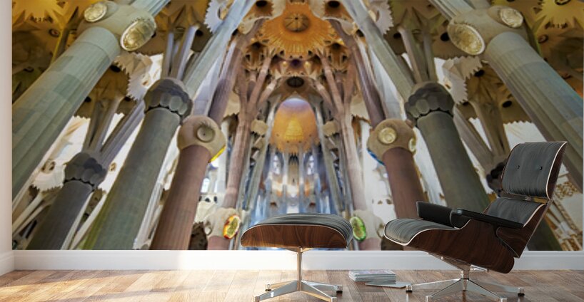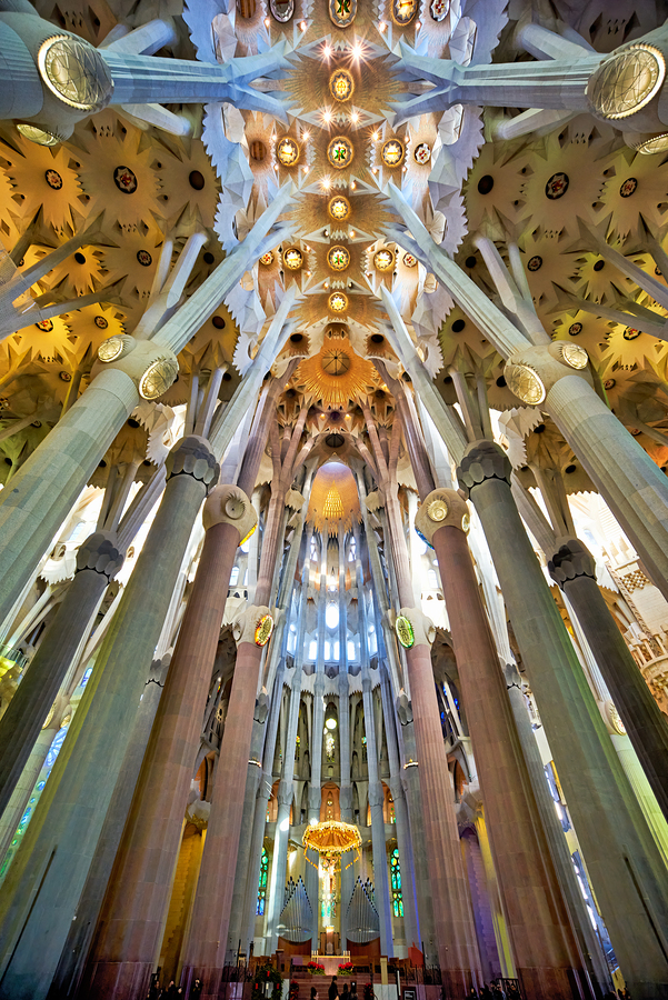 Visitors admire the intricate ceiling and columns inside Basílica de la Sagrada Família in Barcelona Catalonia Spain.