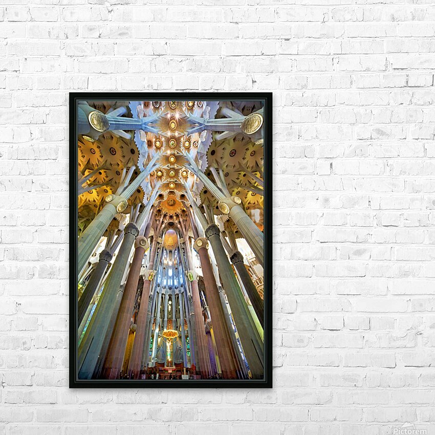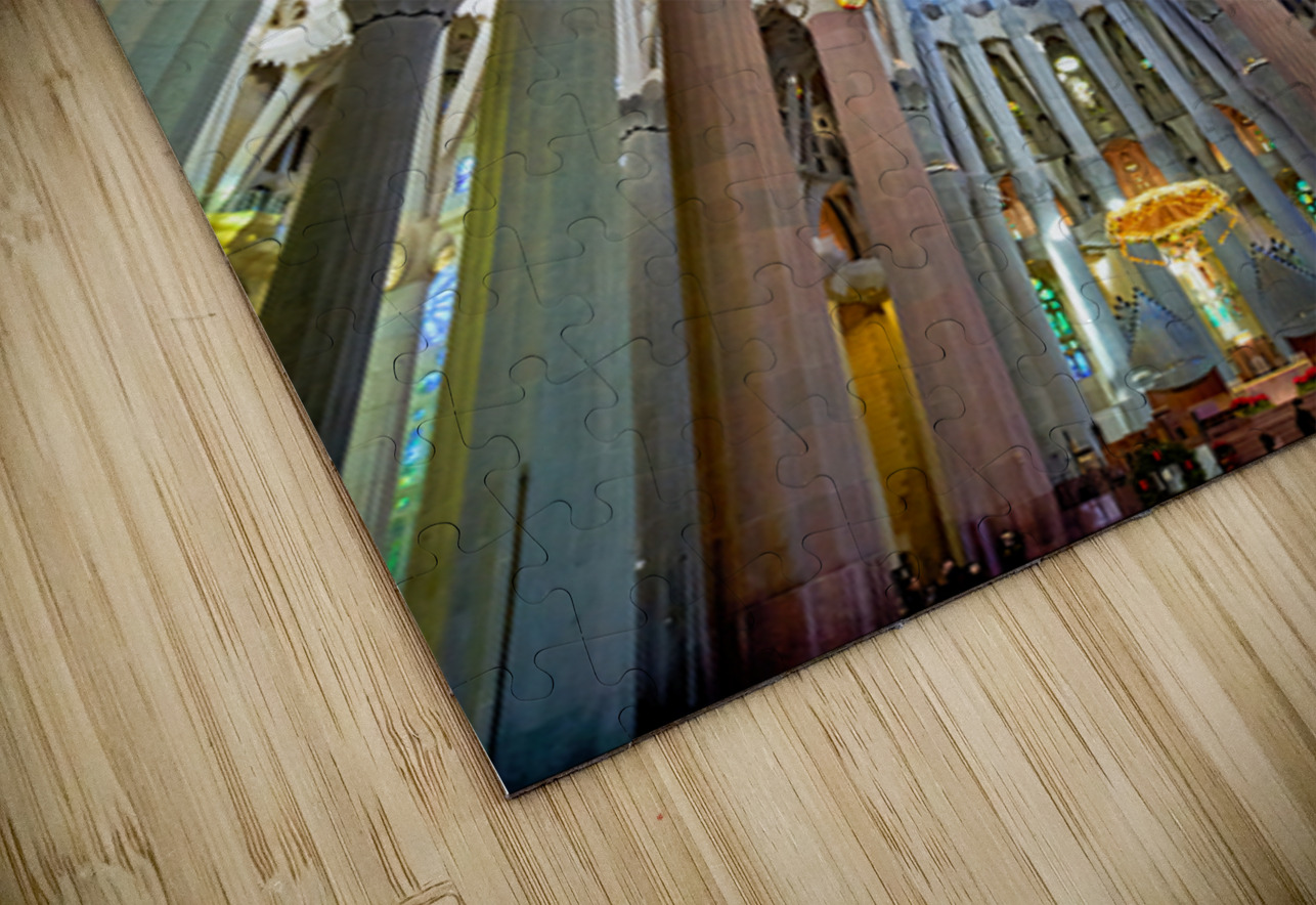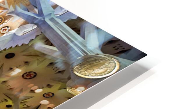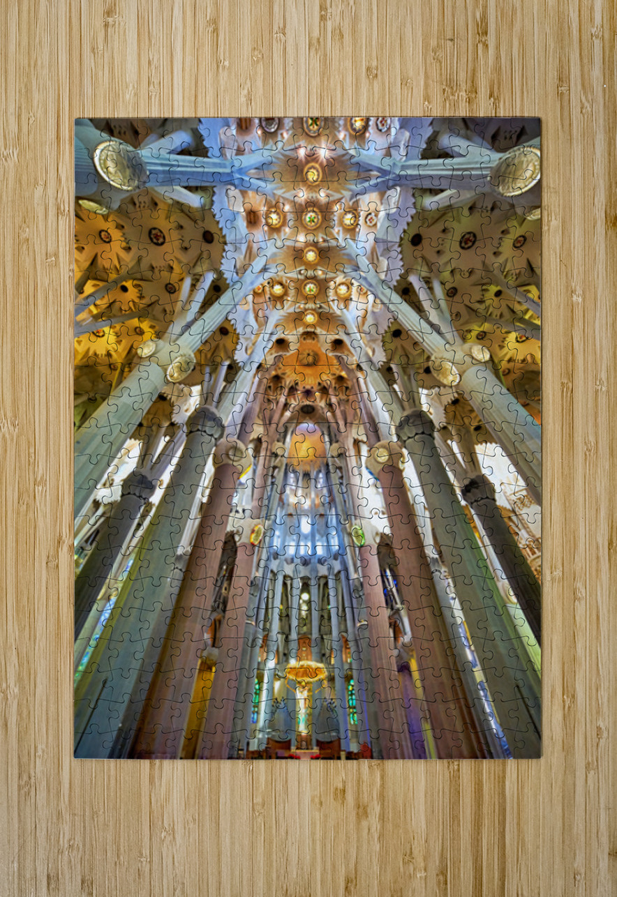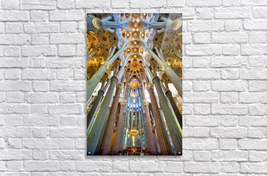 Visitors admire the intricate ceiling and columns inside Basílica de la Sagrada Família in Barcelona Catalonia Spain.