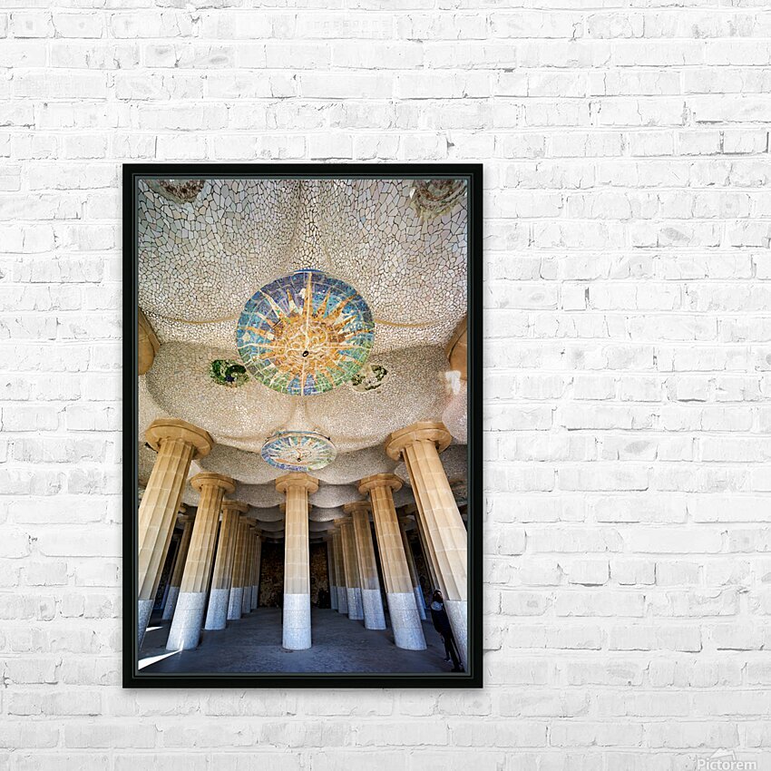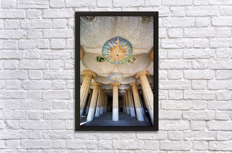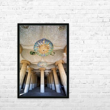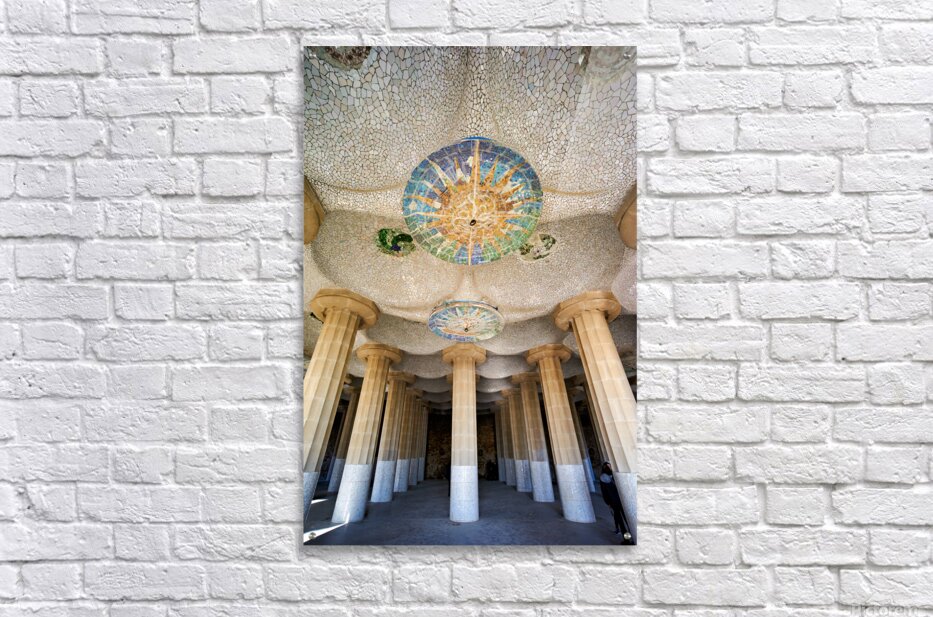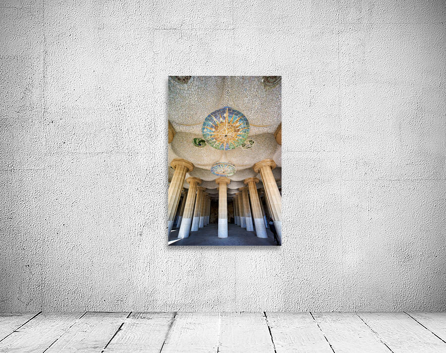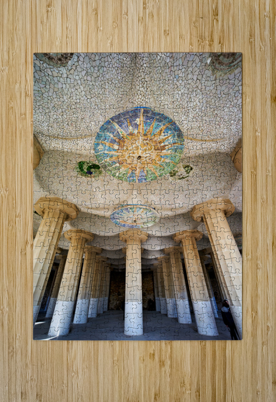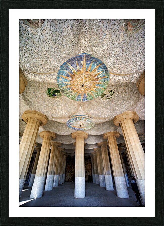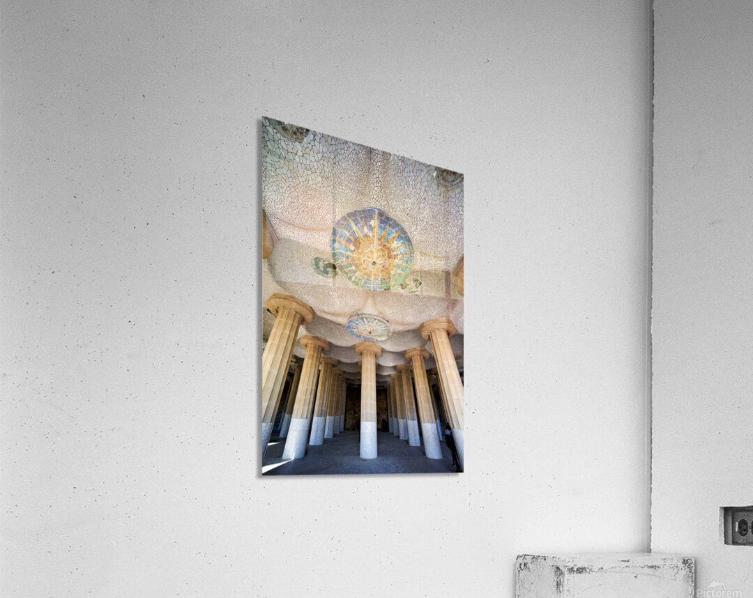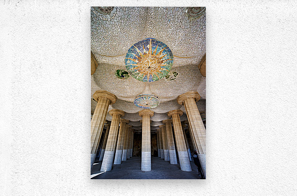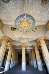 Visitors walk through the Hypostyle Room in Park Guell observing the unique columns and domes that define the space.