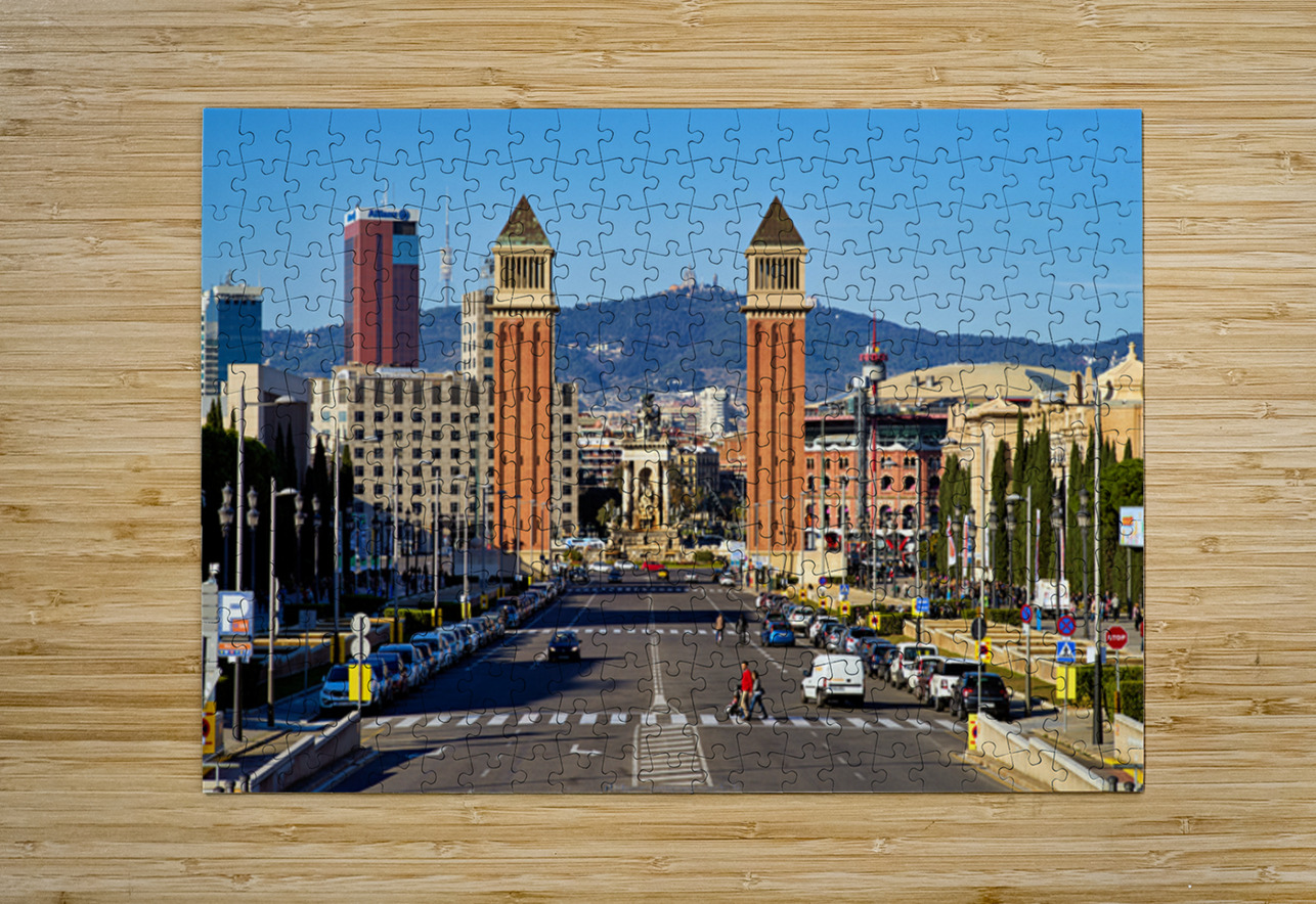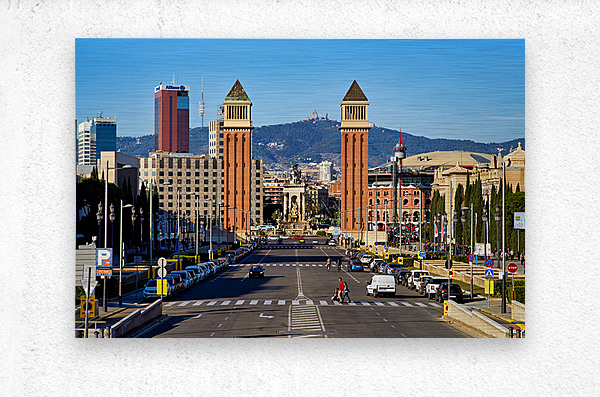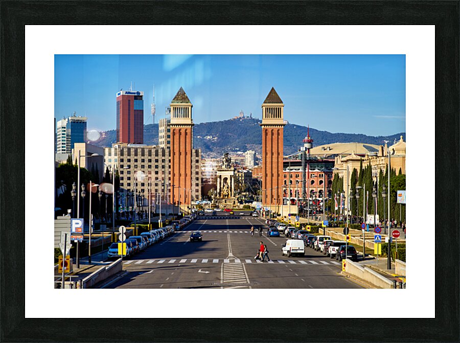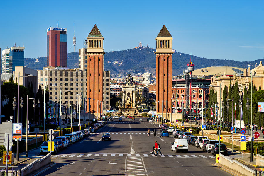 People walk and cars drive on the road in Plaza de Espana. Towers stand tall with a clear blue sky in the background.