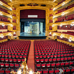 Gran Teatre del Liceu in Barcelona shows rows of empty seats in the main hall. The stage is set for an upcoming opera performance.