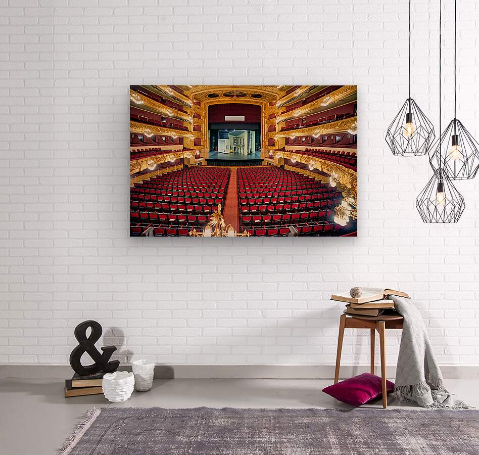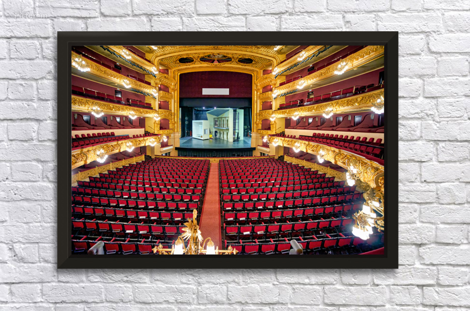 Gran Teatre del Liceu in Barcelona shows rows of empty seats in the main hall. The stage is set for an upcoming opera performance.