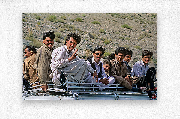 ABOUT THIS ARTWORK: GROUP TRAVELING ON TOP OF A VAN IN PAKISTANS MOUNTAINS
