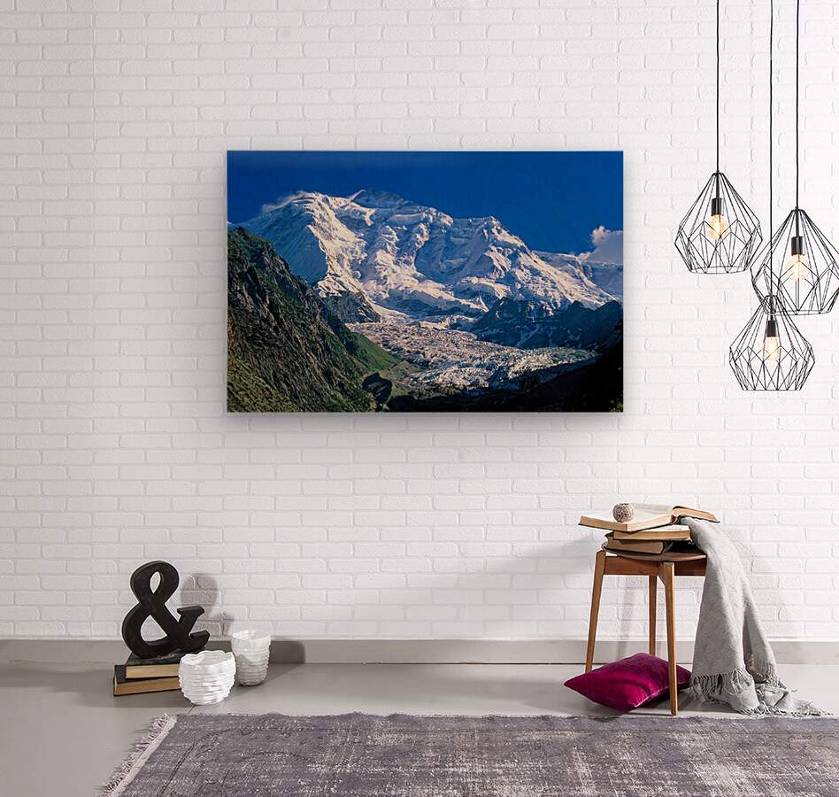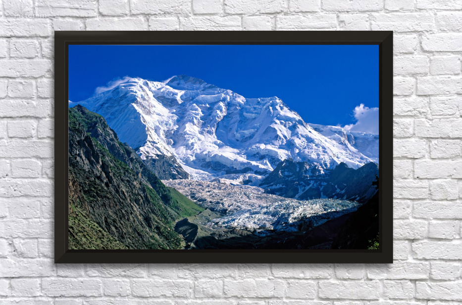 "Karakoram range shows snow capped peaks and rocky terrain" in a framed print.