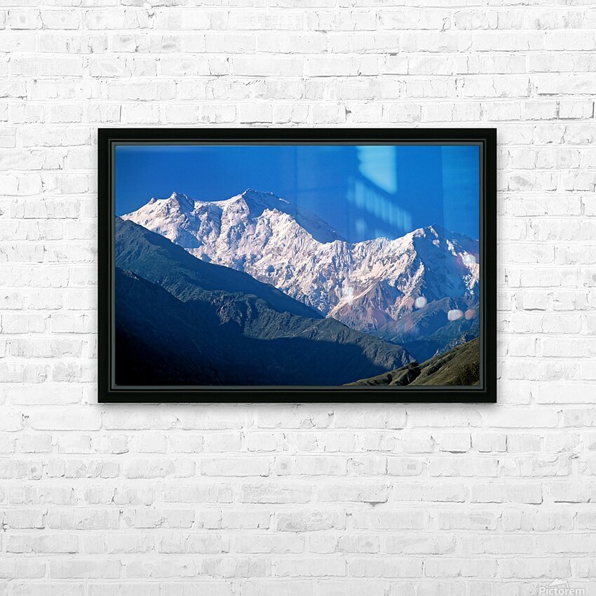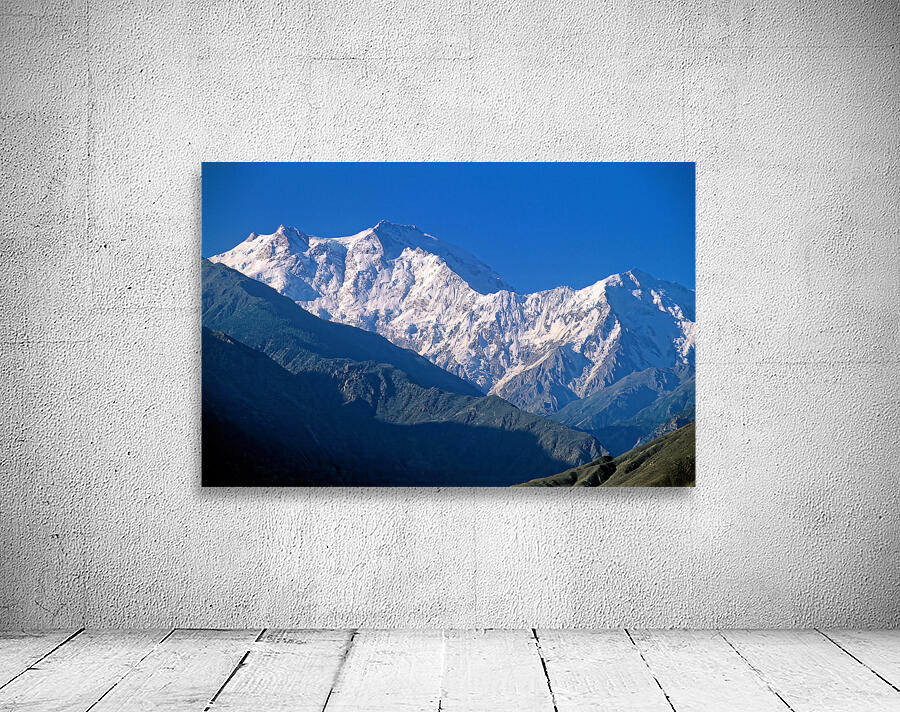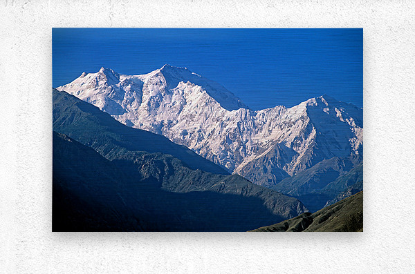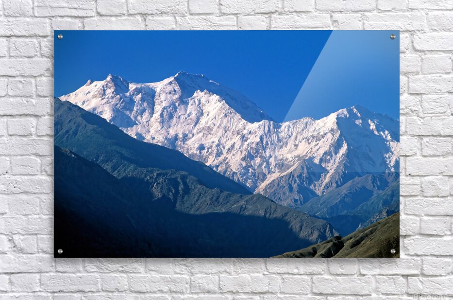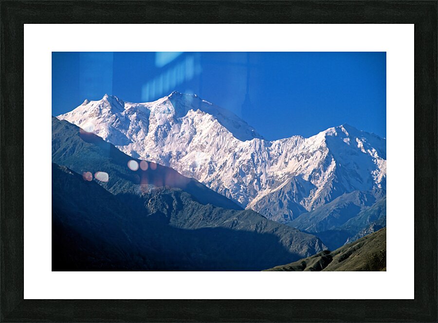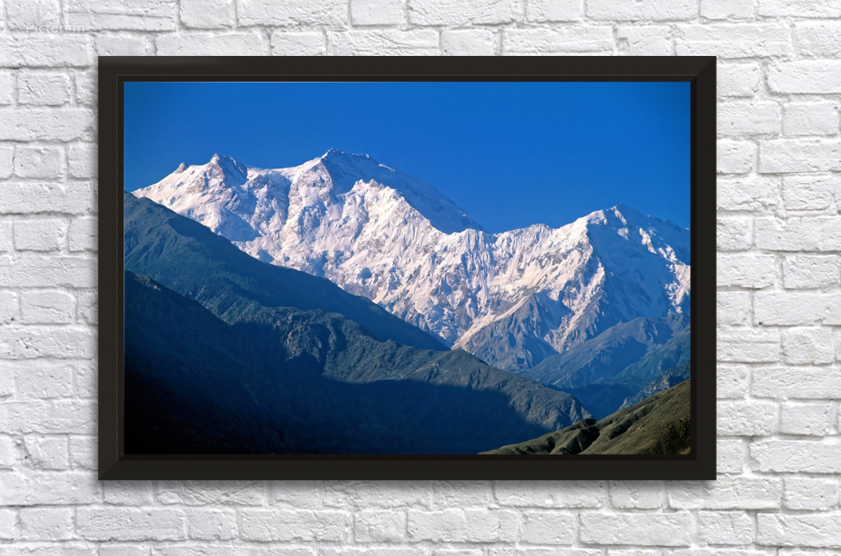 "Snow covered peaks in the Karakoram range of Pakistan" in a framed print.