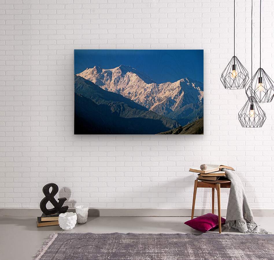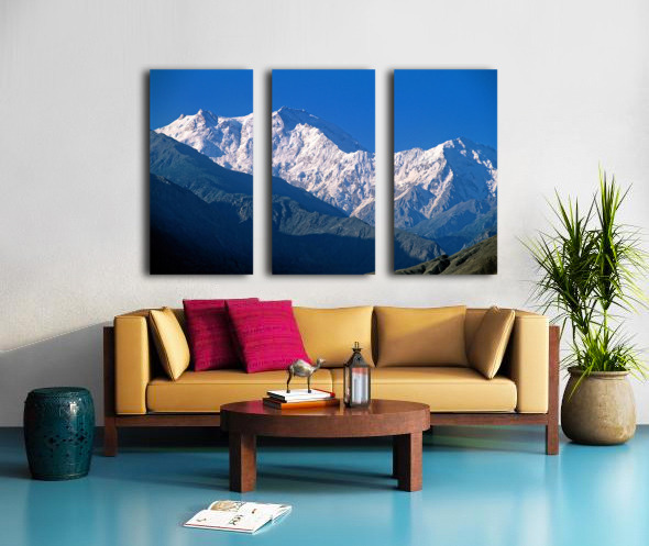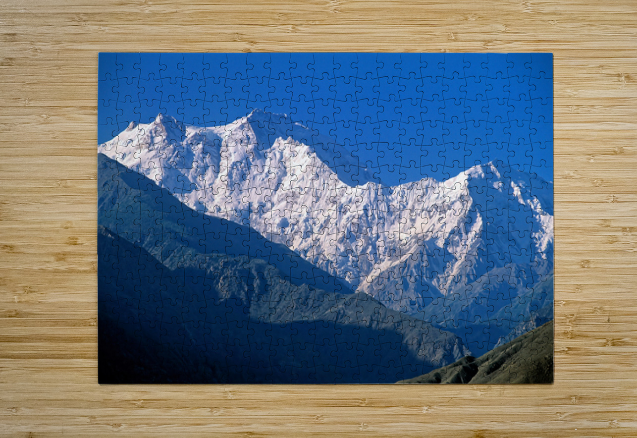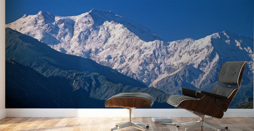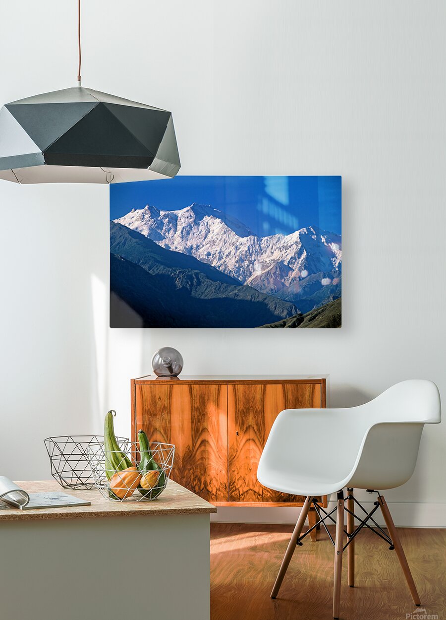 "Snow covered peaks in the Karakoram range of Pakistan" in a framed print.
