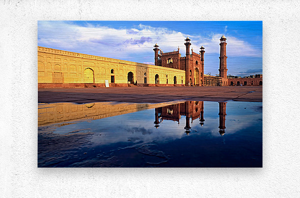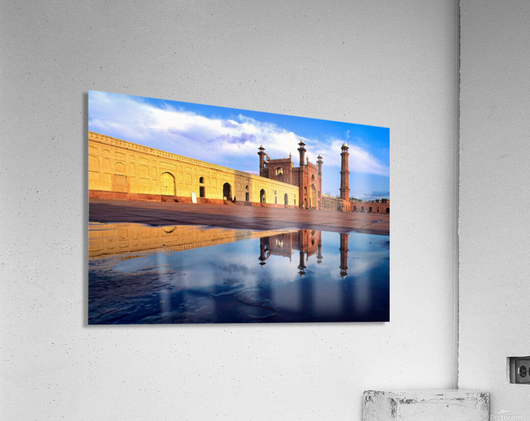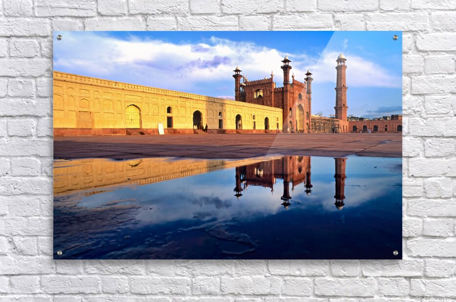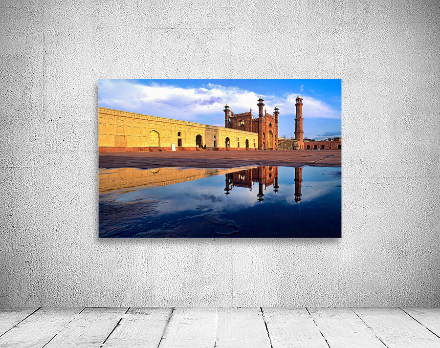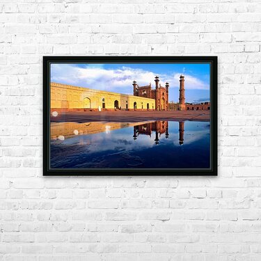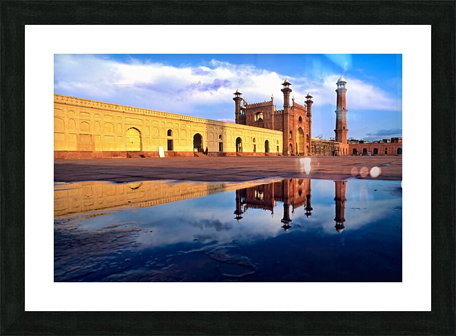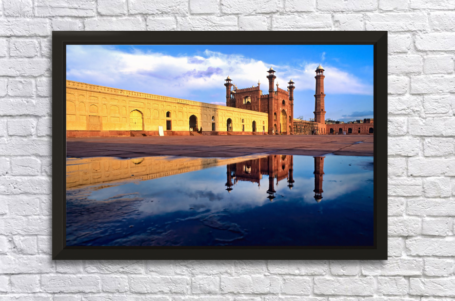 "Badshahi Mosque reflects in water at Lahore Pakistan" in a framed print.