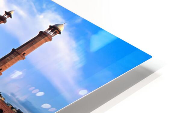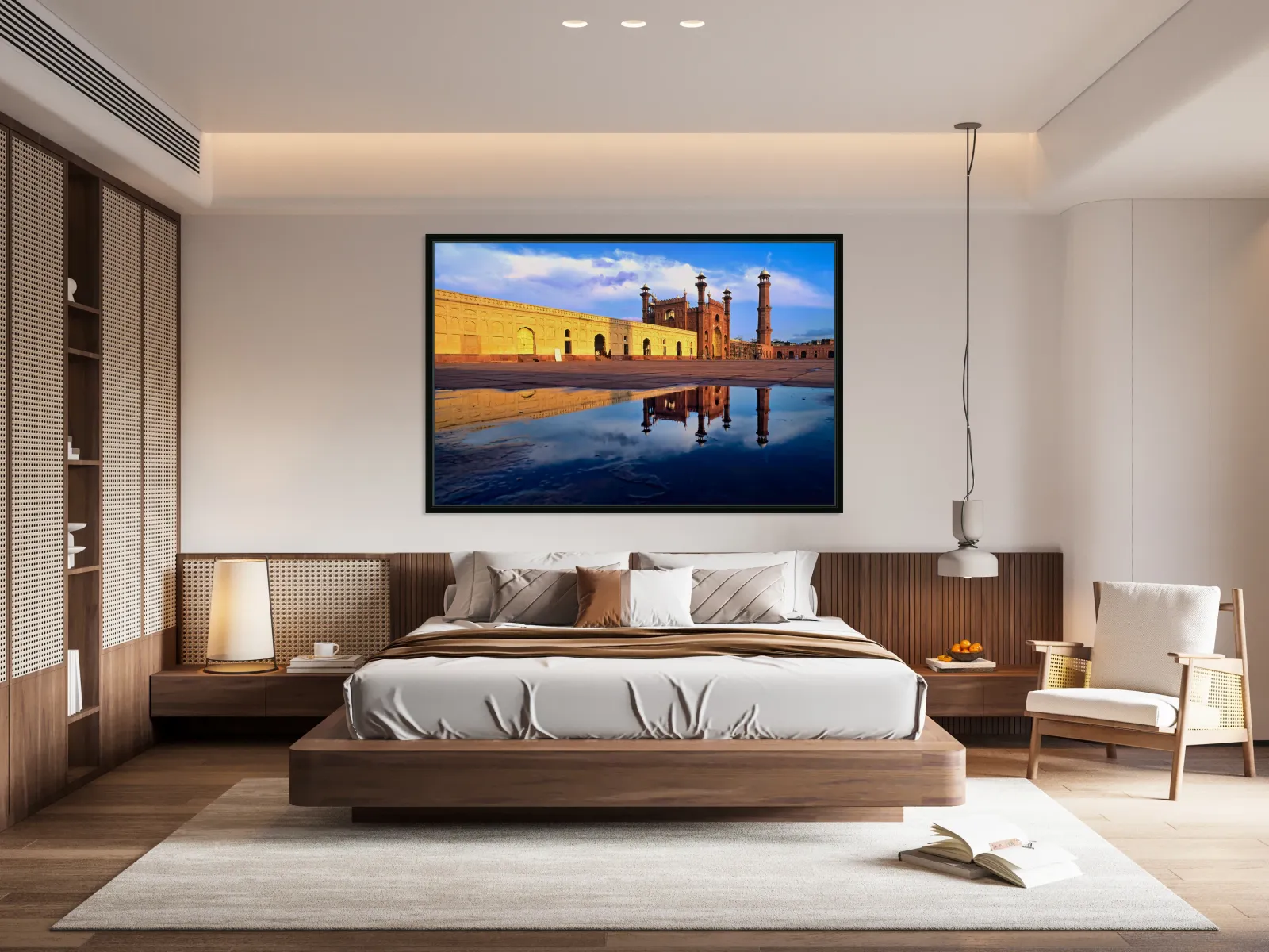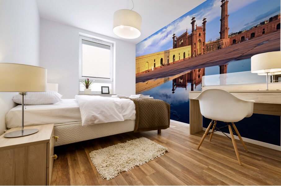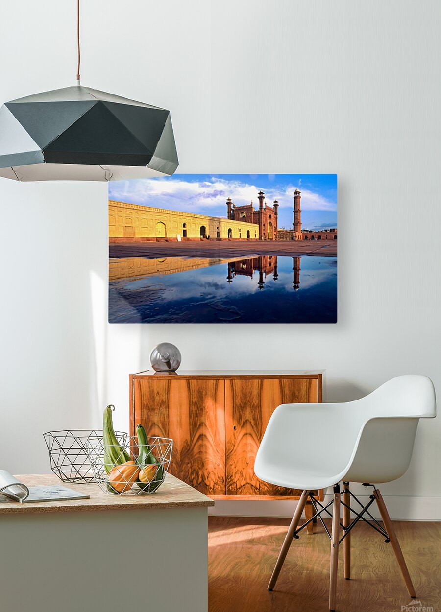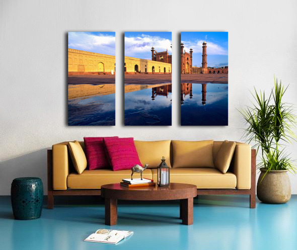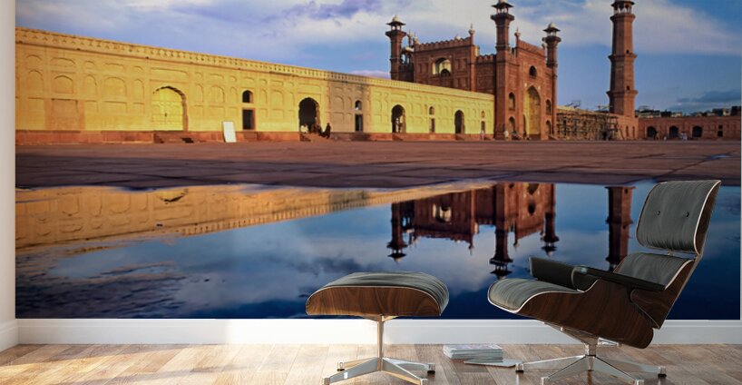 "Badshahi Mosque reflects in water at Lahore Pakistan" in a framed print.