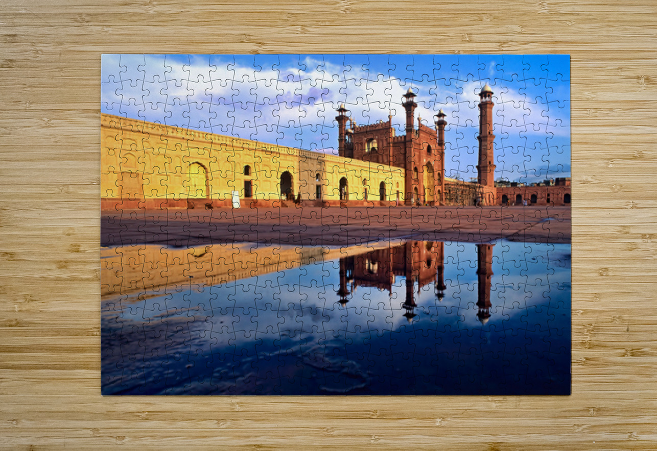 Badshahi Mosque in Lahore shows its tall minarets and rich architecture in the water puddle. People walk in the courtyard during the day.