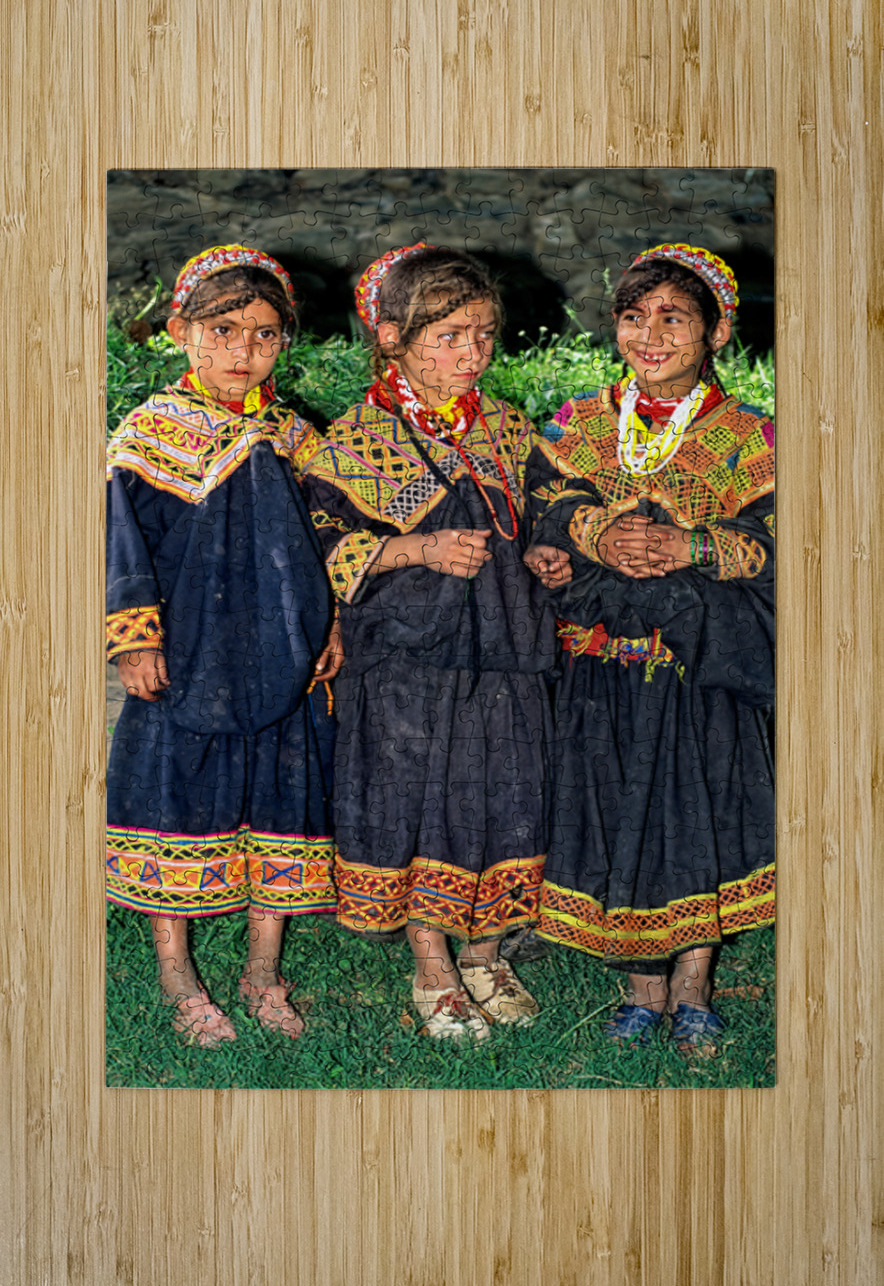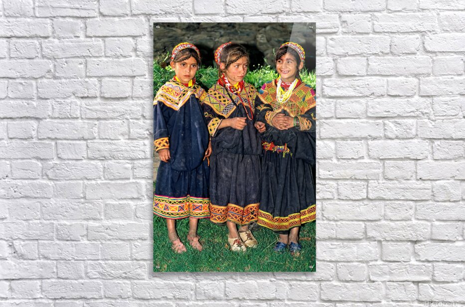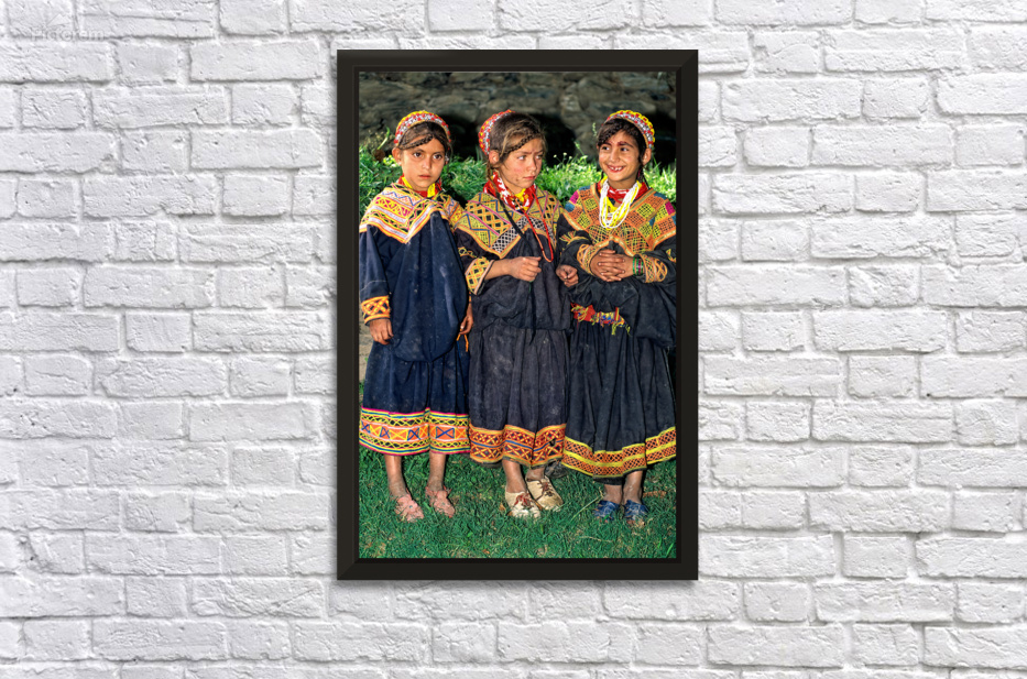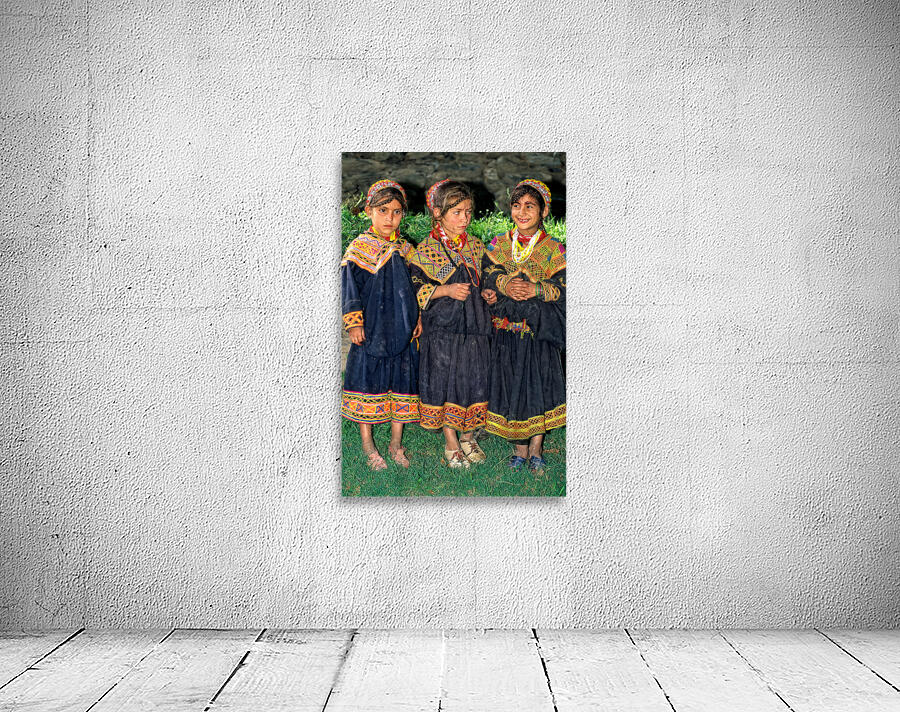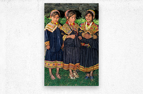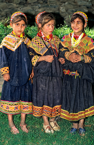 Three young girls stand together in traditional attire in a Kalash village. They are smiling and enjoying their time.