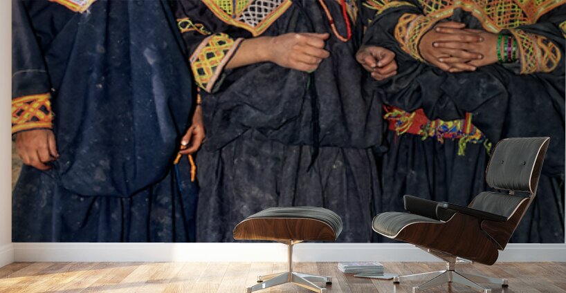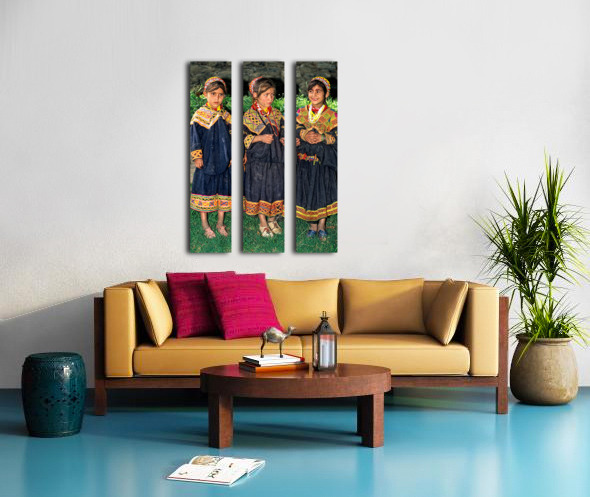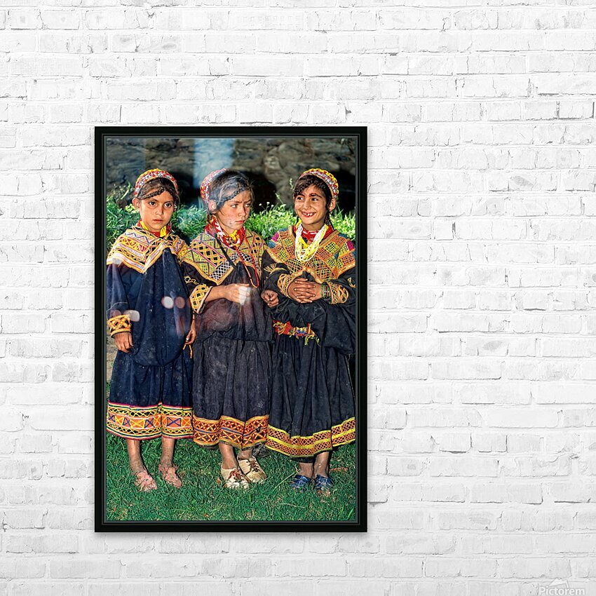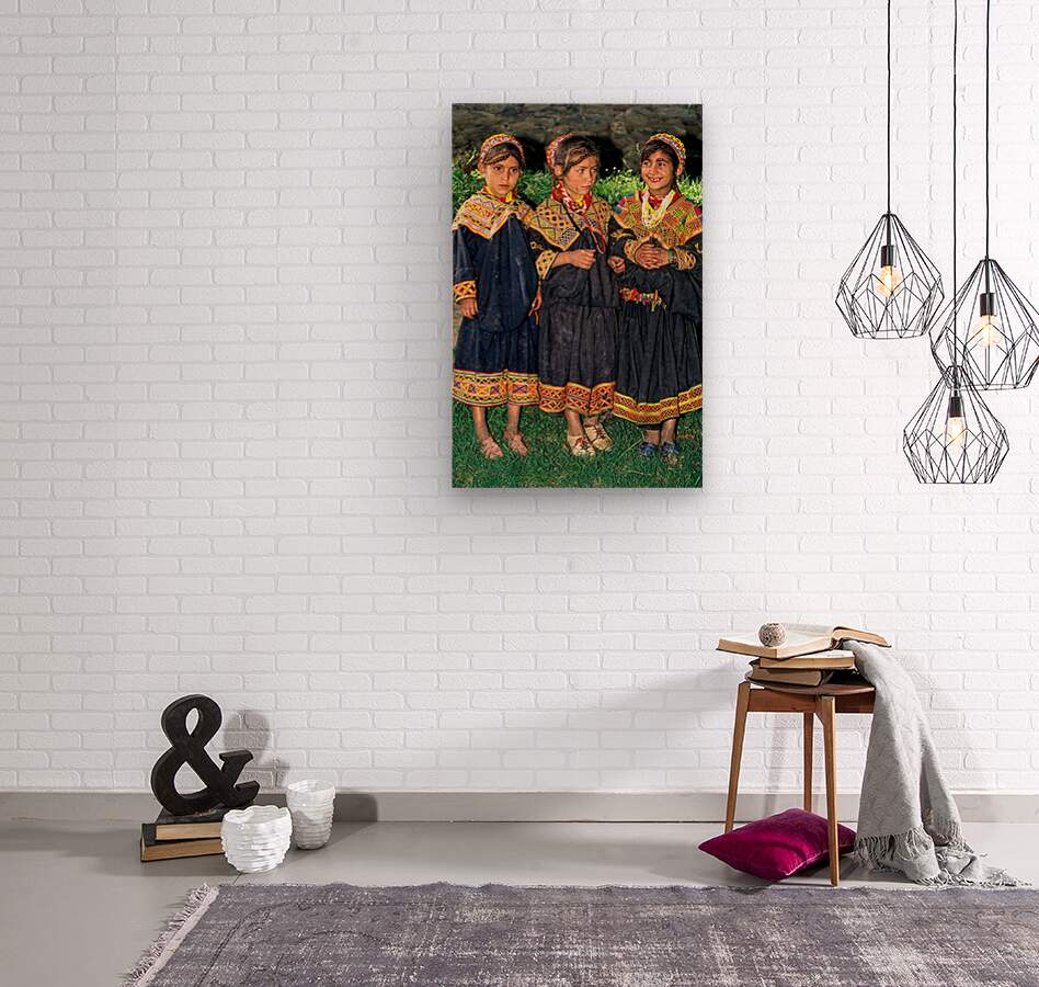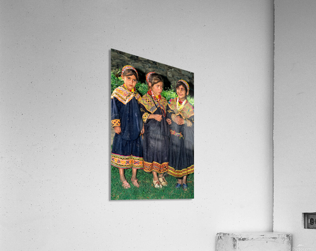 Three young girls stand together in traditional attire in a Kalash village. They are smiling and enjoying their time.
