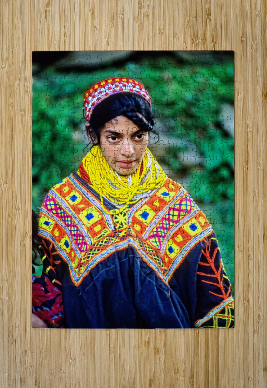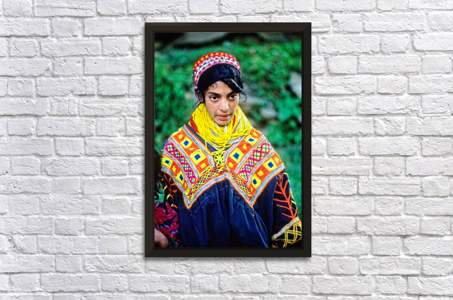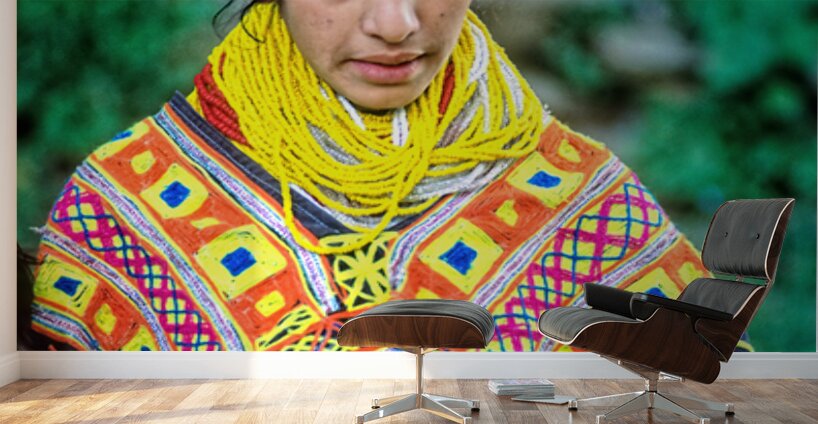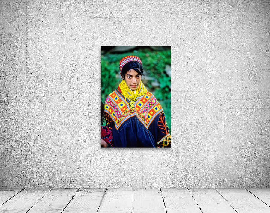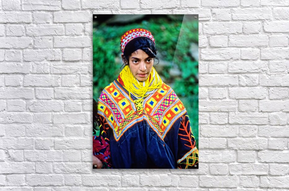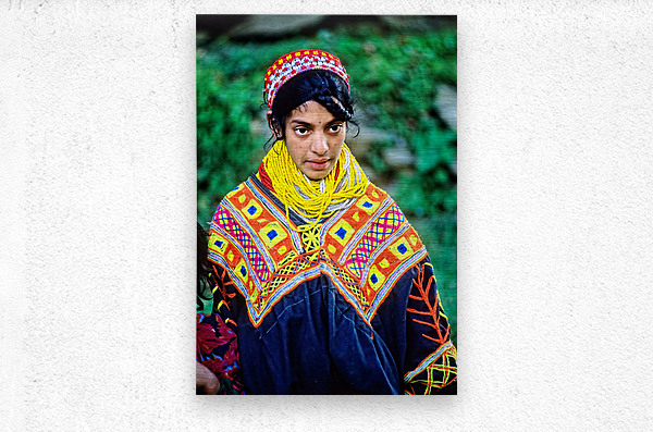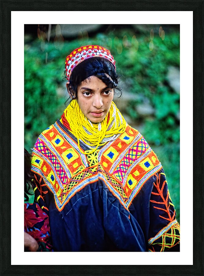 A young woman stands wearing traditional dress in a Kalash village. Bright patterns adorn her clothes as she interacts with her surroundings.