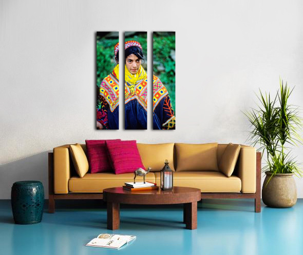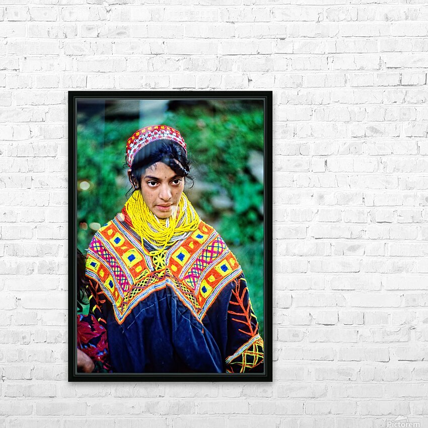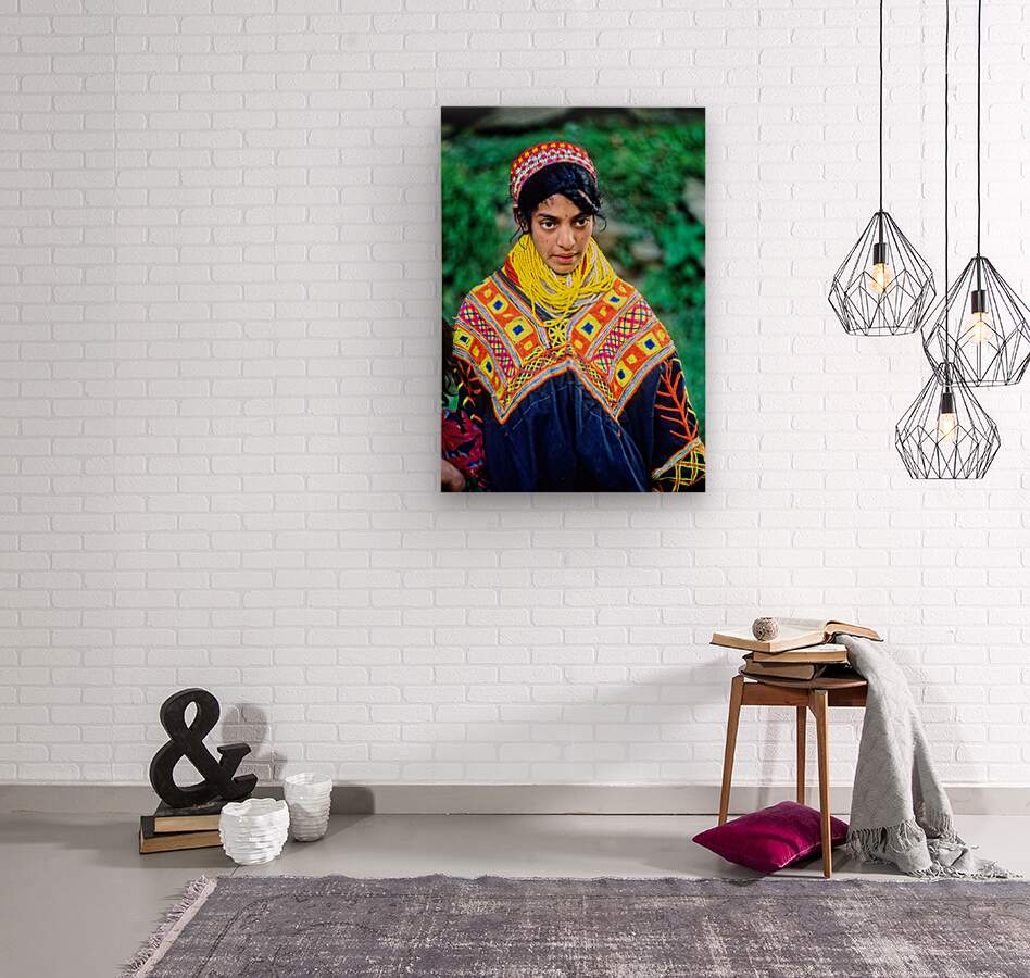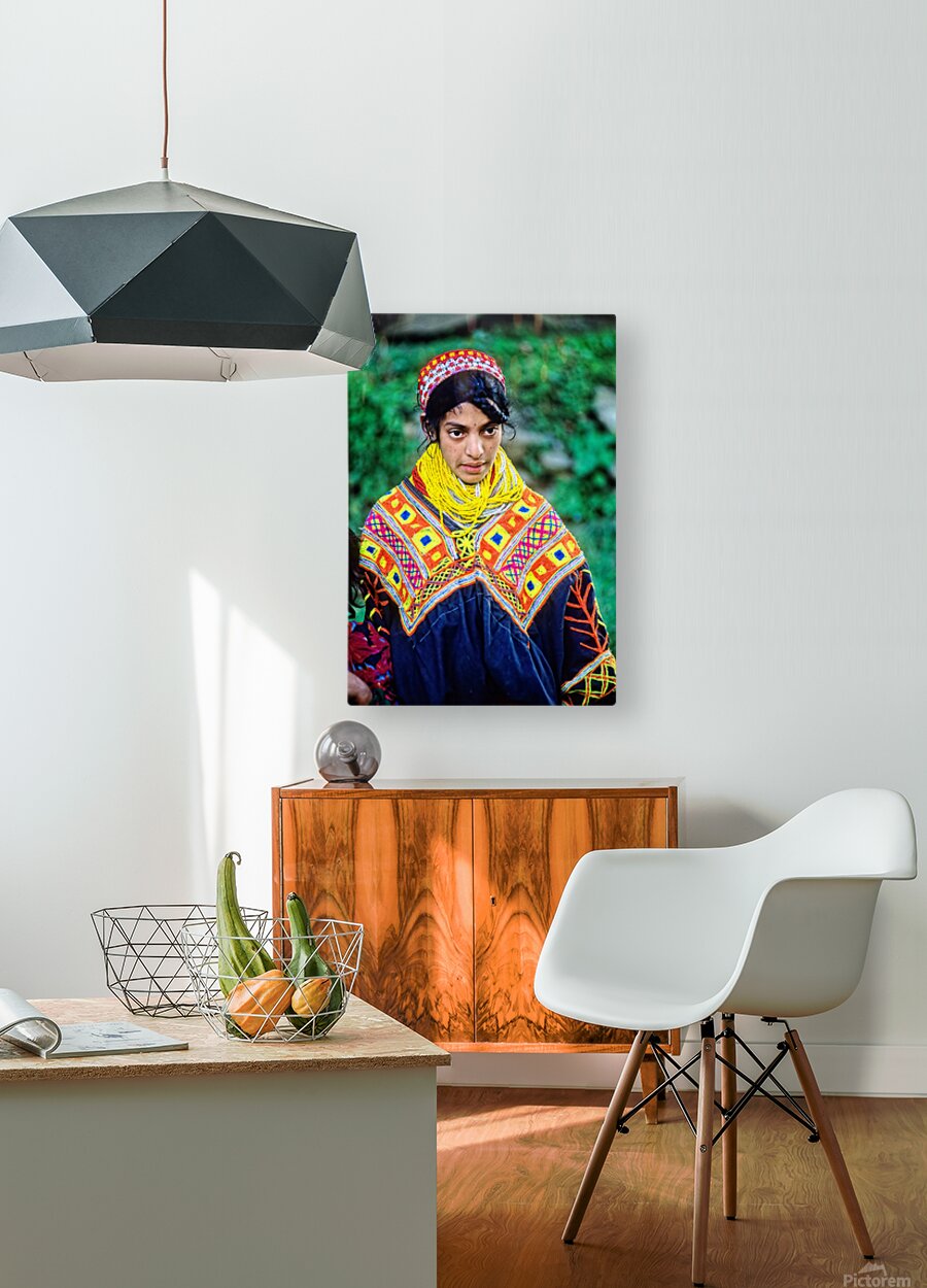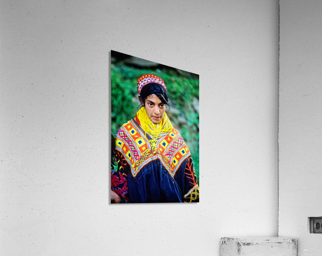 A young woman stands wearing traditional dress in a Kalash village. Bright patterns adorn her clothes as she interacts with her surroundings.