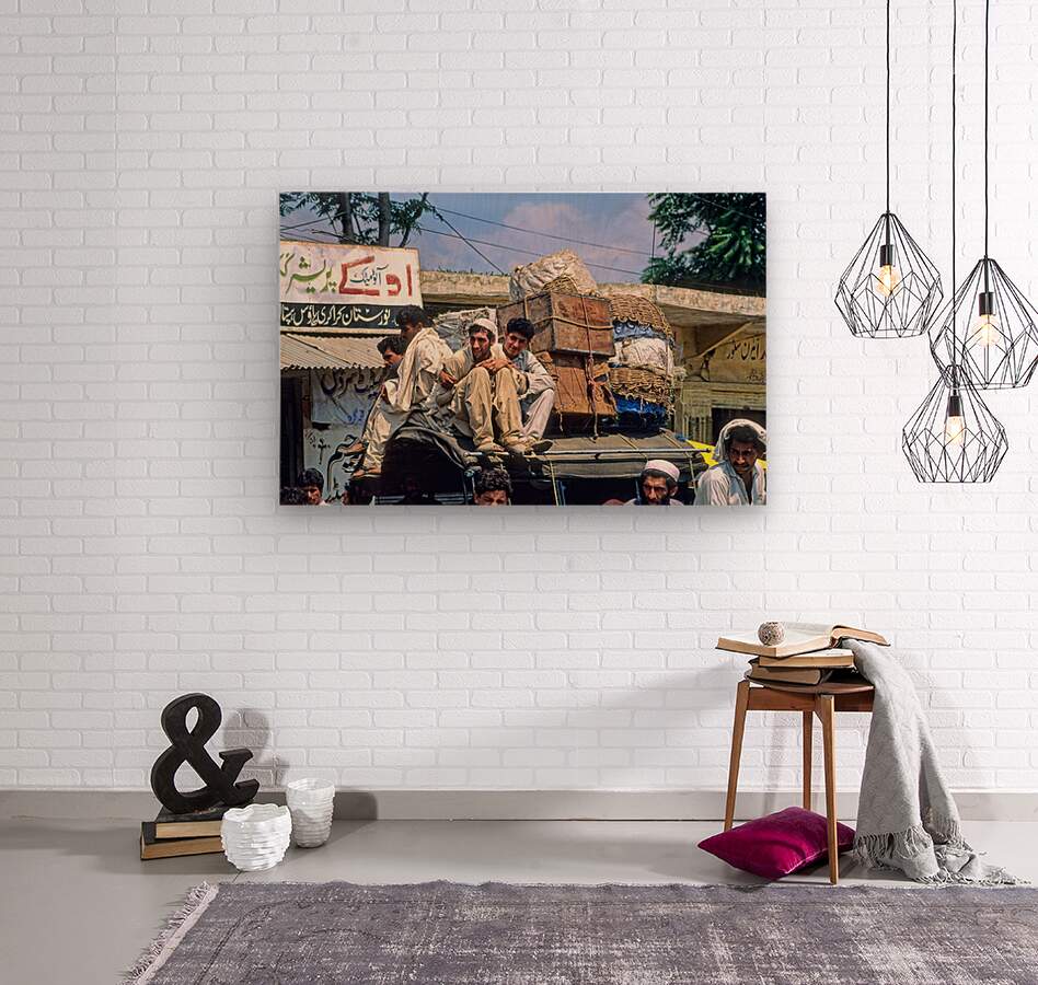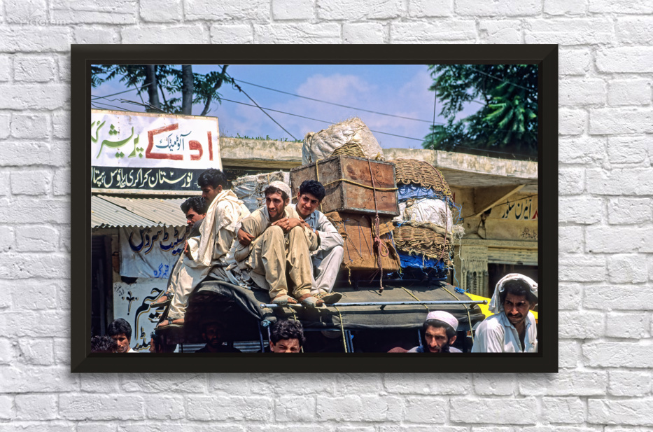 Groups of men sit on top of a loaded vehicle while others move around on the street in Peshawar Pakistan during the daytime.