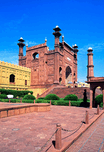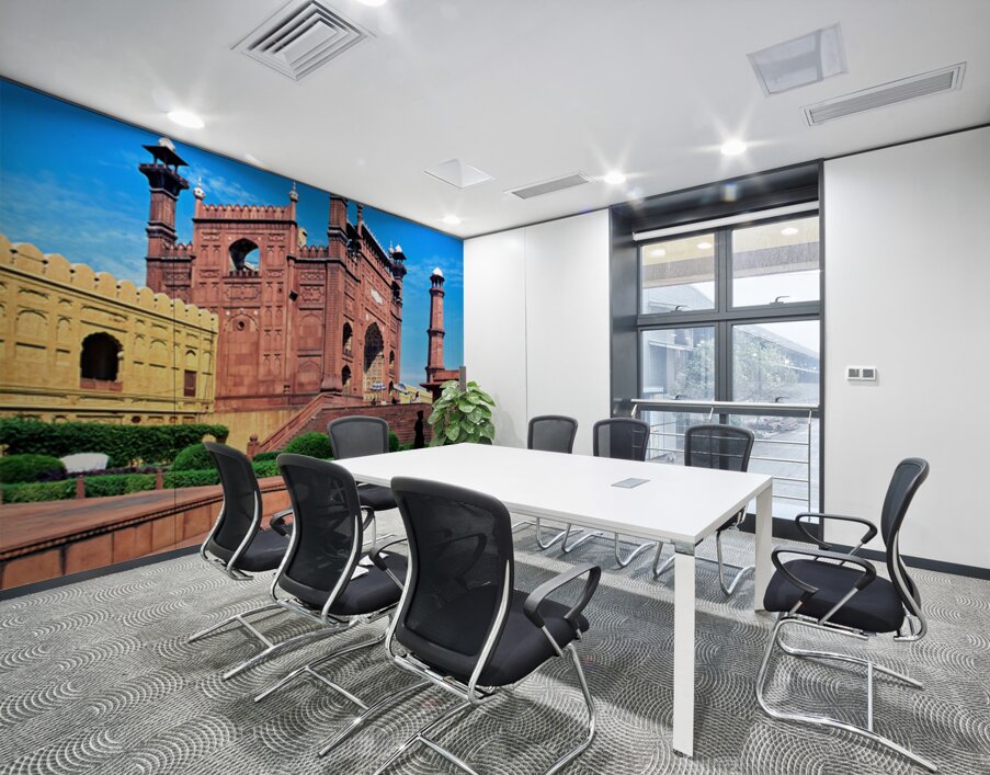 MOSQUE STANDS TALL IN LAHORE WITH CLEAR BLUE SKY ABOVE