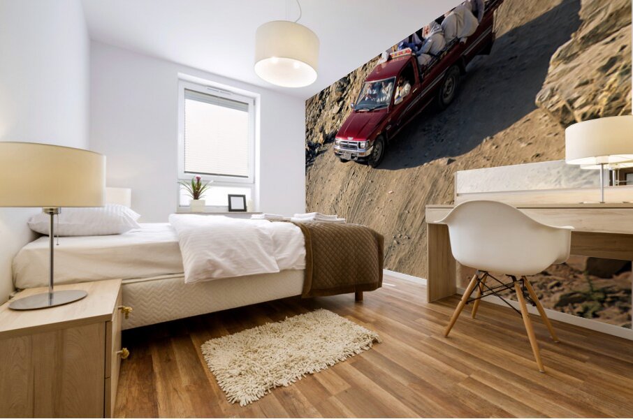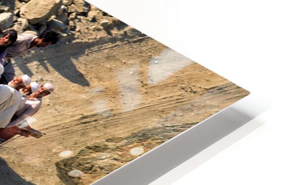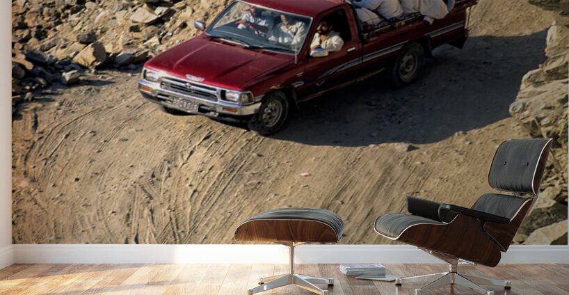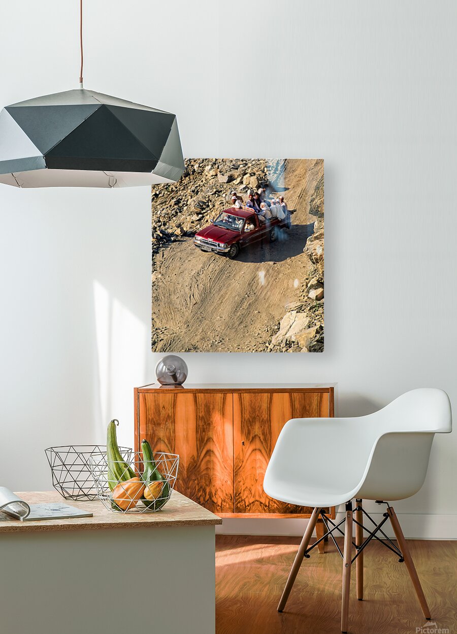 Travelers on gravel road near Shandur Pass in Pakistan Wood print