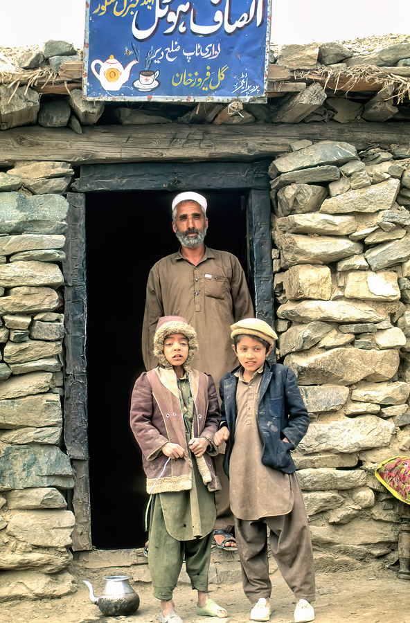 FAMILY NEAR SHOP AT SHANDUR PASS IN PAKISTAN