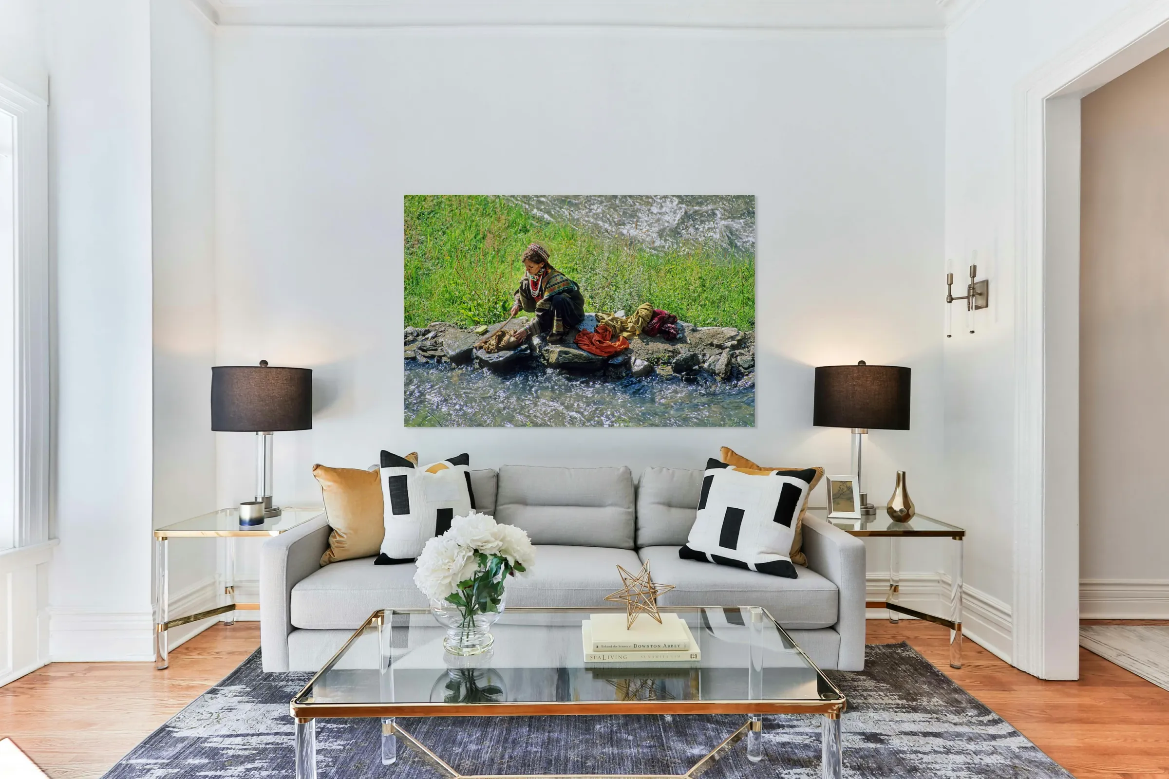 A woman washes clothes by a river in Bumburet Valley Pakistan. She sits on rocks and is surrounded by vibrant greenery and colorful fabrics.